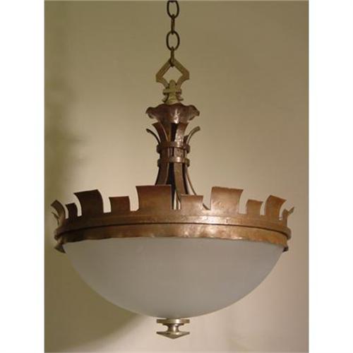 Circa 1920 Wrought & hammered iron chandelier with frosted glass shade.Please email us if you would like additional photos or more information.Thanks antique lighting gallery.