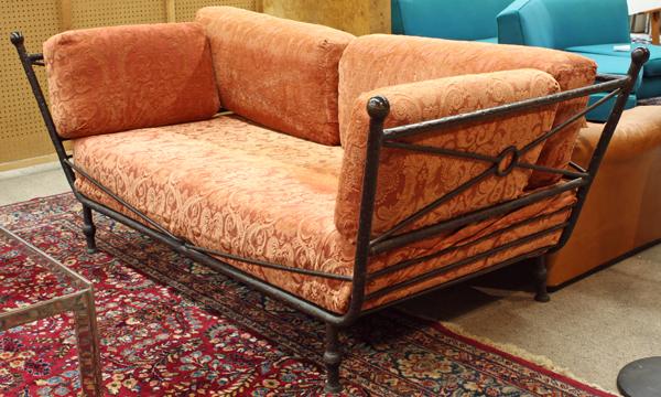 Wrought metal sofa, having a Classical style patinated frame supporting the loose drop in cushions upholstered with brocade fabric, 33''h x 79''l x 43''d