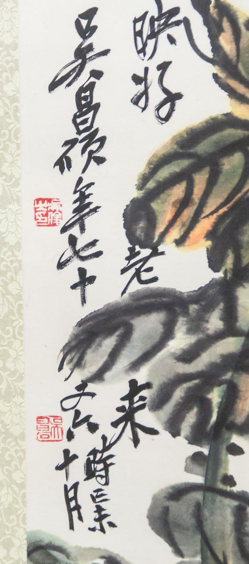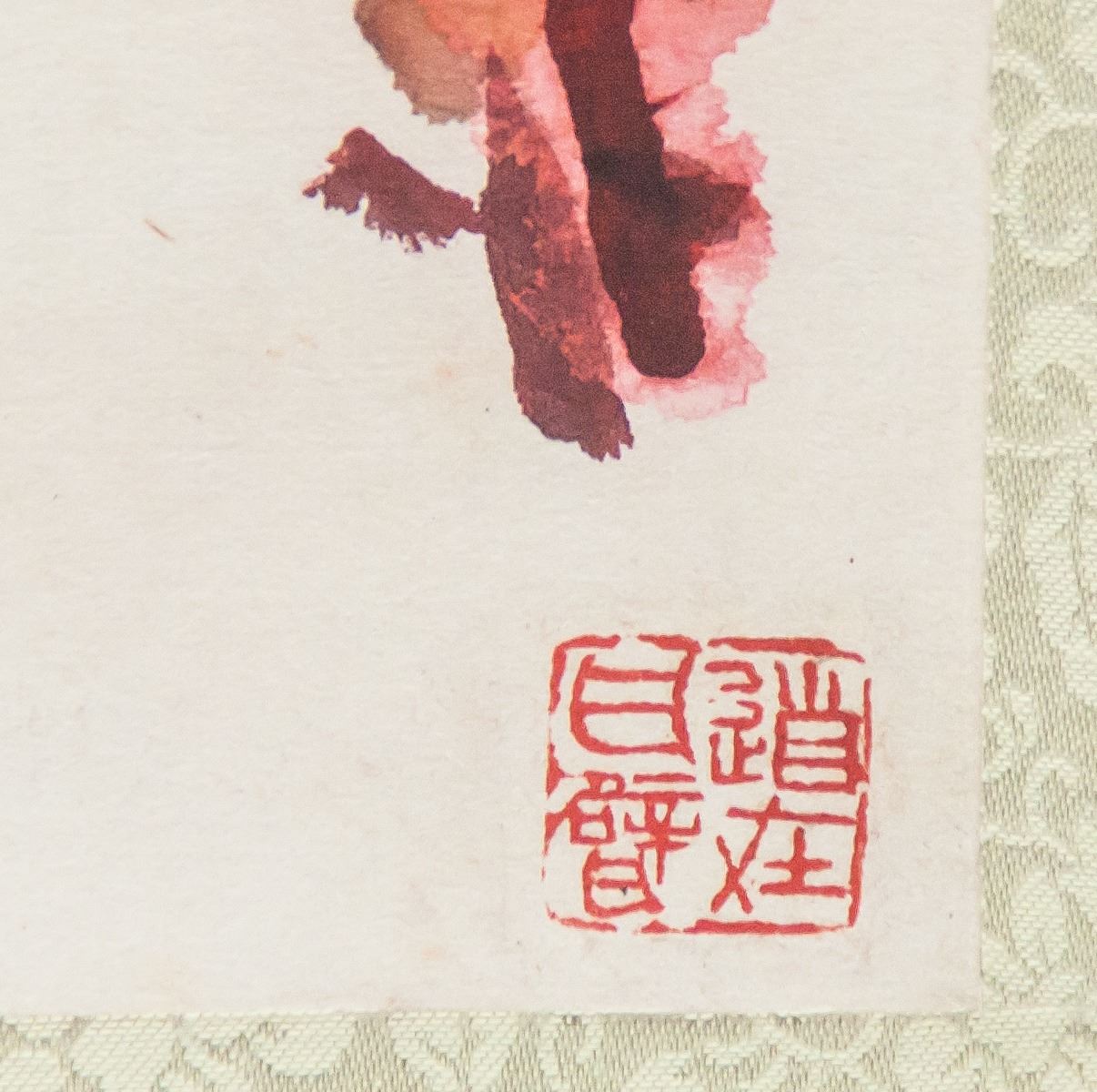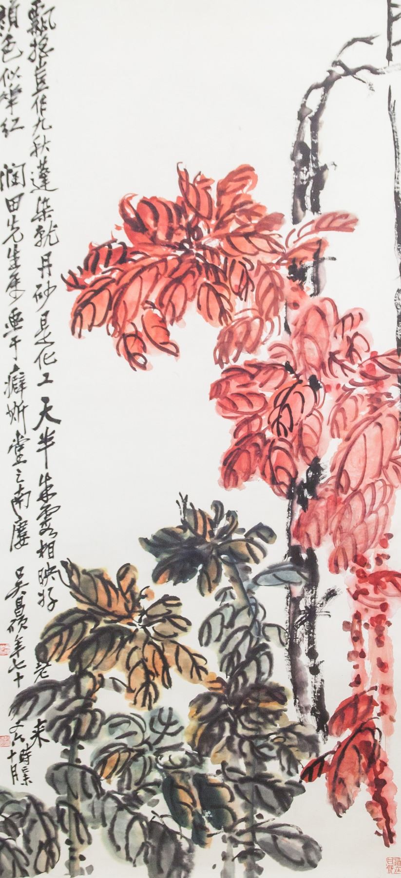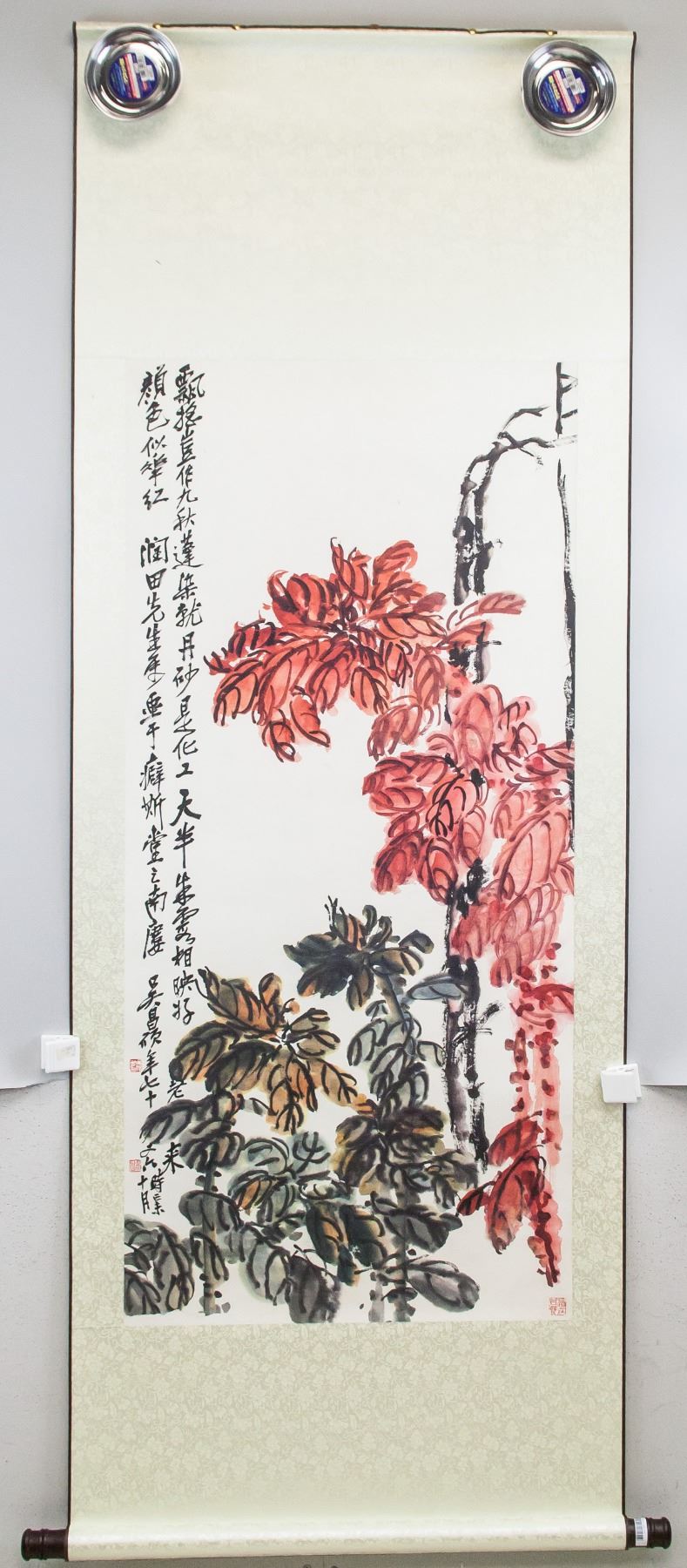 Chinese print on hanging scroll. Featuring autumn leaves. "Wu Shaoshuo" printed to the side along with three seals. 108 x 51 cm