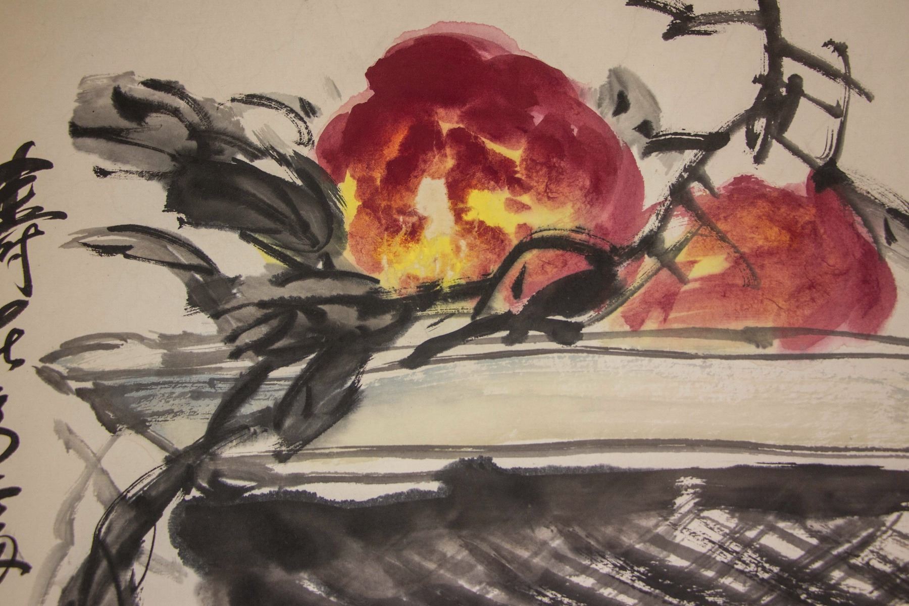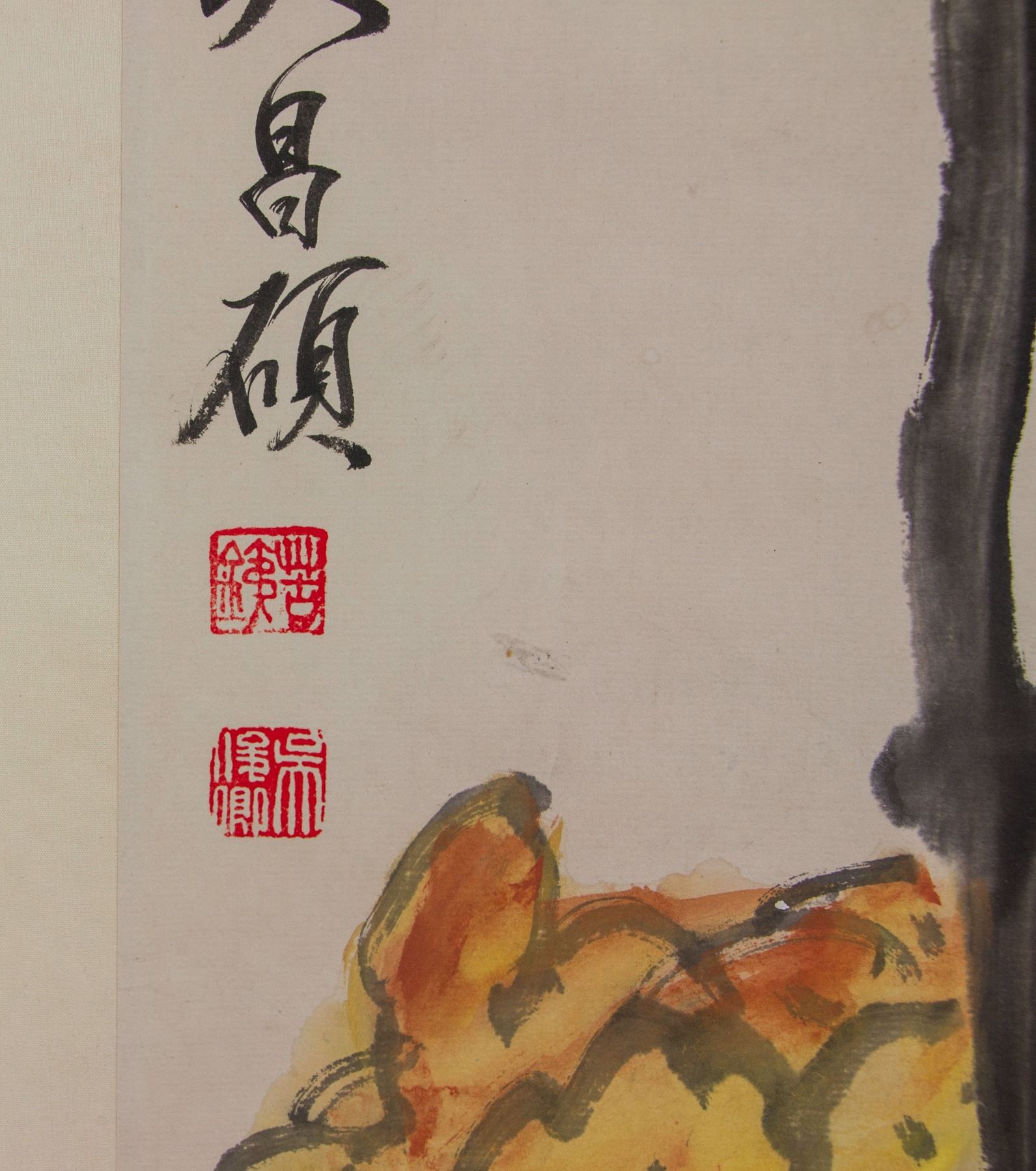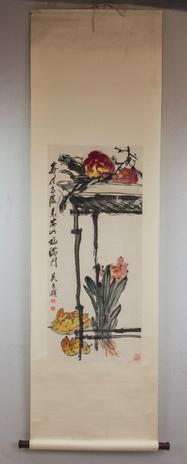 Still life painting of various fruits; Chinese ink and watercolour on paper; hanging scroll; signed Wu Changshuo (1844-1927); inscribed with 3 artist seals; 91 cm x 27 cm