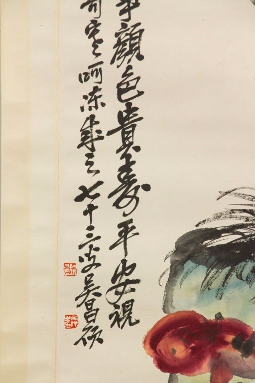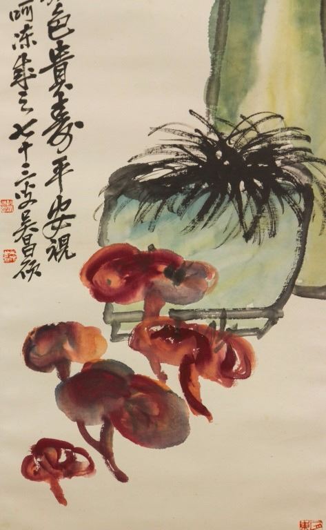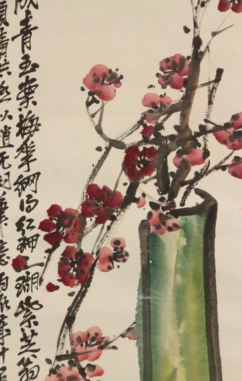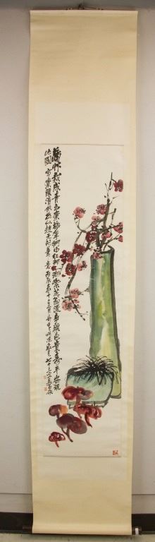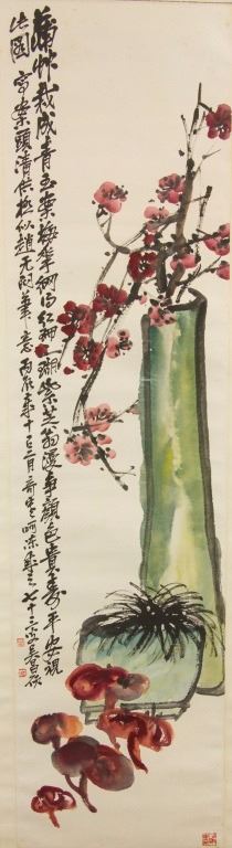 Still life of plum flower and purple linzhi; Chinese ink and watercolour on paper; hanging scroll; signed Wu Changshuo (1844-1927); inscribed with 3 artist seals; 136 cm x 34 cm