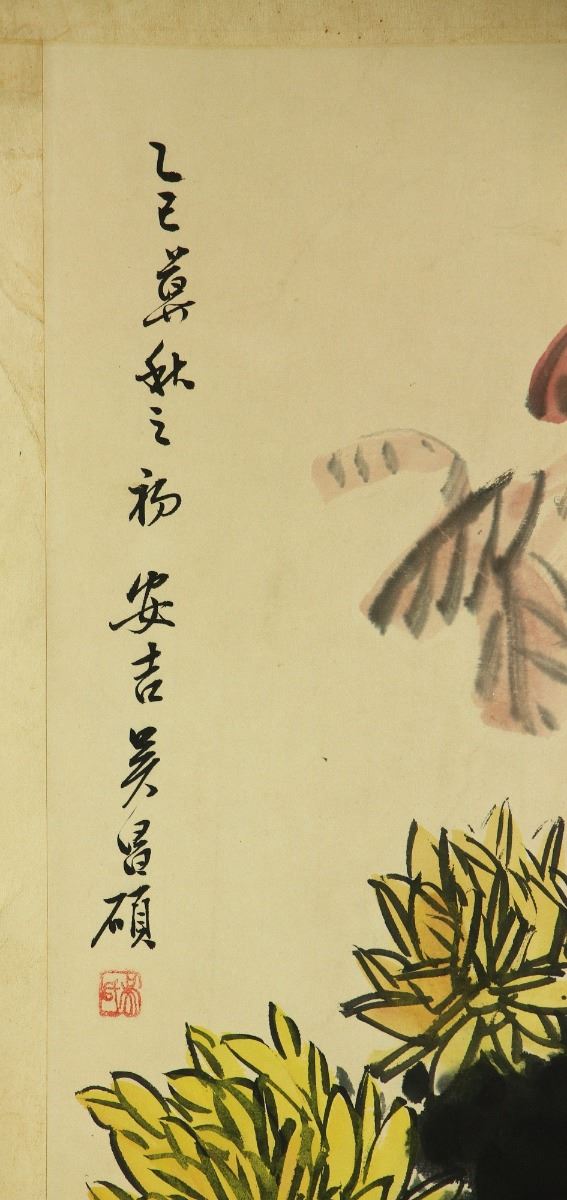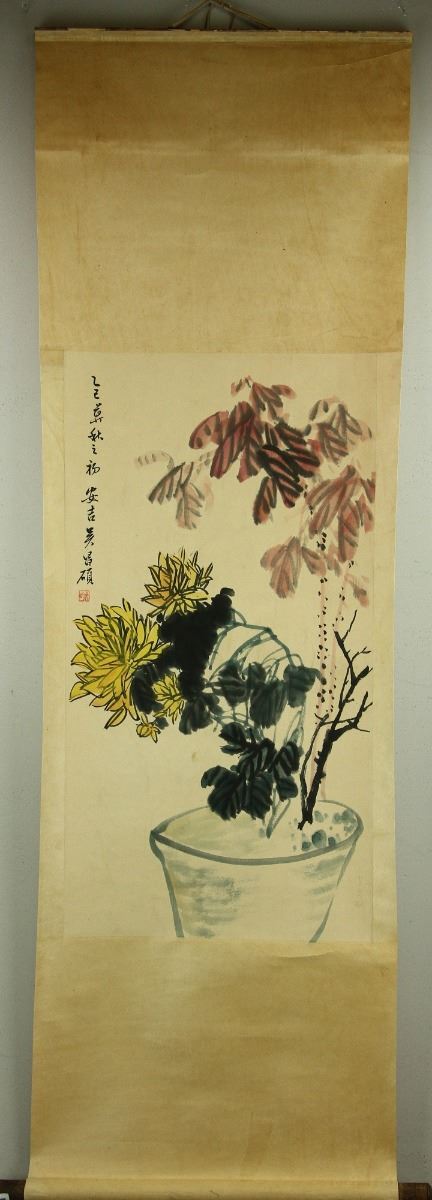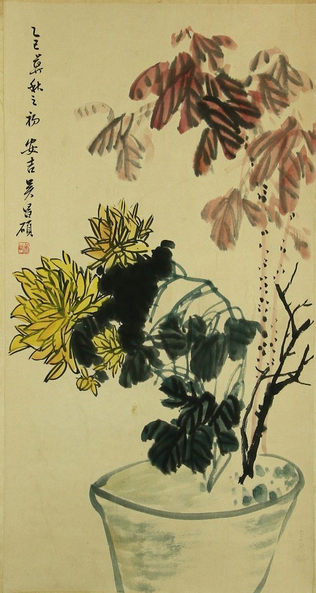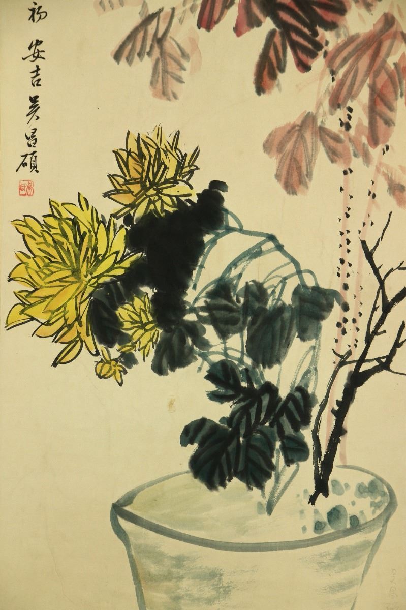 Chrysanthemum in flowerpot; Chinese ink and watercolour on paper; hanging scroll; signed Wu Changshuo (1844-1927); inscribed with one artist seal; 84 cm × 54 cm
