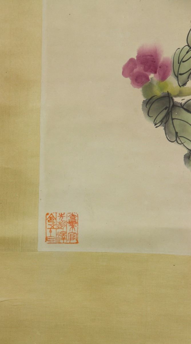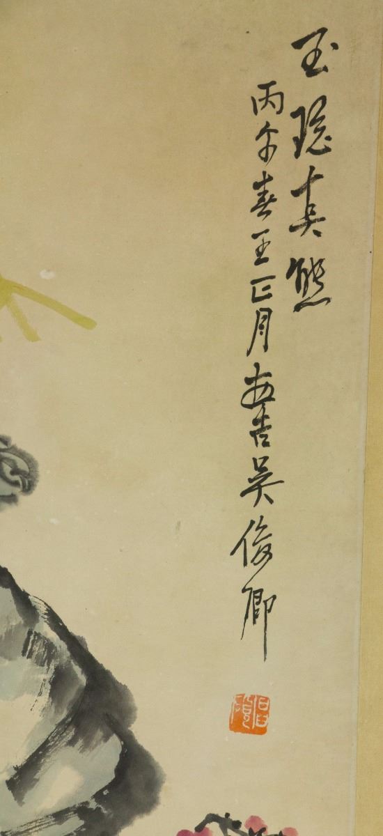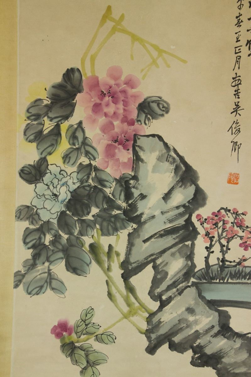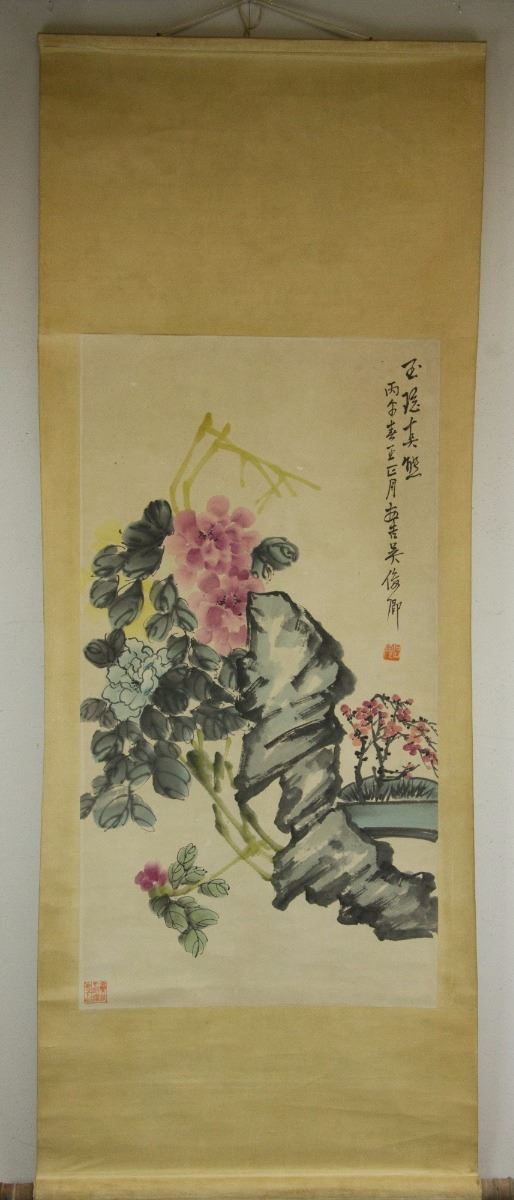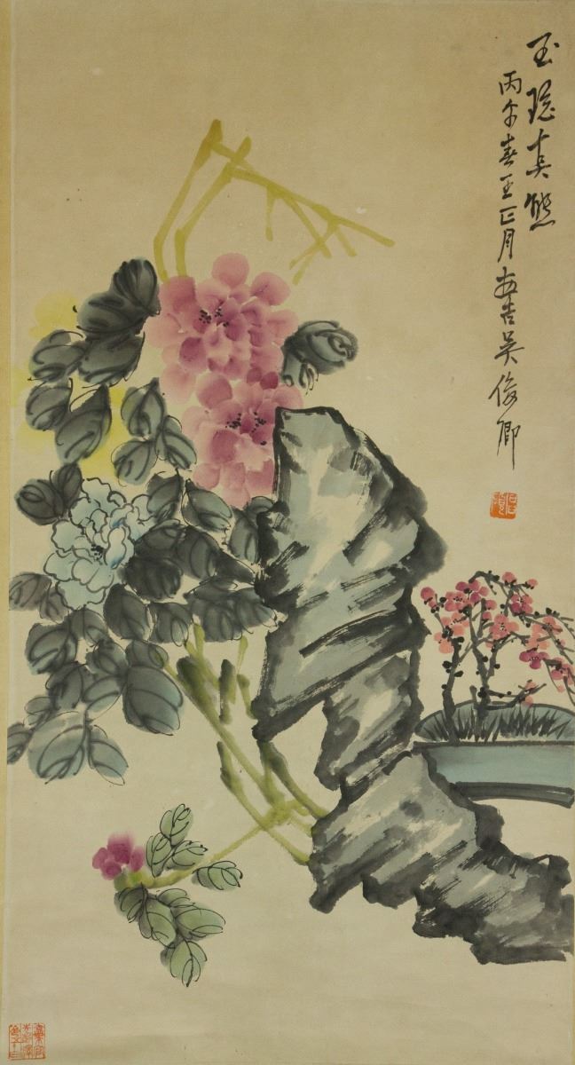 Peony and palm flowers with craggy rock; Chinese ink and watercolour on paper; hanging scroll; signed Wu Changshuo (1844-1927); inscribed with 2 artist seals; 88 cm × 47 cm