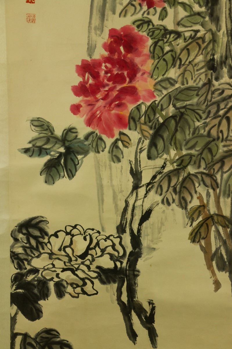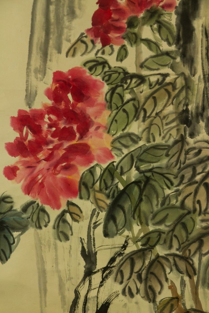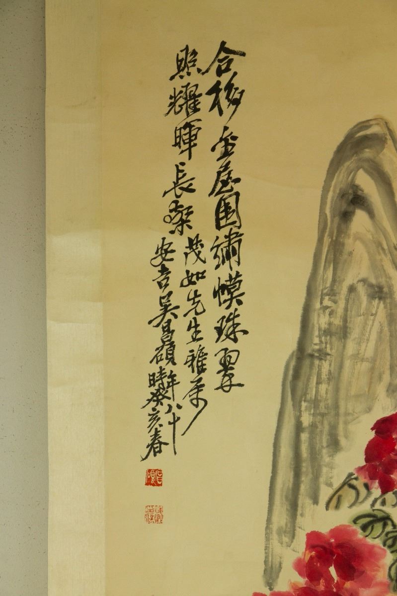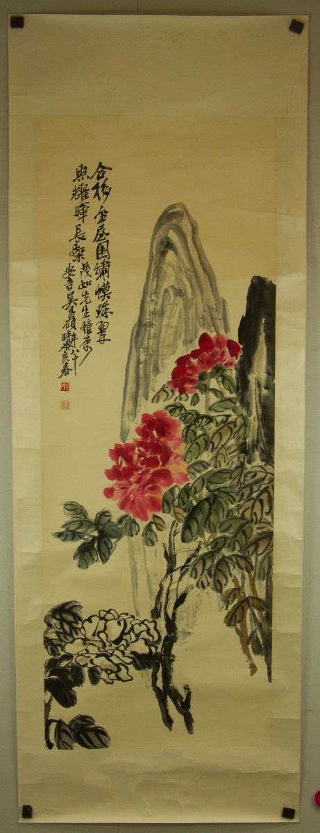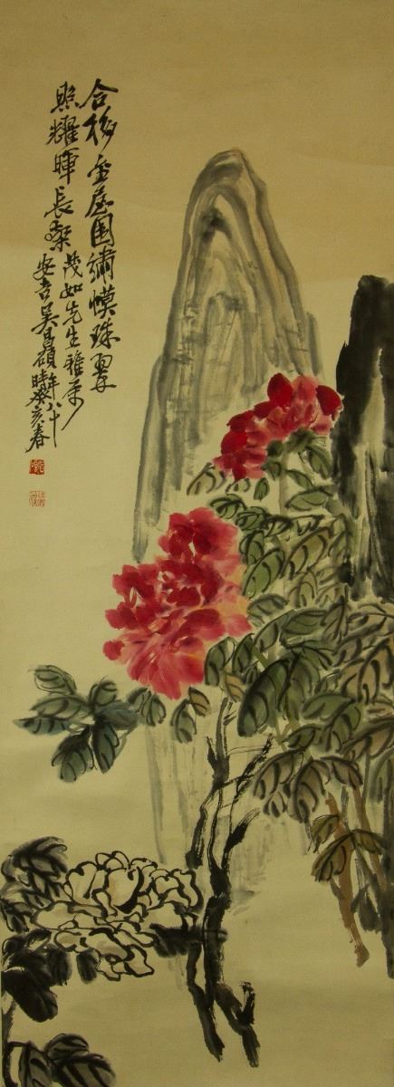 Pink and white peonies; Chinese ink and watercolour on paper roll; signed Wu Changshuo (1844-1927); inscribed with two artist seals; 127 cm × 48 cm