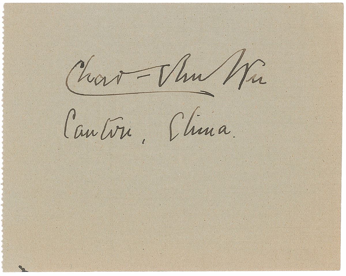 Chinese politician (1887–1934) who served as Minister to the United States and Chinese Minister of Foreign Affairs. Fountain pen signature, “Chao–Vhu Wu, Canton, China,” on an off-white 4.5 x 3.5 slip. In fine condition.