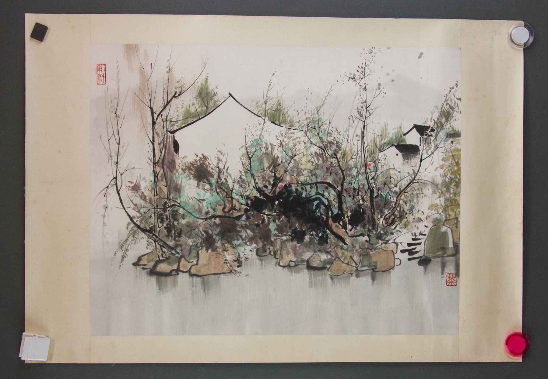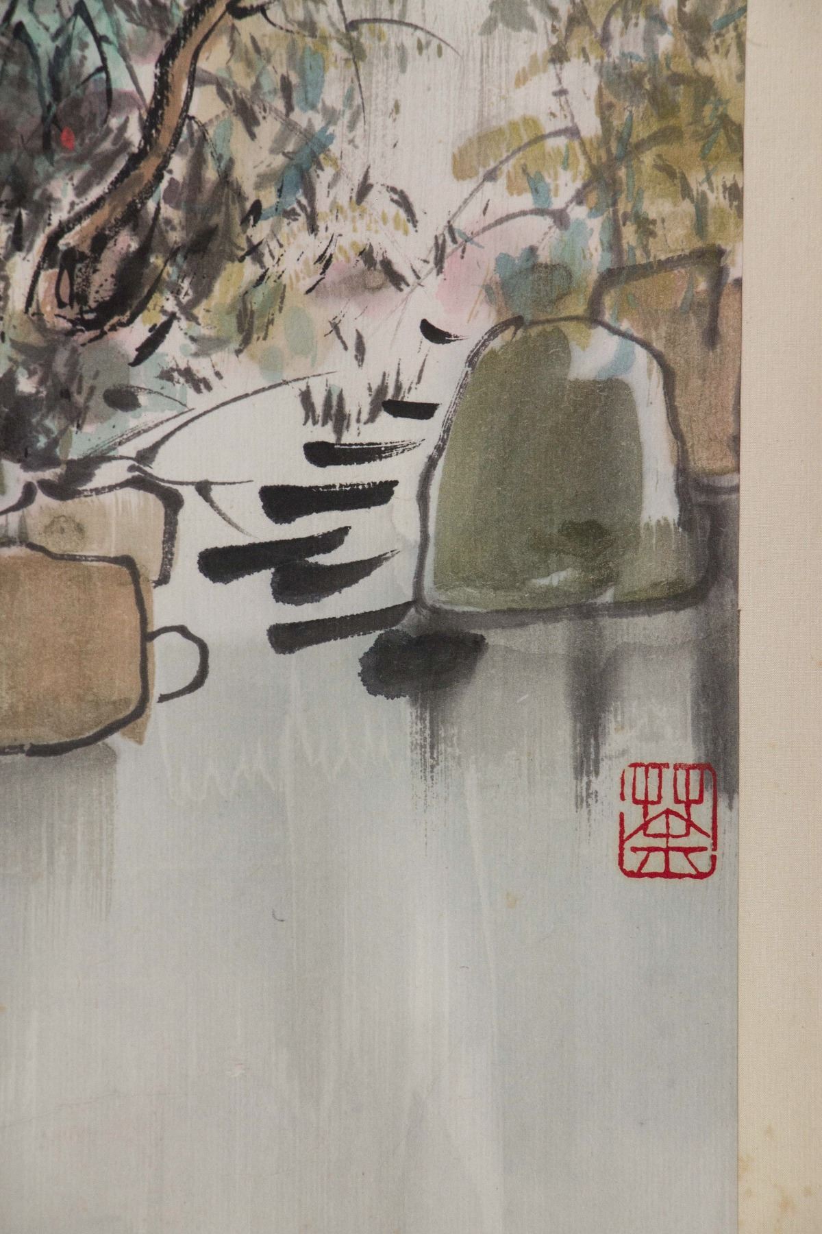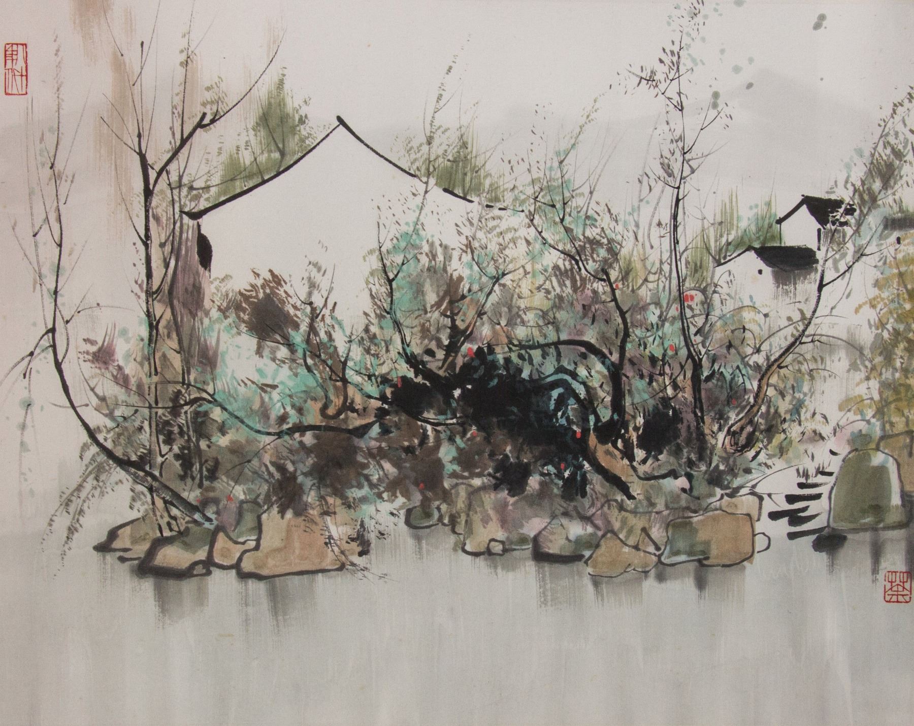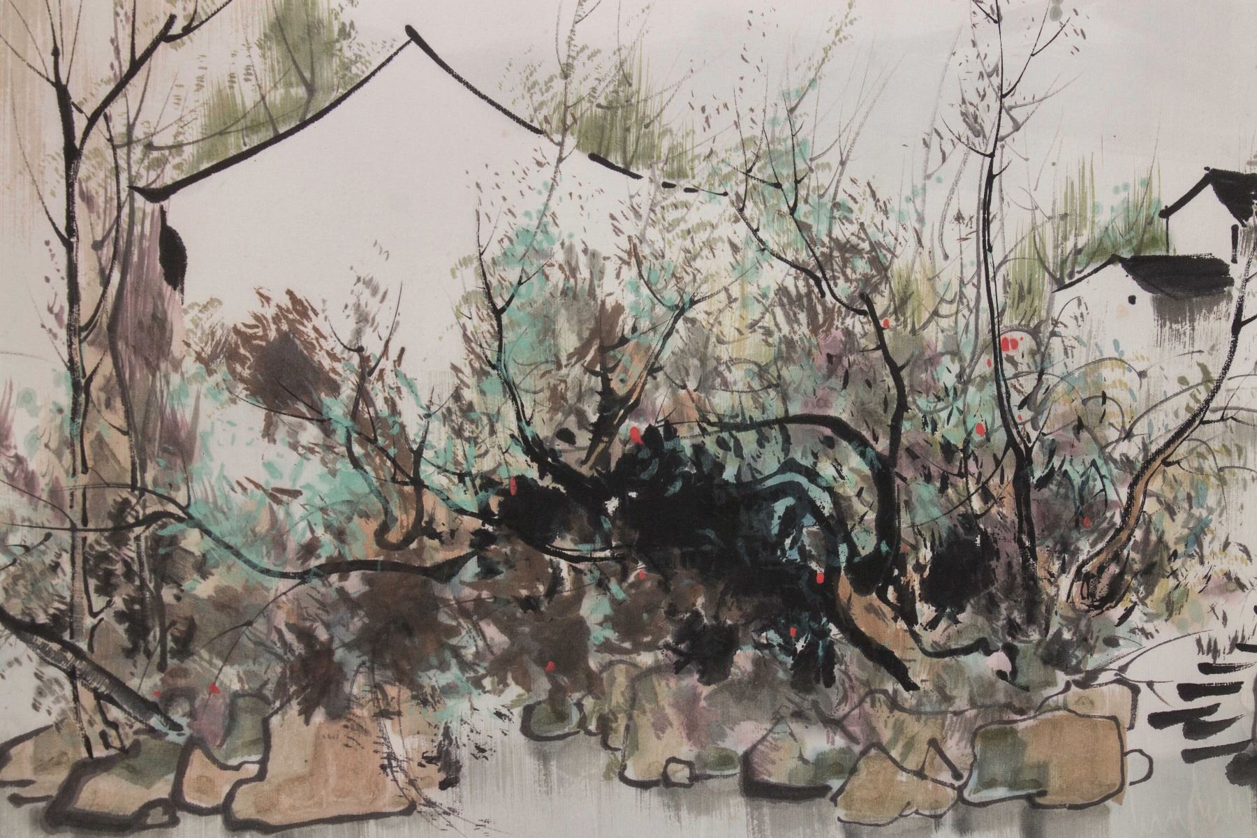 Scene painting of southern China village; Chinese ink and watercolour on paper roll; inscribed with Wu Guanzhong (1919-2010)'s seal; 44 cm x 57 cm