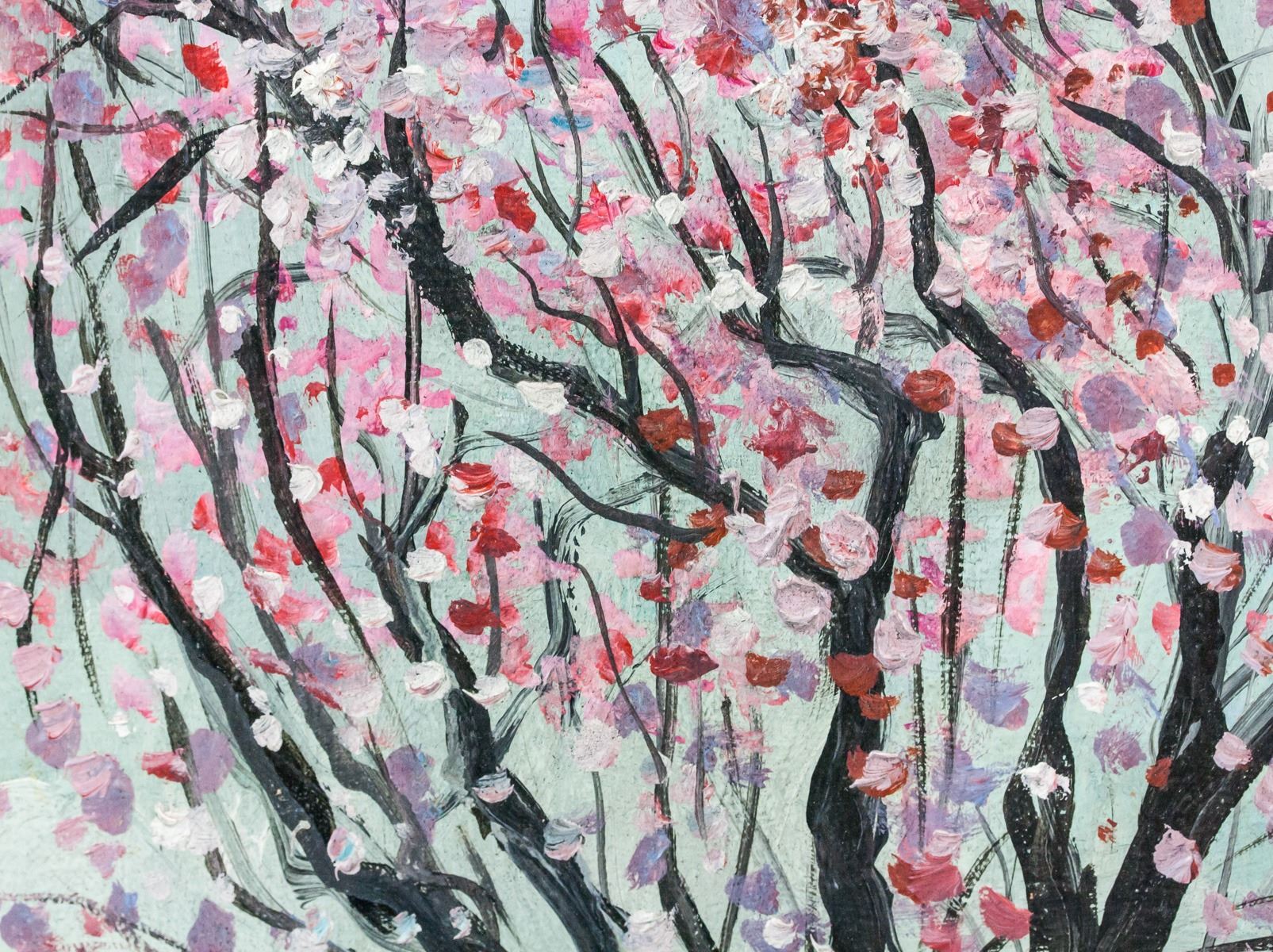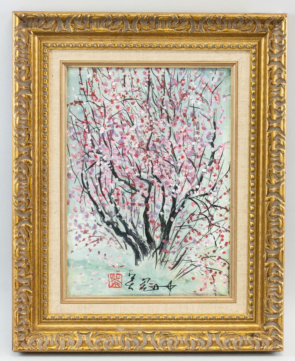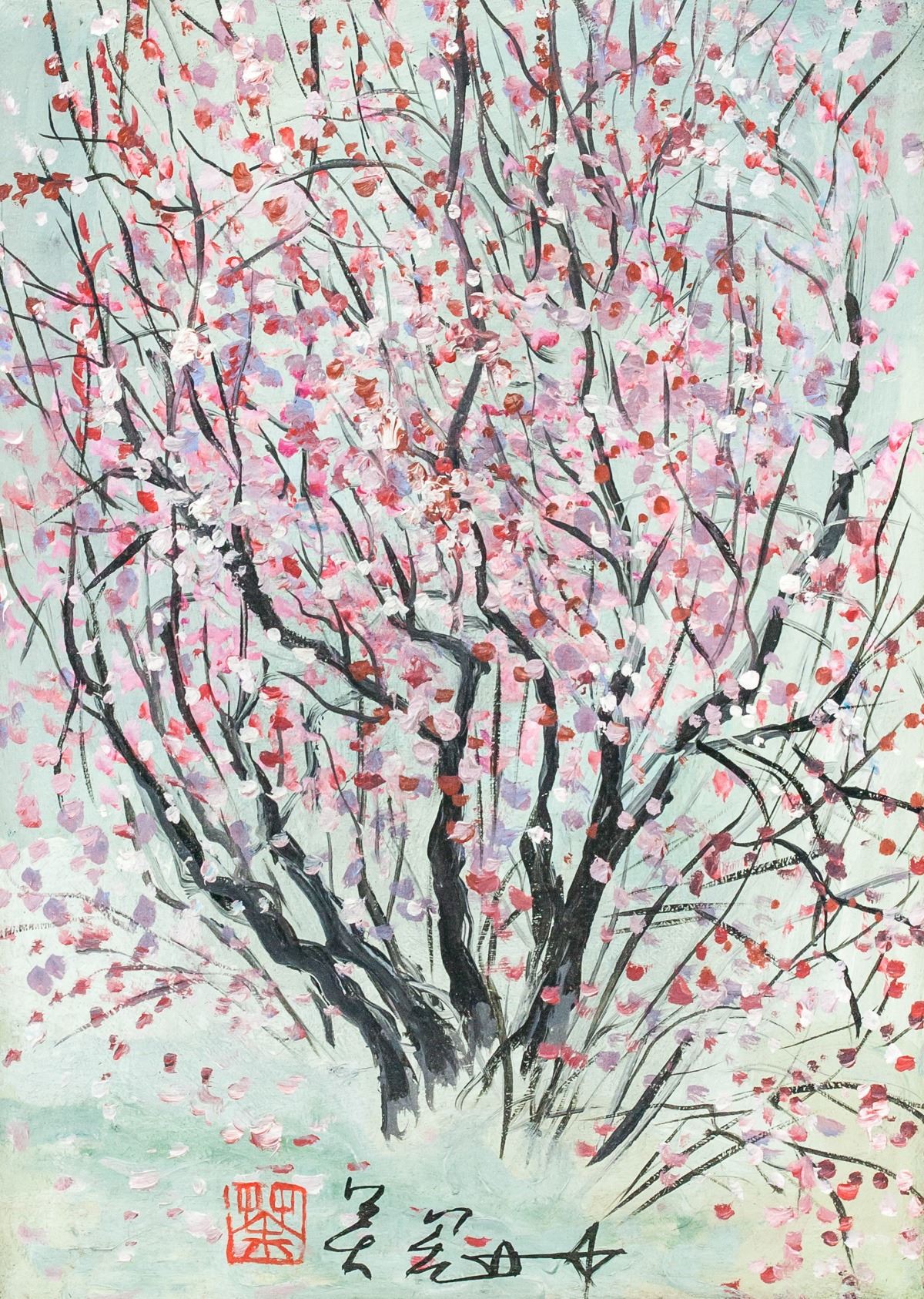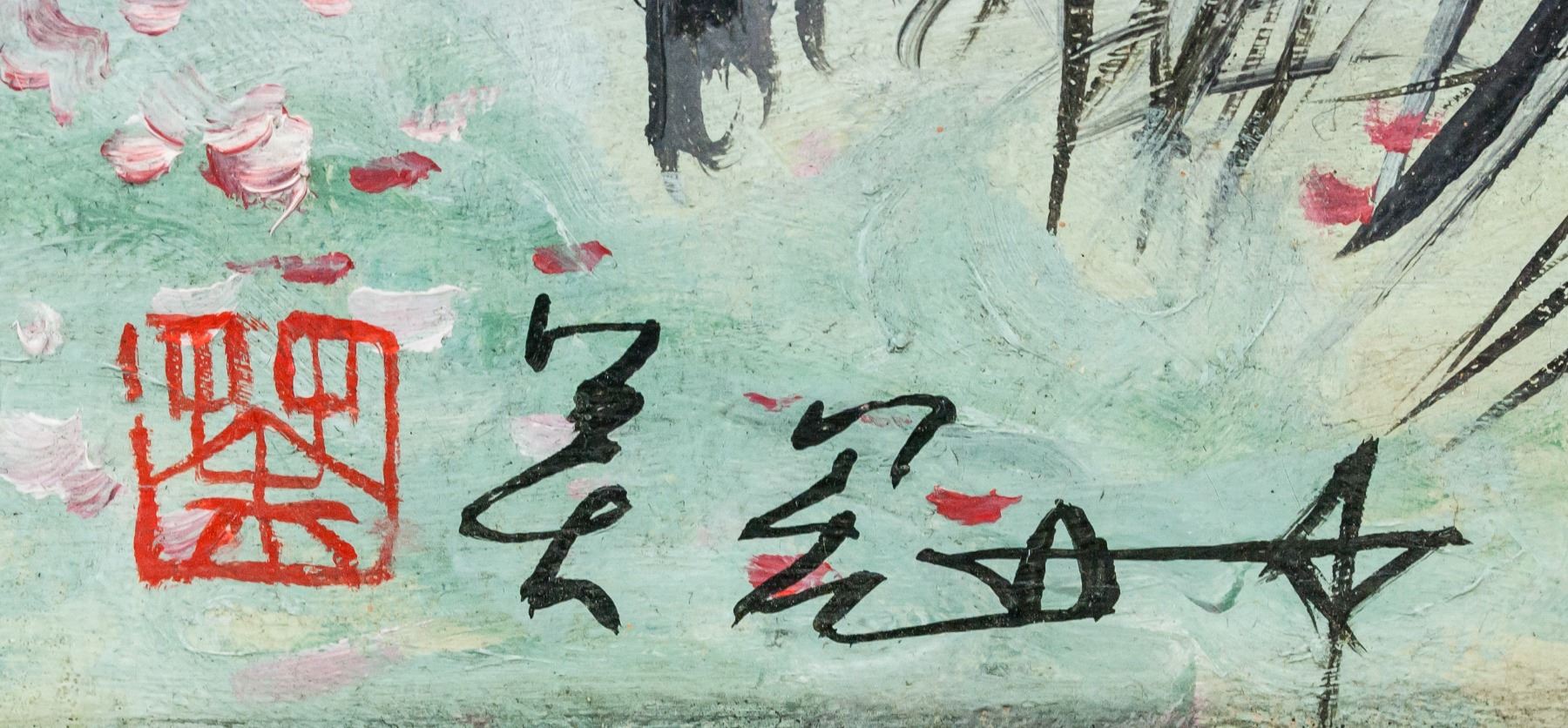 Oil on canvas, framed. Featuring blossoming cherry tree. Signed "Wu Guanzhong" in Chinese characters near the bottom. Inscribed with one seal. Attributed to Wu Guanzhong (1919-2010, Chinese). Canvas size: 34 x 24 cm (13.5 x 9.75 inches). Frame size: 47 x 38 cm (18.5 x 15 inches).