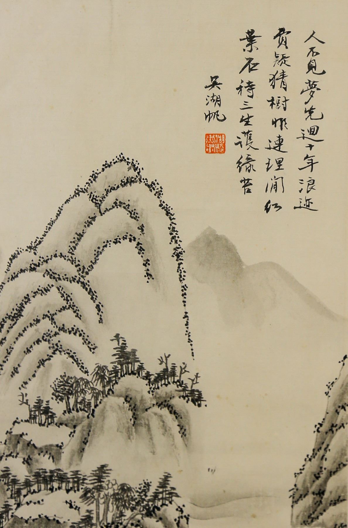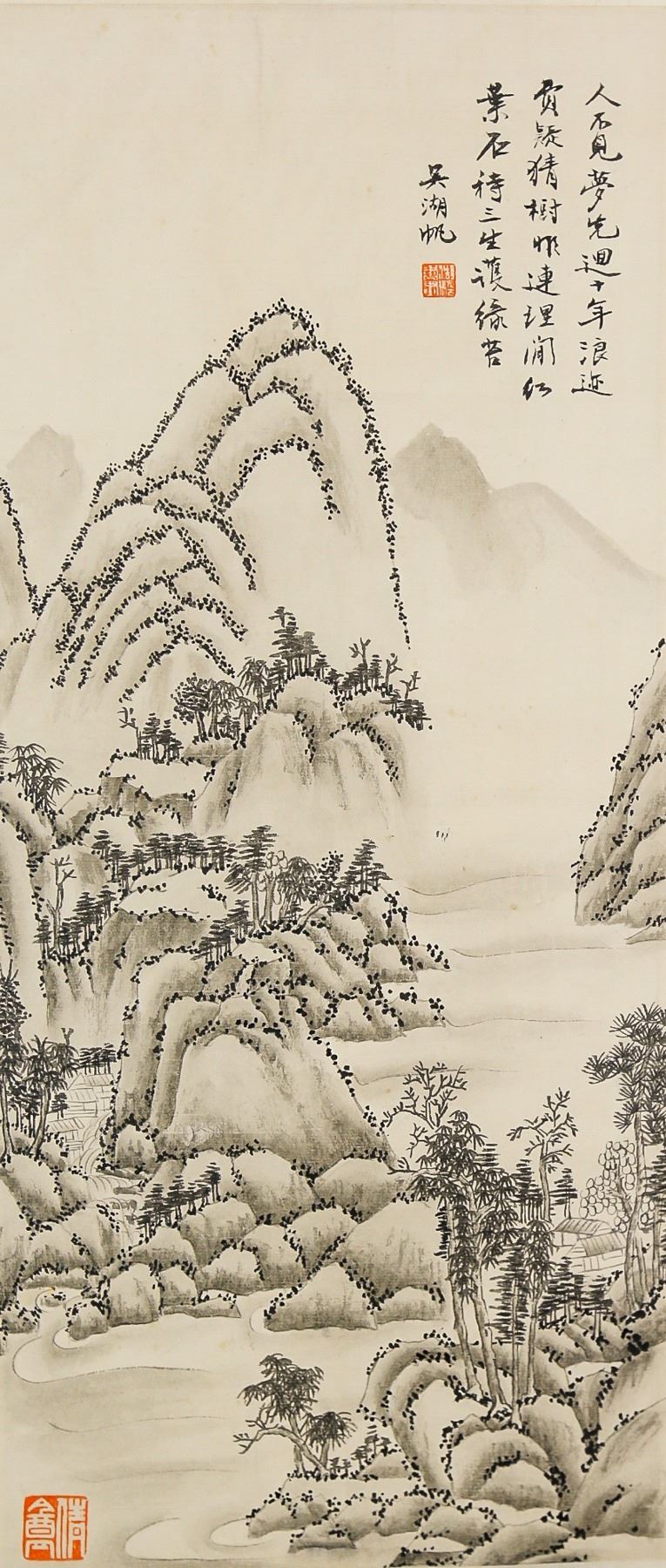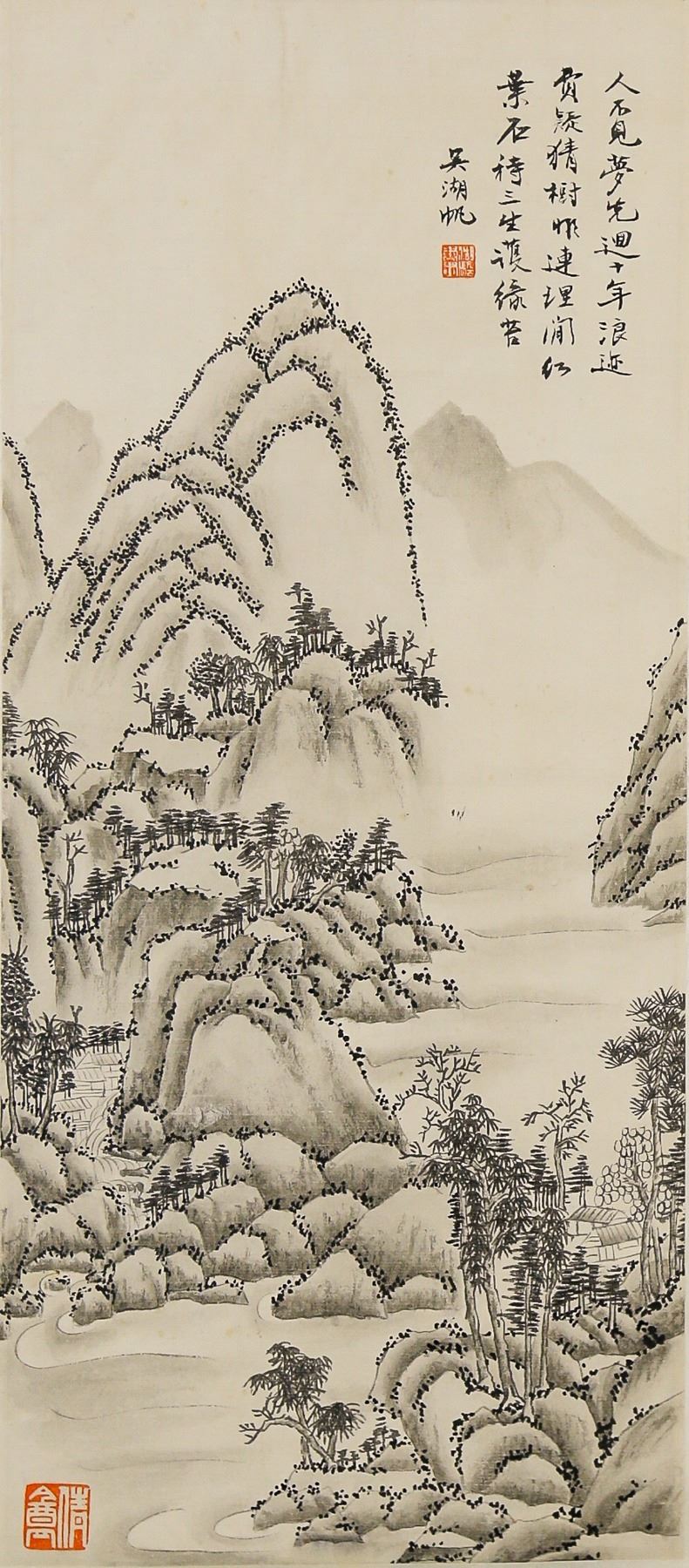 Ink on paper, hanging scroll. Featuring a mountainous landscape scene. Signed Wu Hu Fan 1894-1968 Chinese, inscribed with 1 artist red seal. 49.5 x 22 cm.