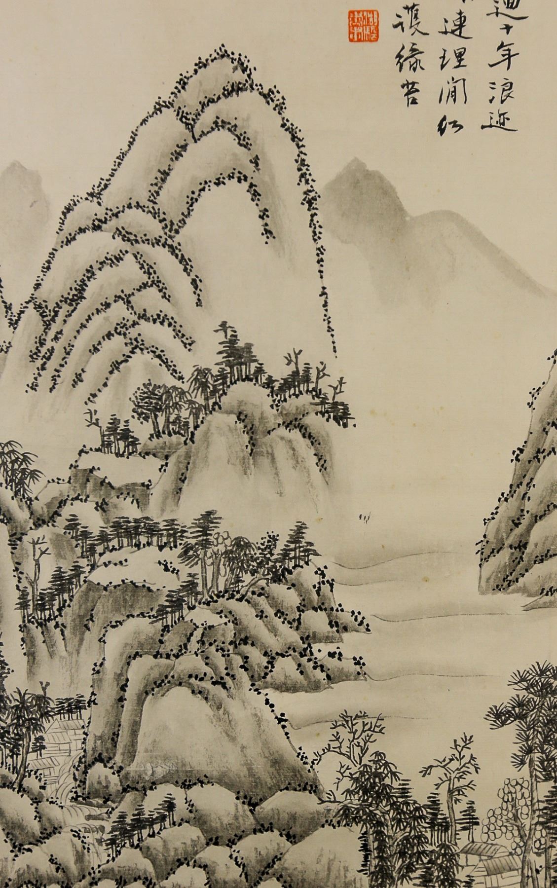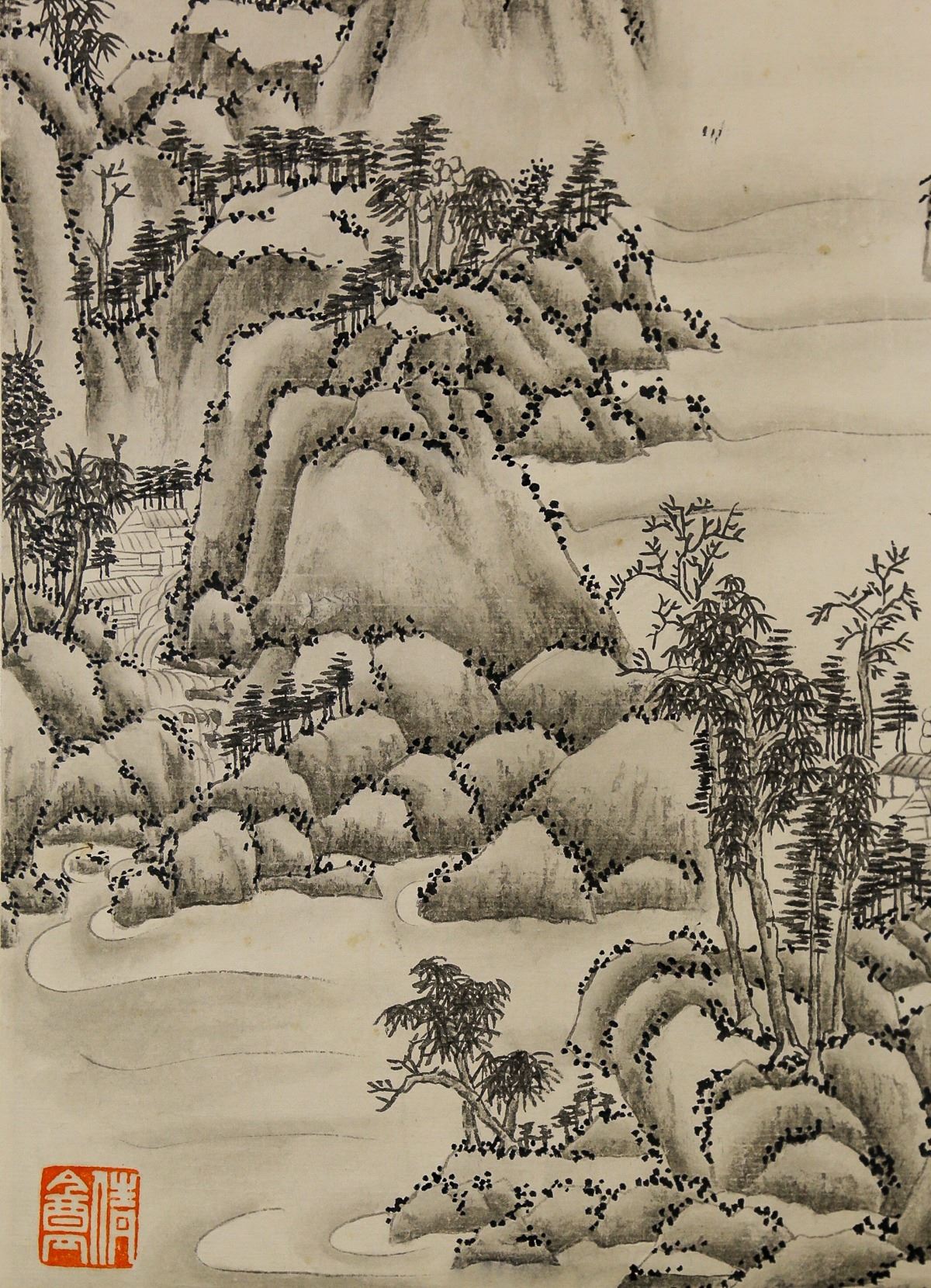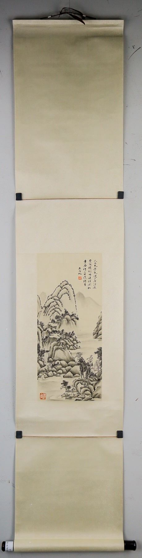 Ink on paper, hanging scroll. Featuring a mountainous landscape scene. Signed Wu Hu Fan 1894-1968 Chinese, inscribed with 1 artist red seal. 49.5 x 22 cm.