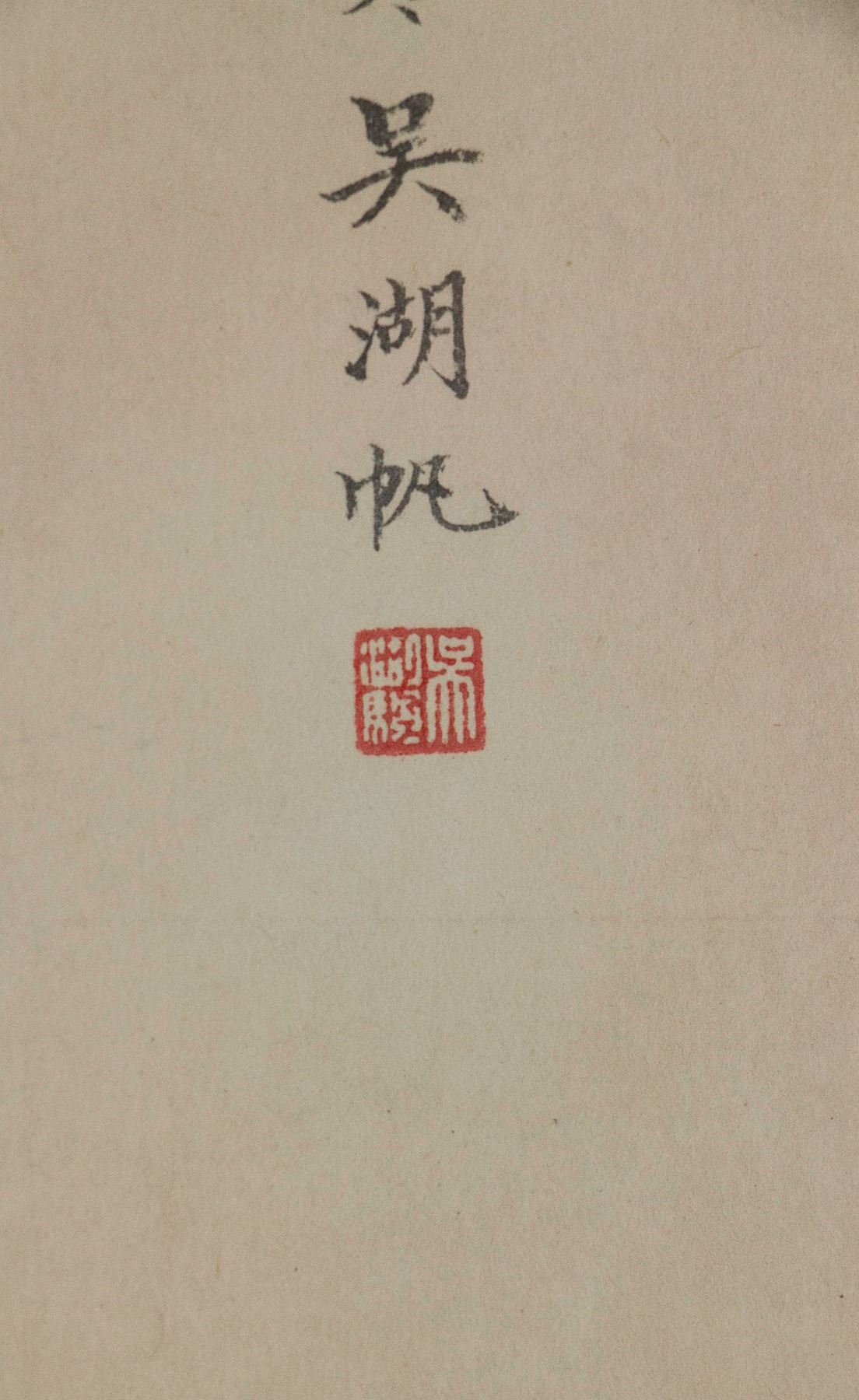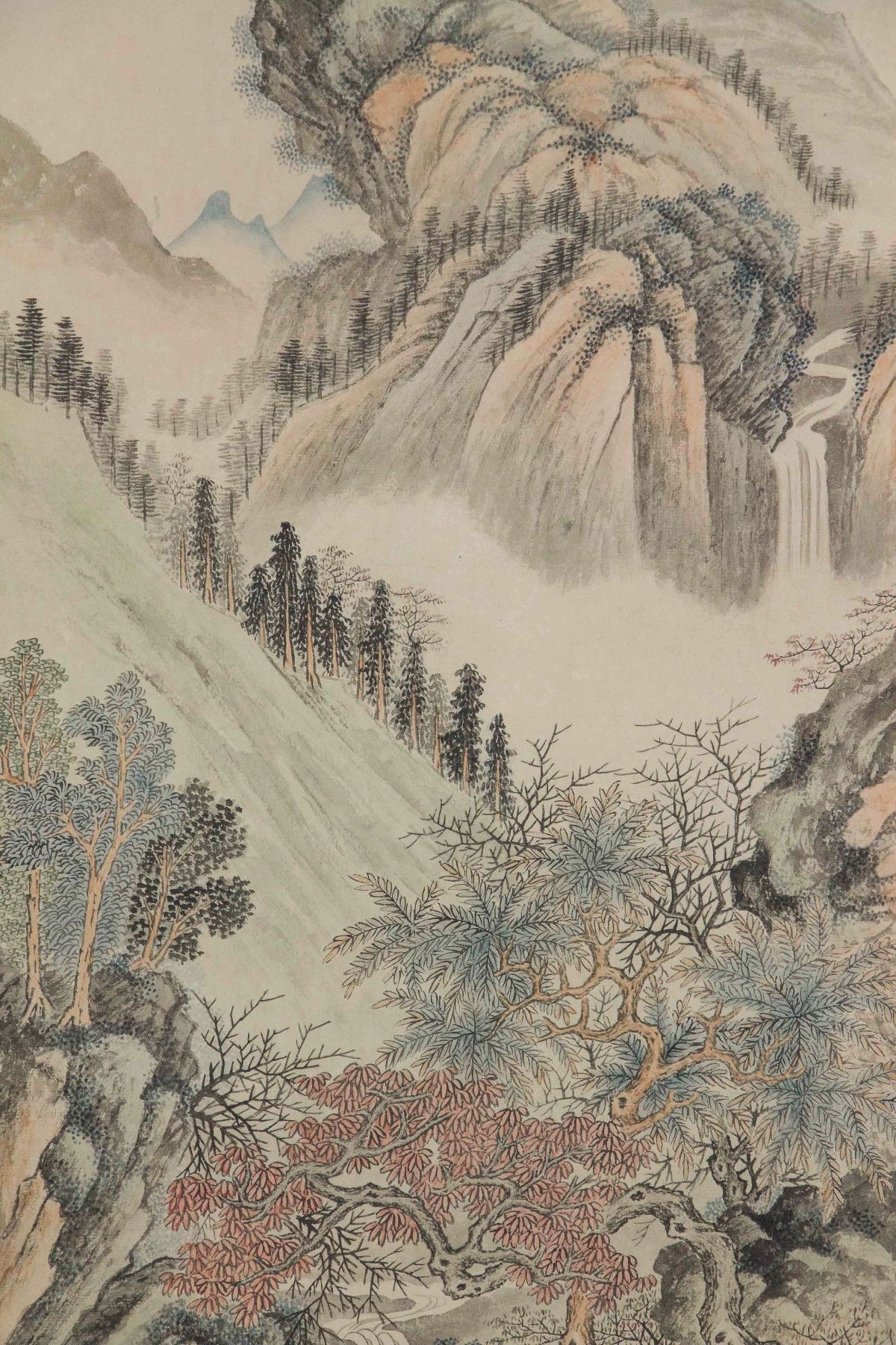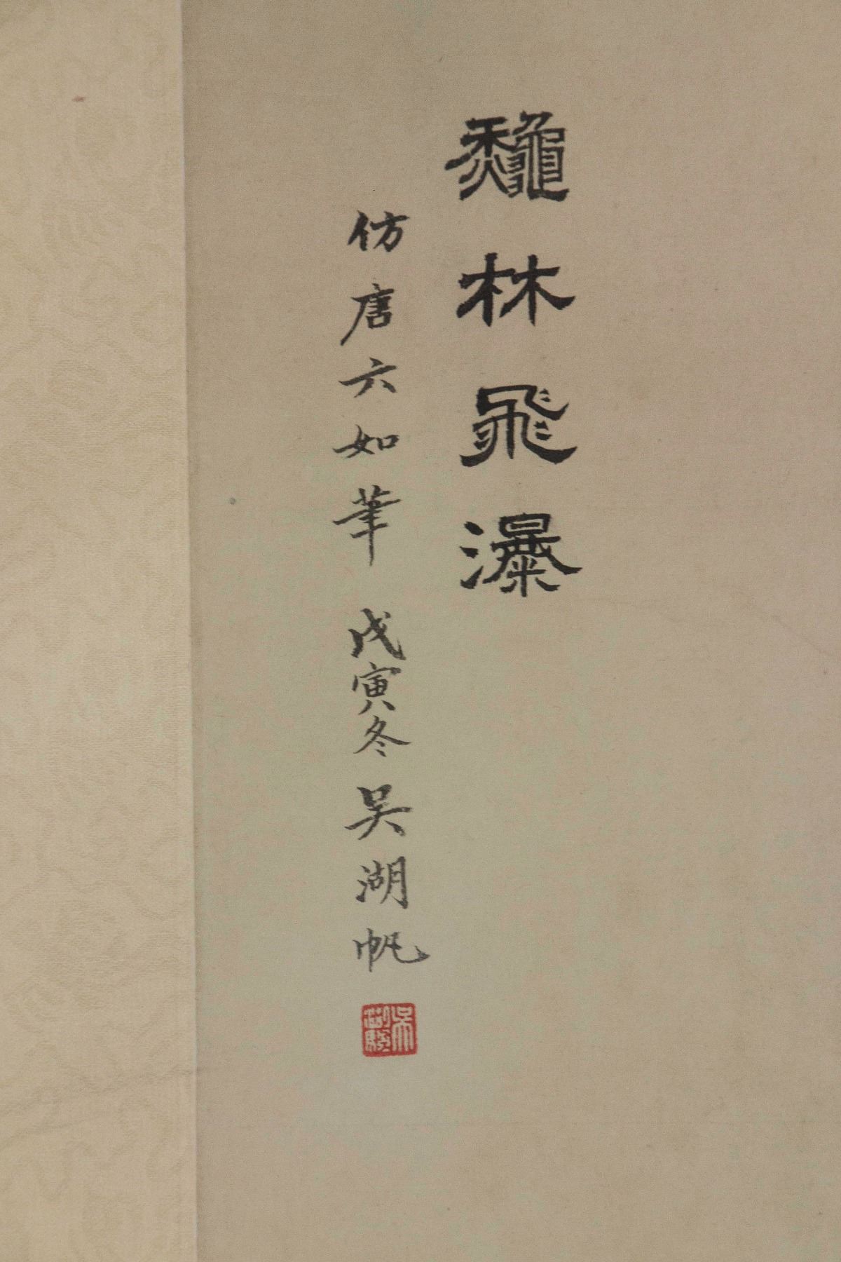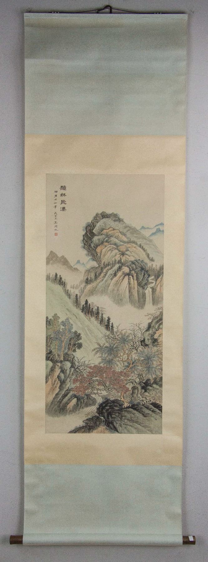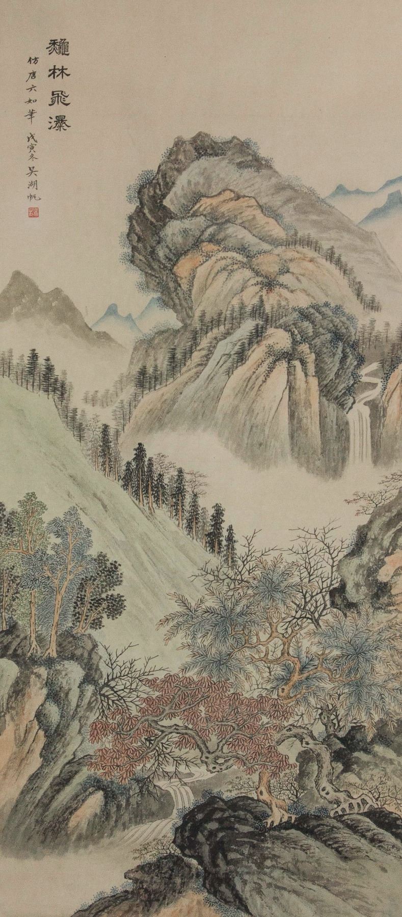 Mountainous landscape with waterfall; Chinese ink and watercolour on paper; hanging scroll; signed Wu Hufan (1894-1968); inscribed with 1 artist seal; 86cm x 39cm