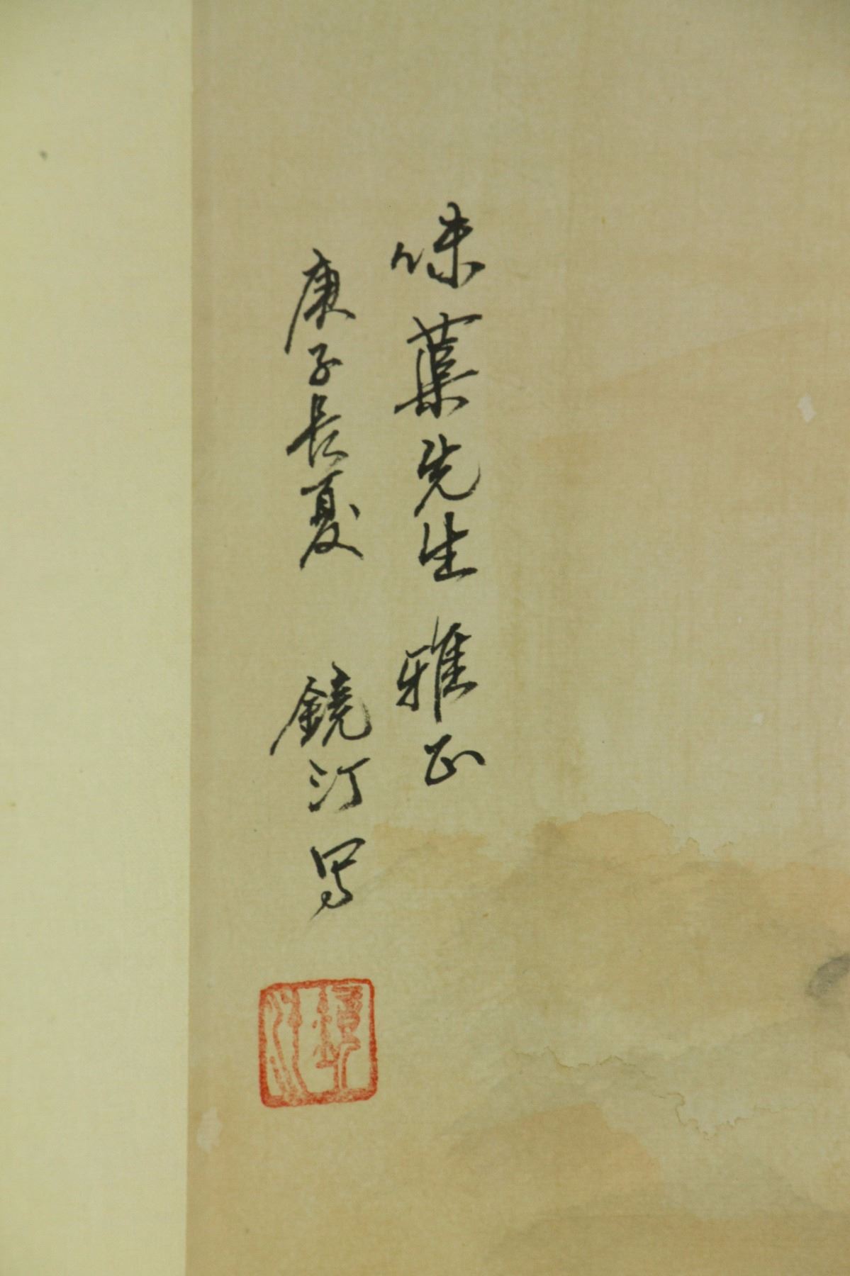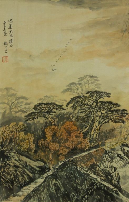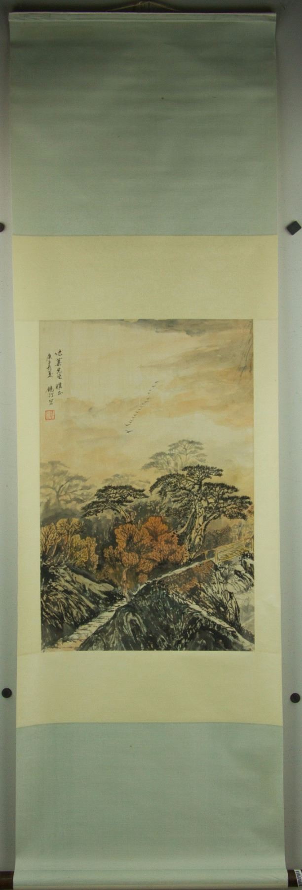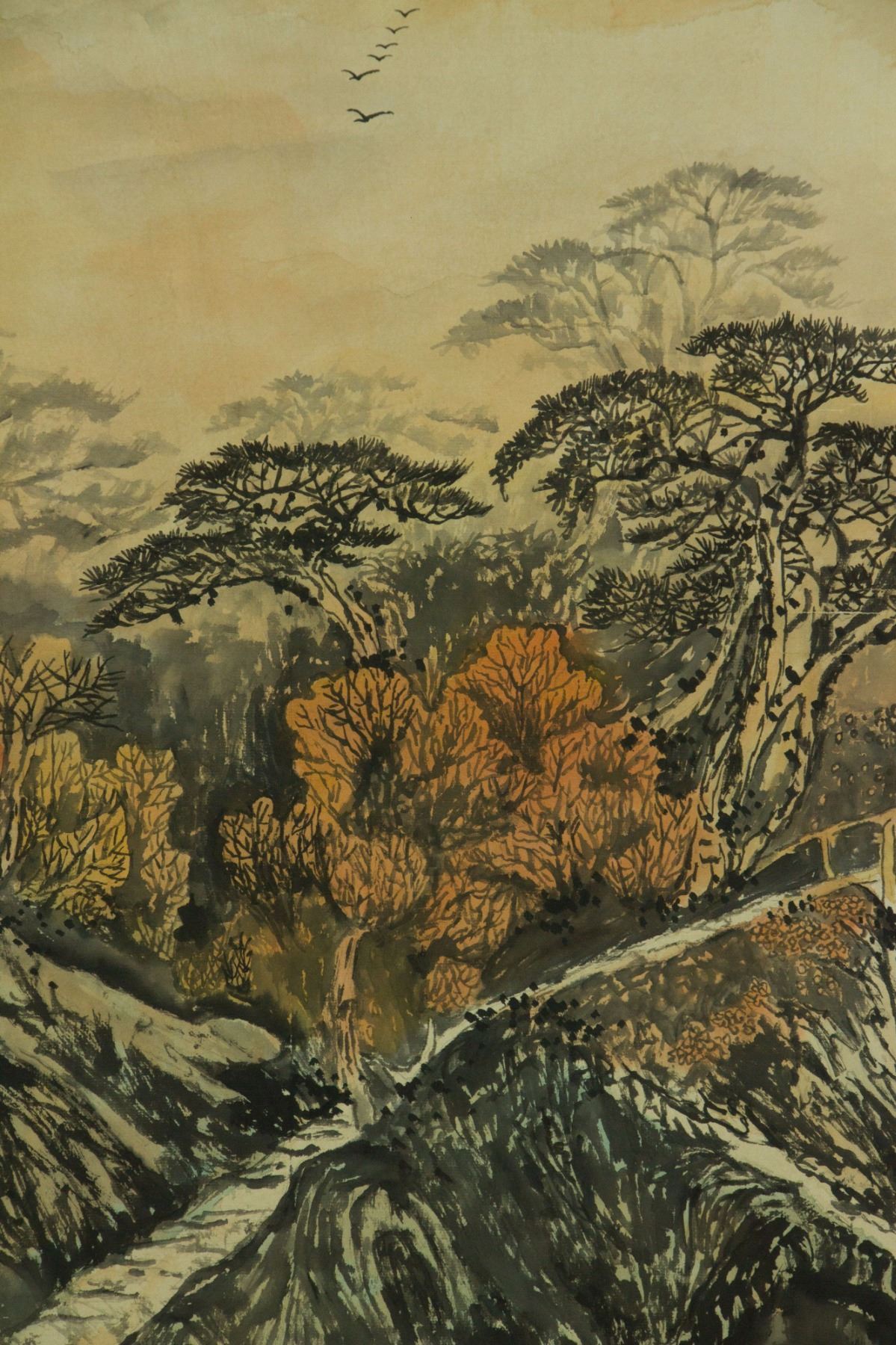 Trail in the pine tree forest; Chinese ink and watercolour on paper; hanging scroll; signed Wu Jingding and inscribed with one artist seal; 174 cm × 52 cm