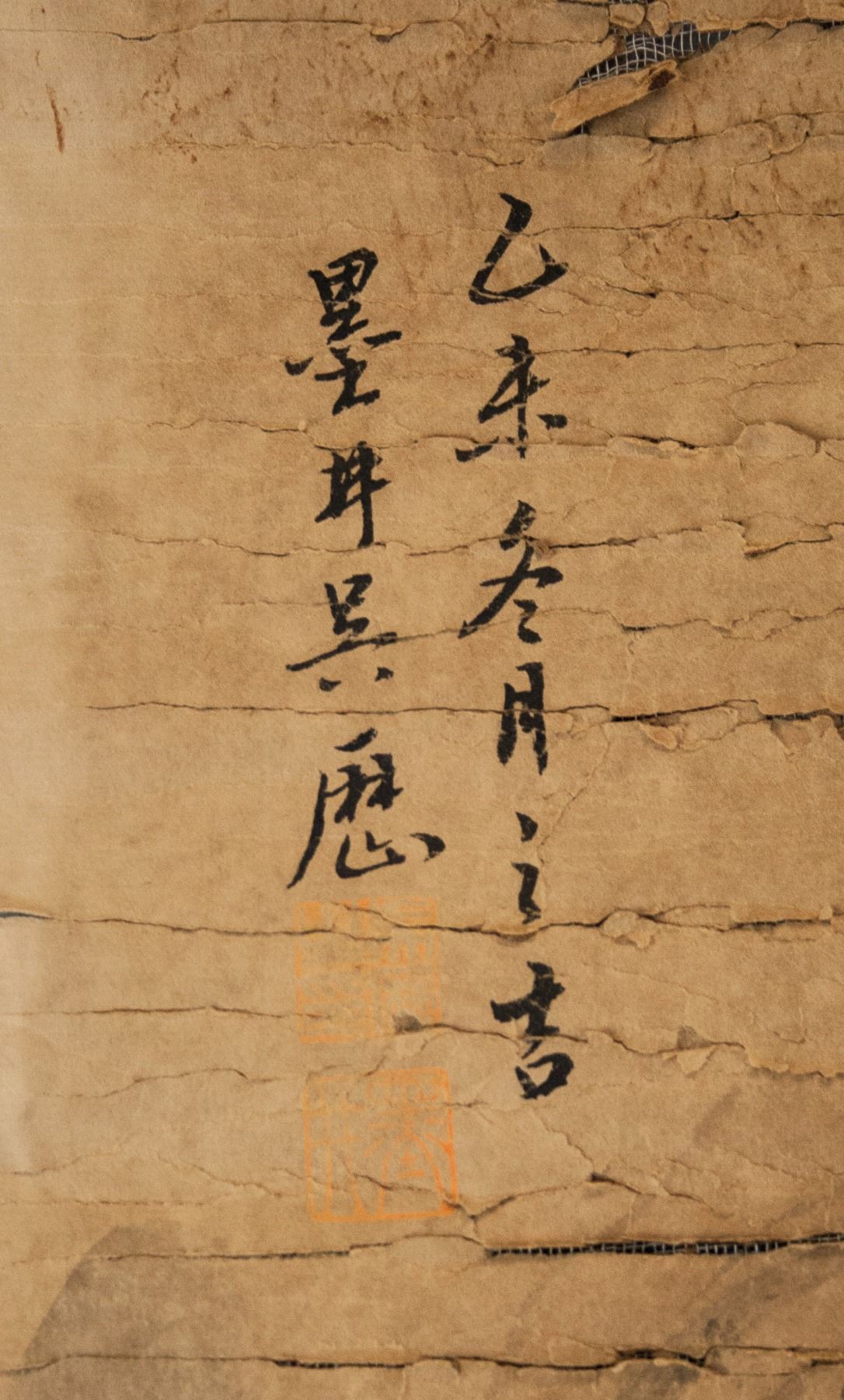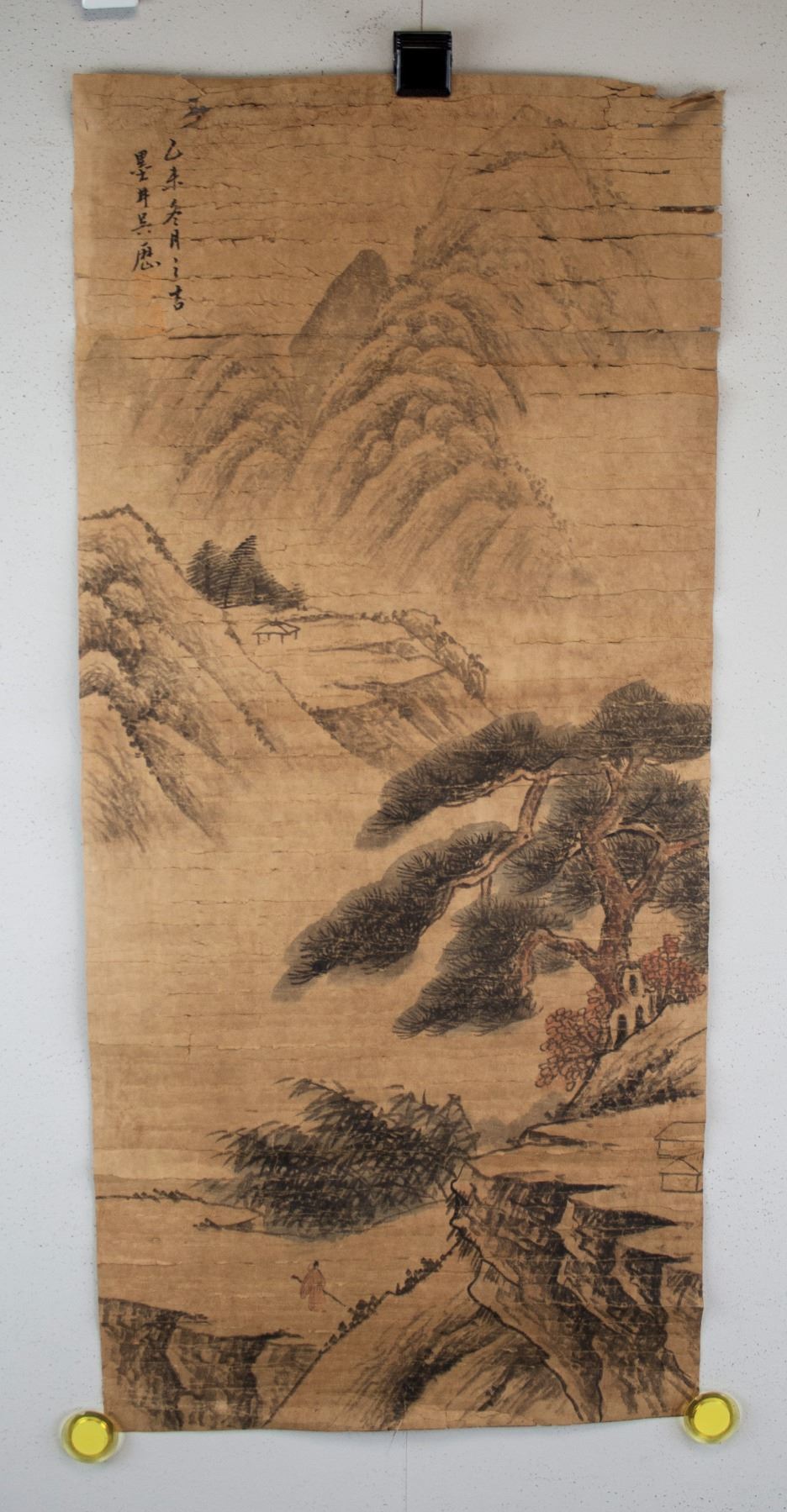 Mountainous landscape and pine tree; Chinese ink and watercolour on paper; signed Wu Li (1632-1718); inscribed with 2 artist seals; 90 cm x 43 cm
