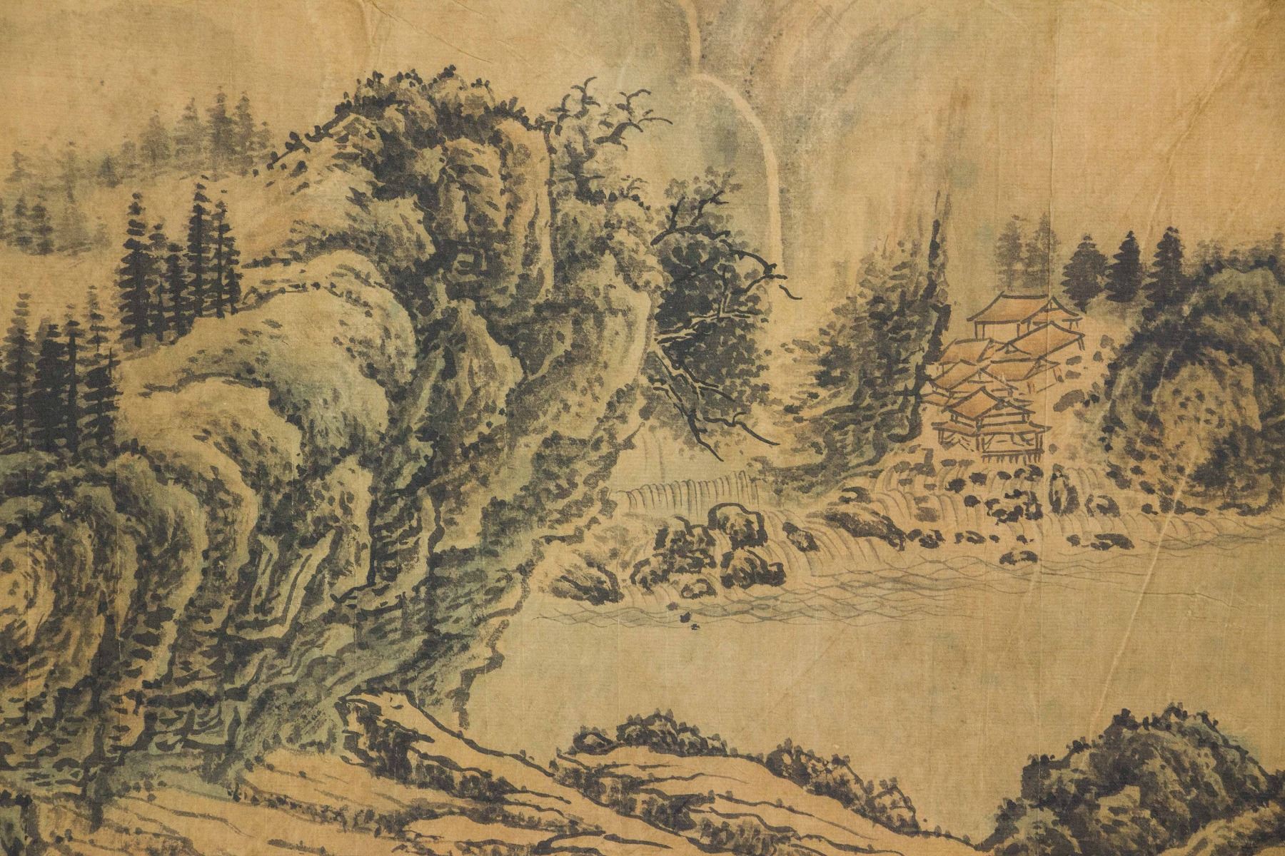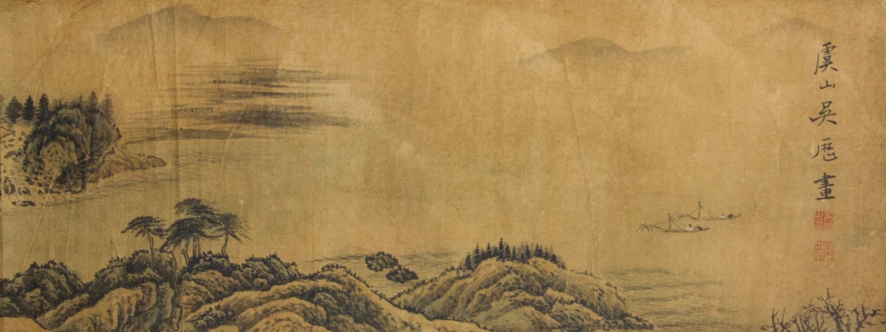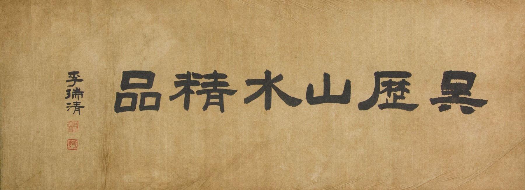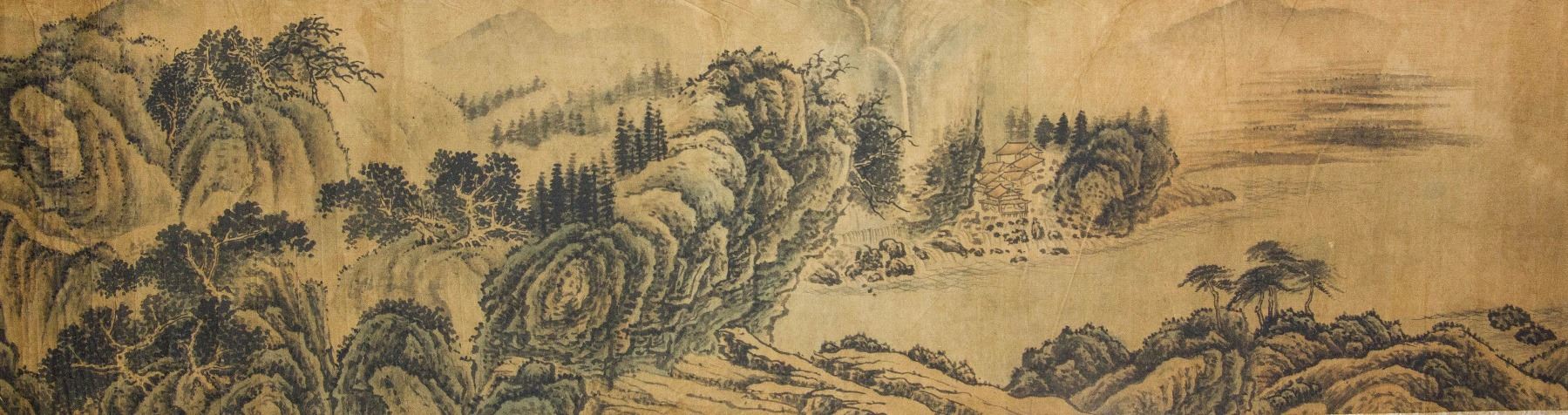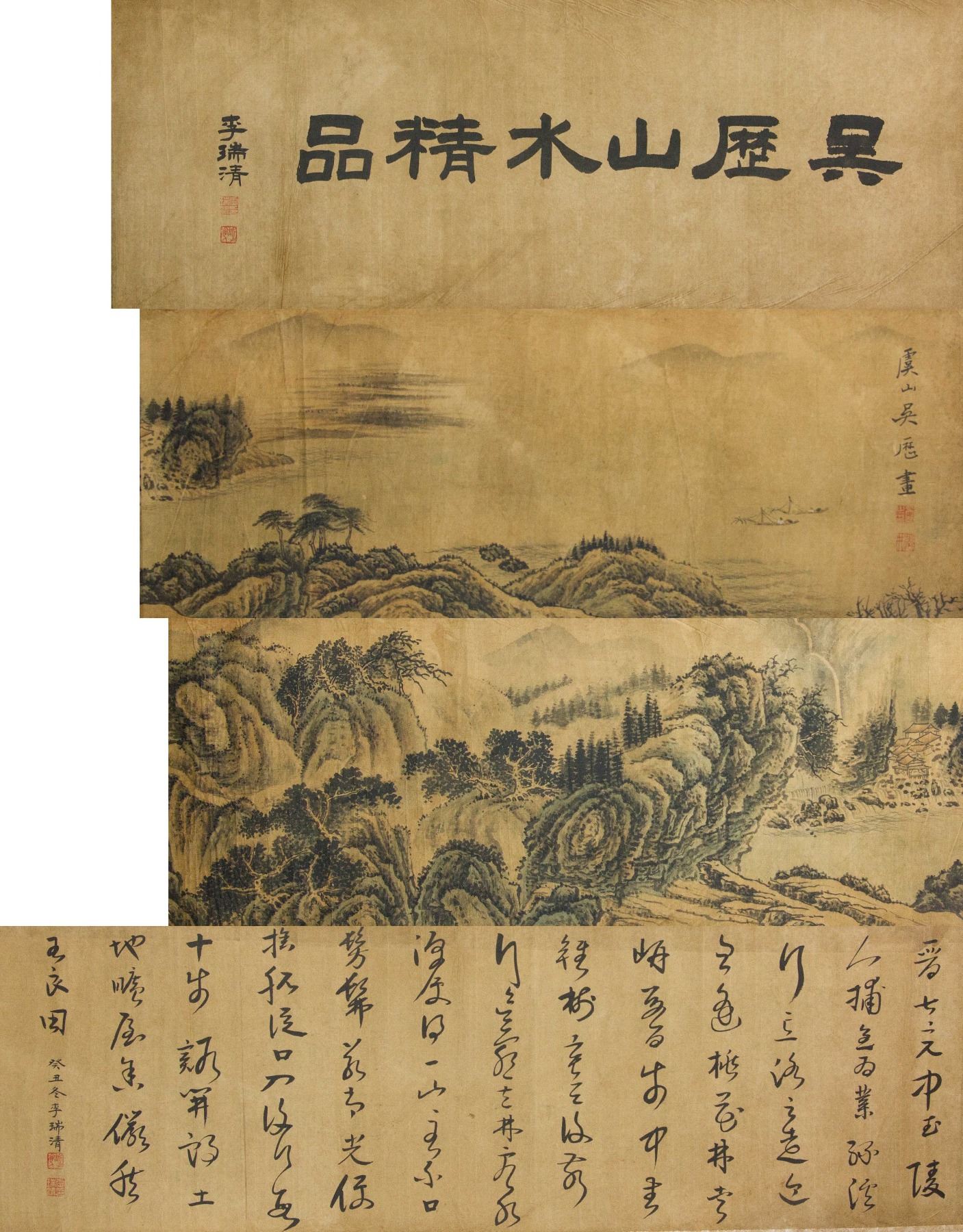 Mountainous landscape with river; Chinese ink and watercolour on paper; long hand scroll; signed Wu Li (1632-1718); inscribed with 2 artist seals; title and inscription written by Li Ruiqing (1867-1920); inscribed with 4 seals; 345 cm x 29.5 cm
