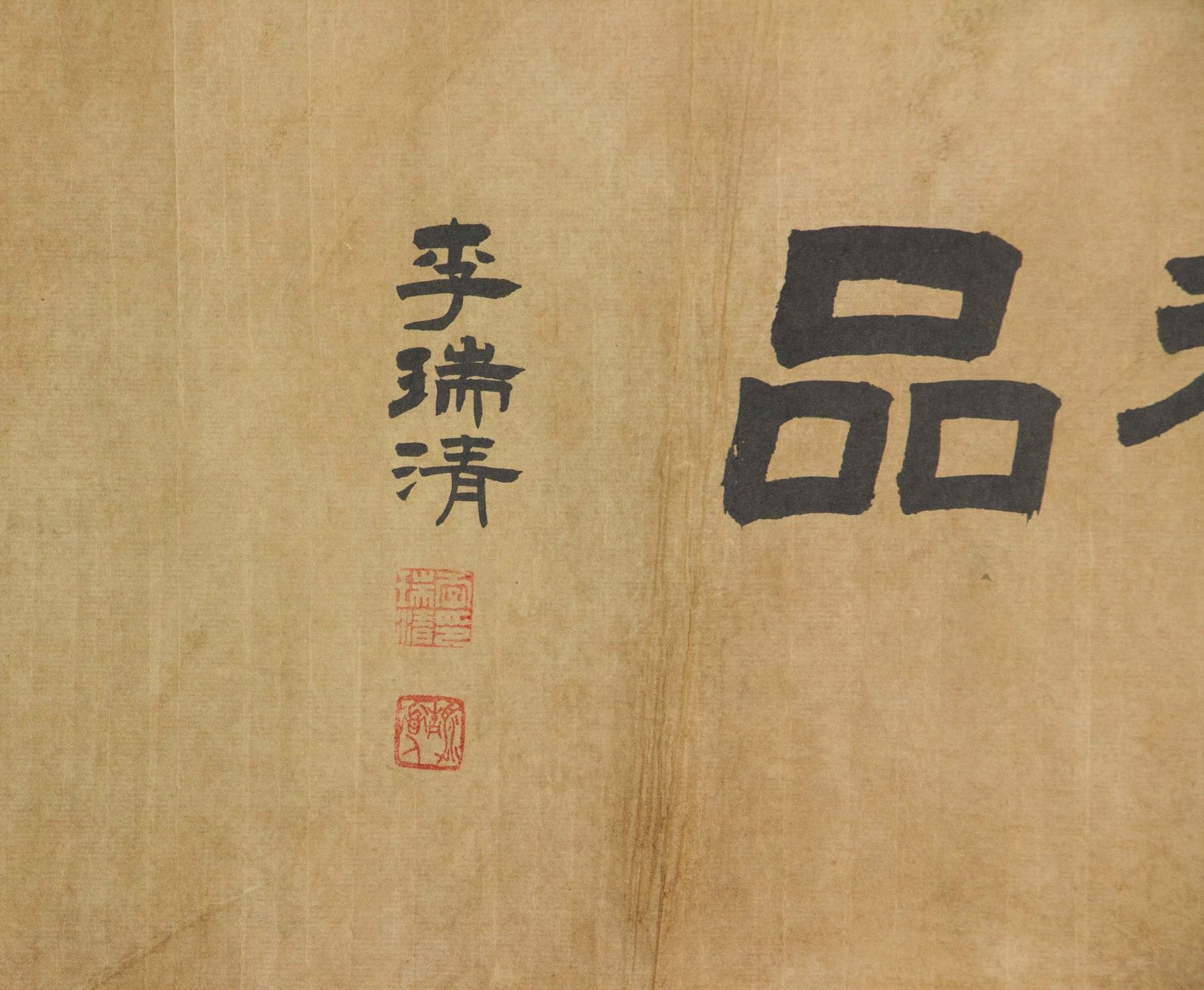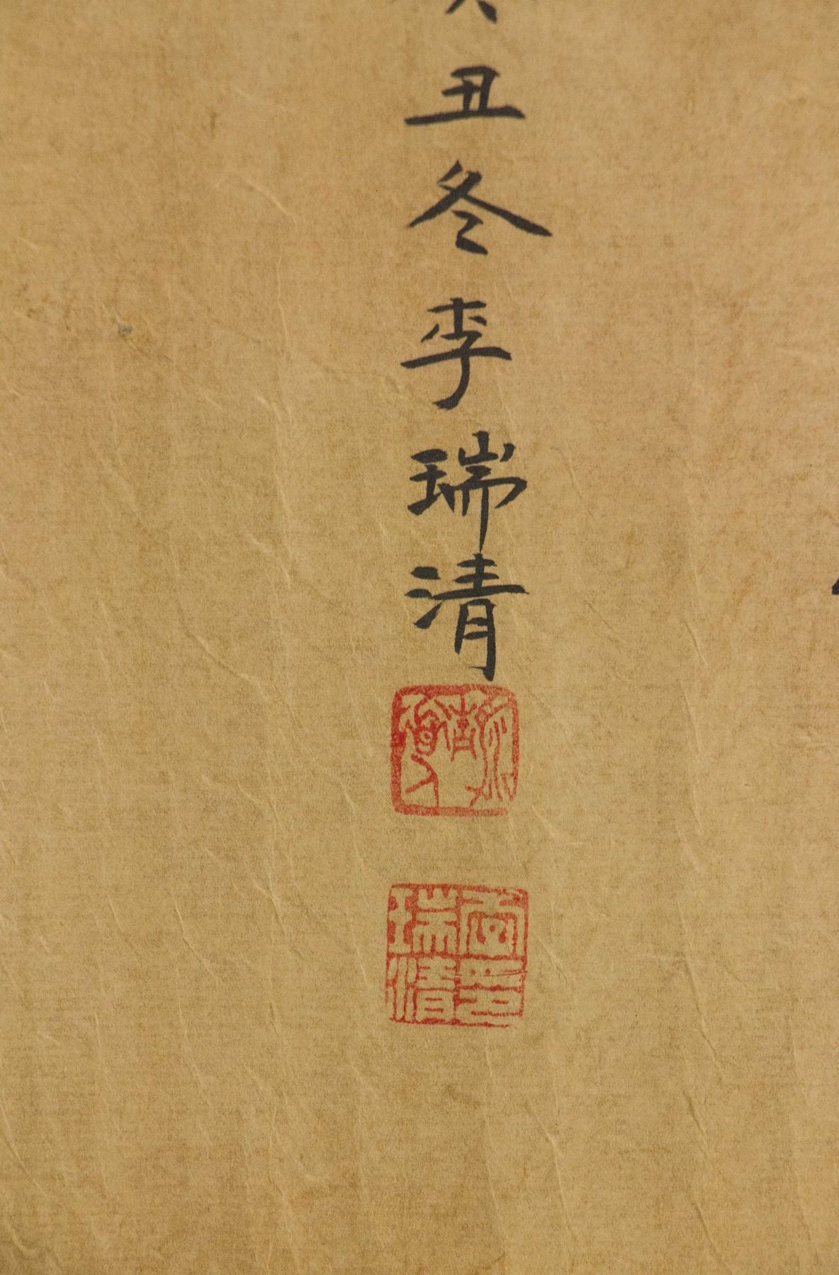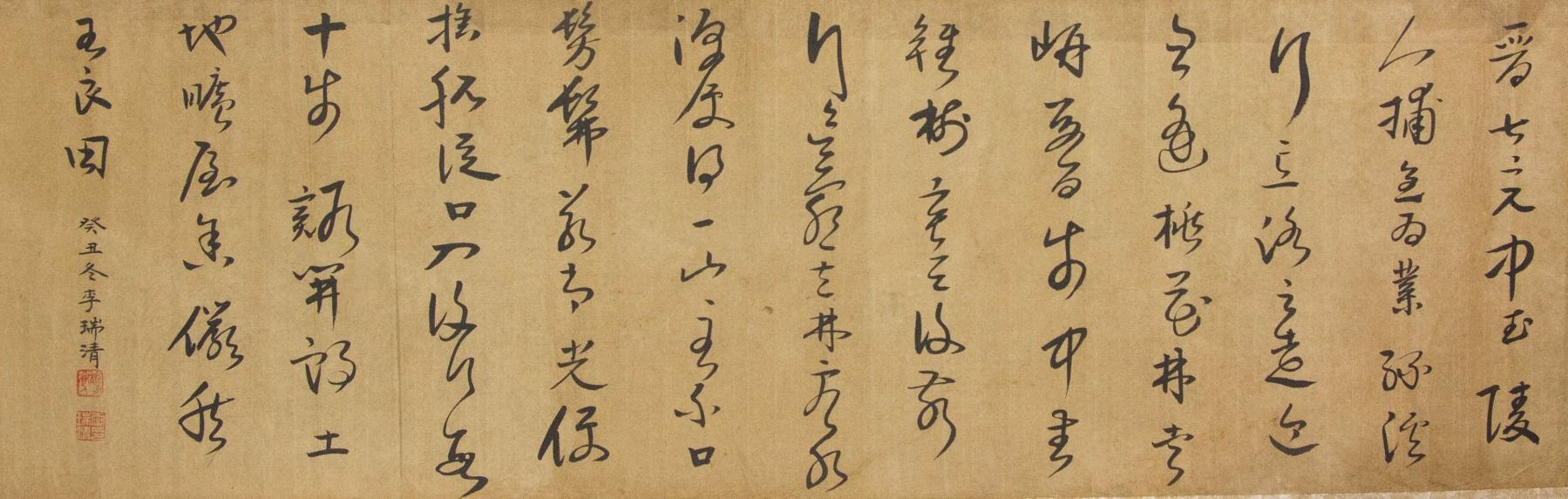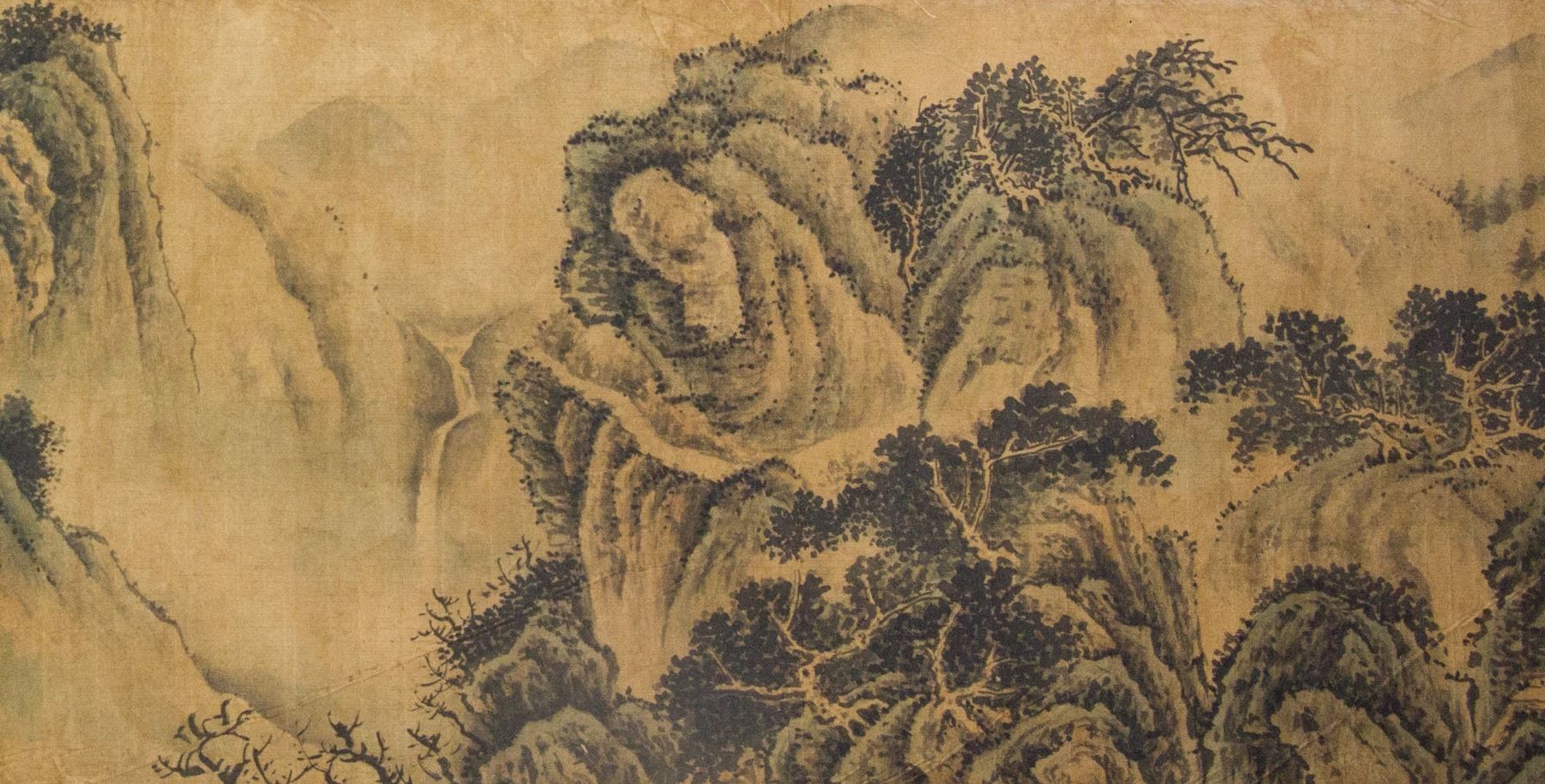 Mountainous landscape with river; Chinese ink and watercolour on paper; long hand scroll; signed Wu Li (1632-1718); inscribed with 2 artist seals; title and inscription written by Li Ruiqing (1867-1920); inscribed with 4 seals; 345 cm x 29.5 cm