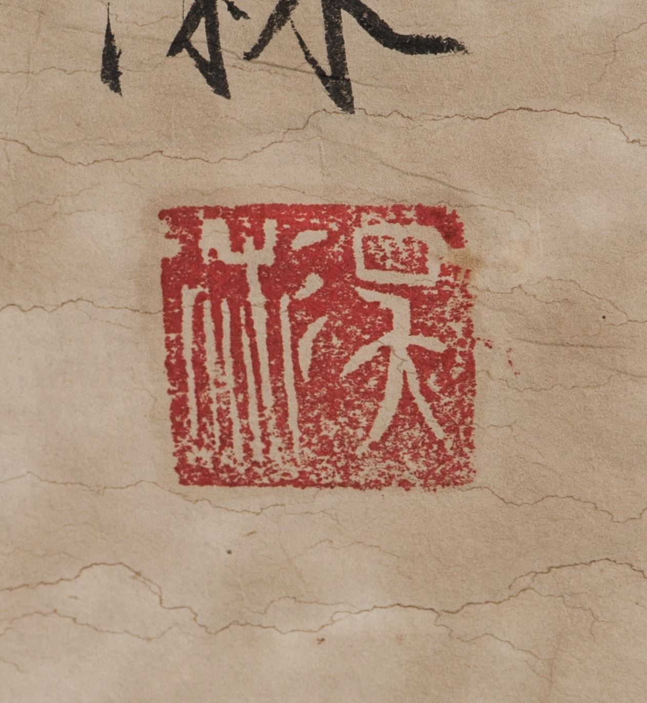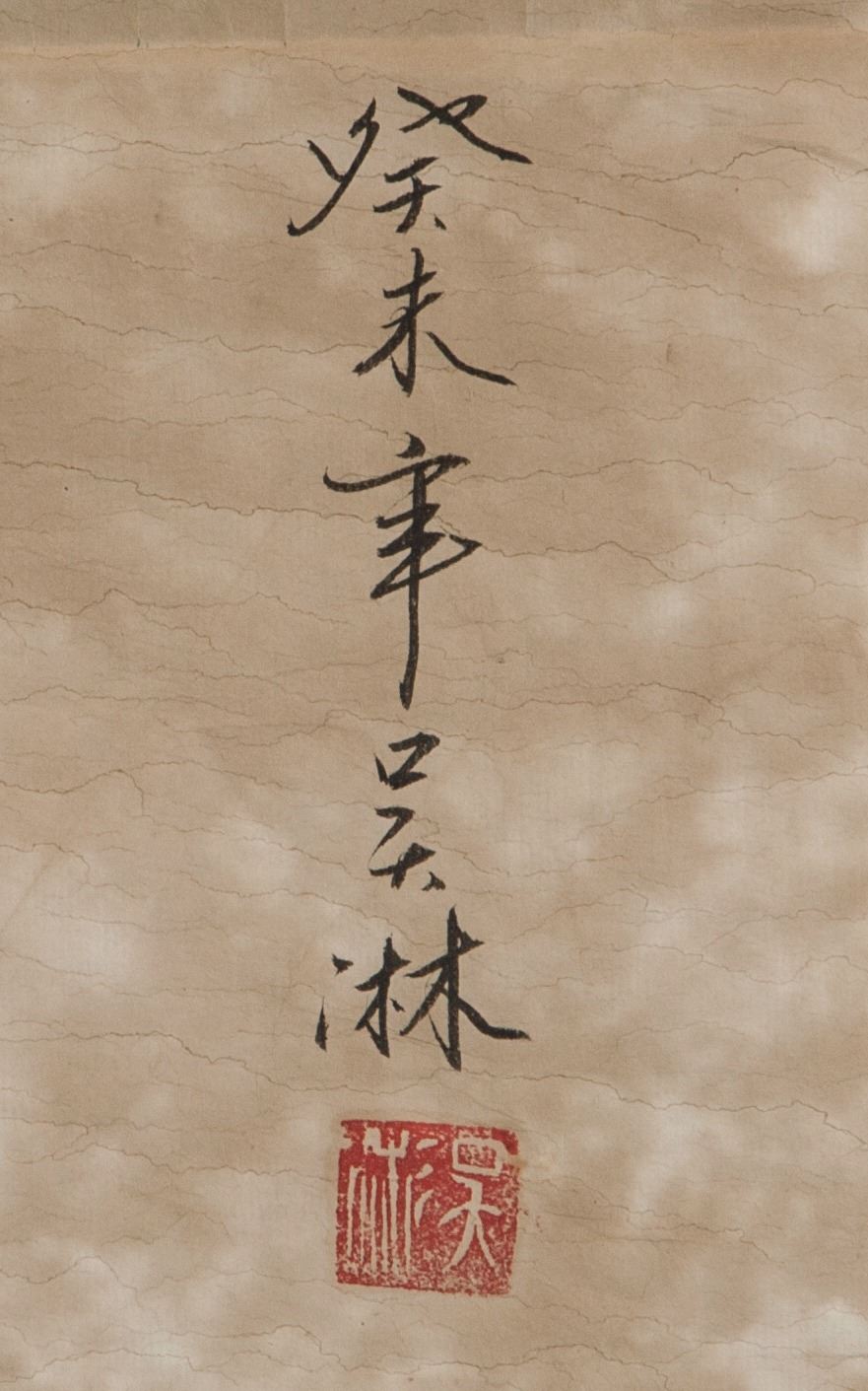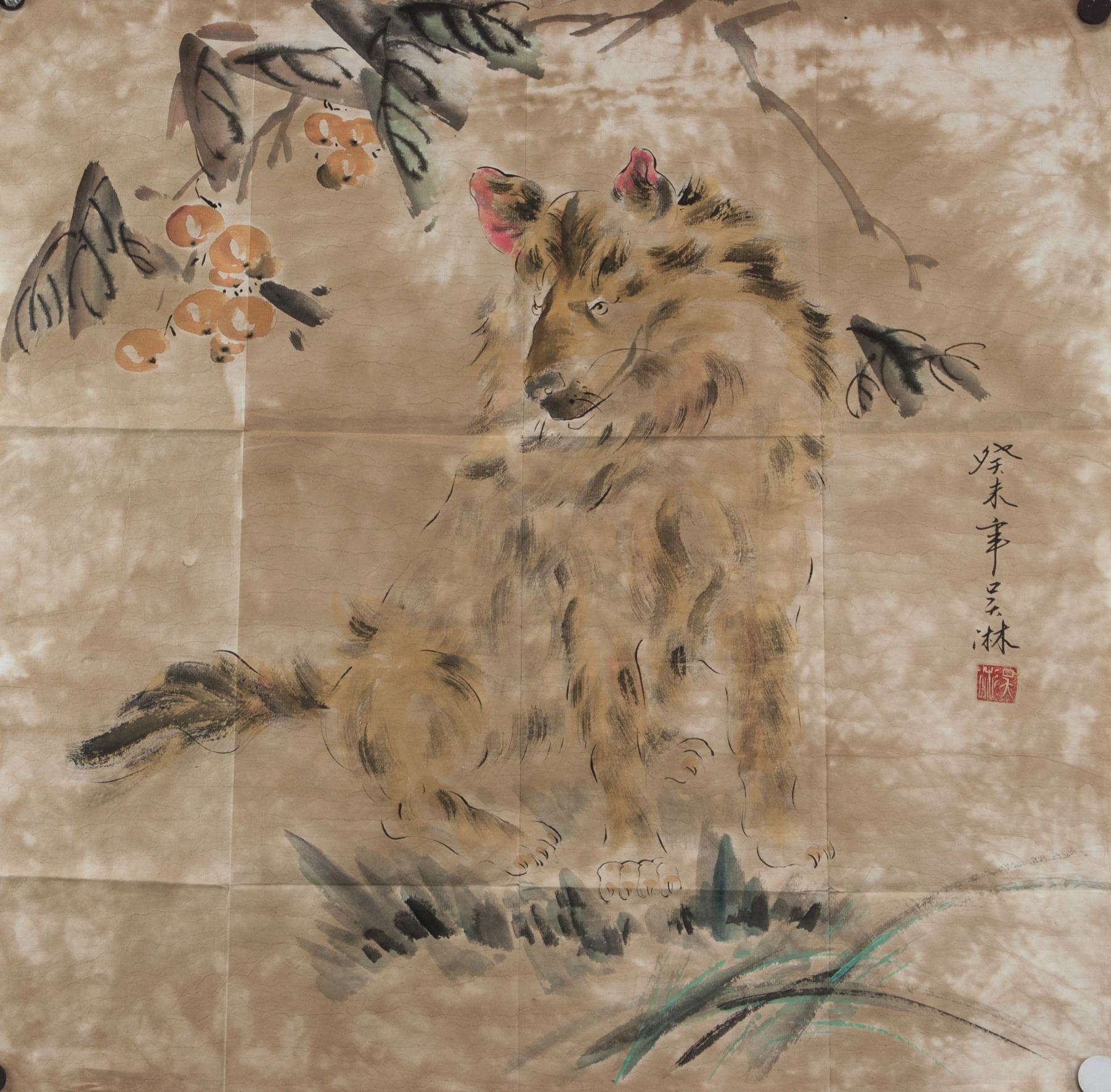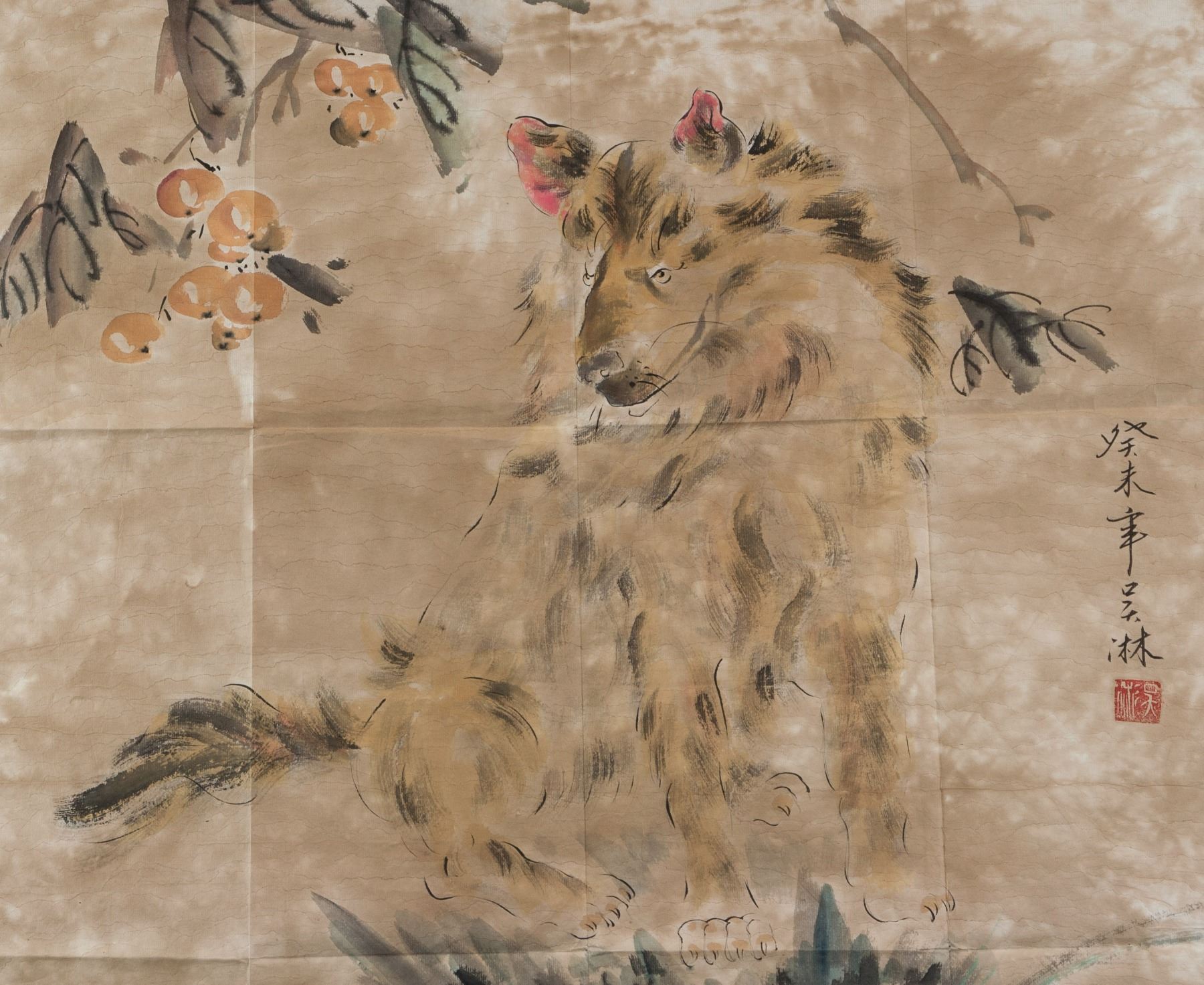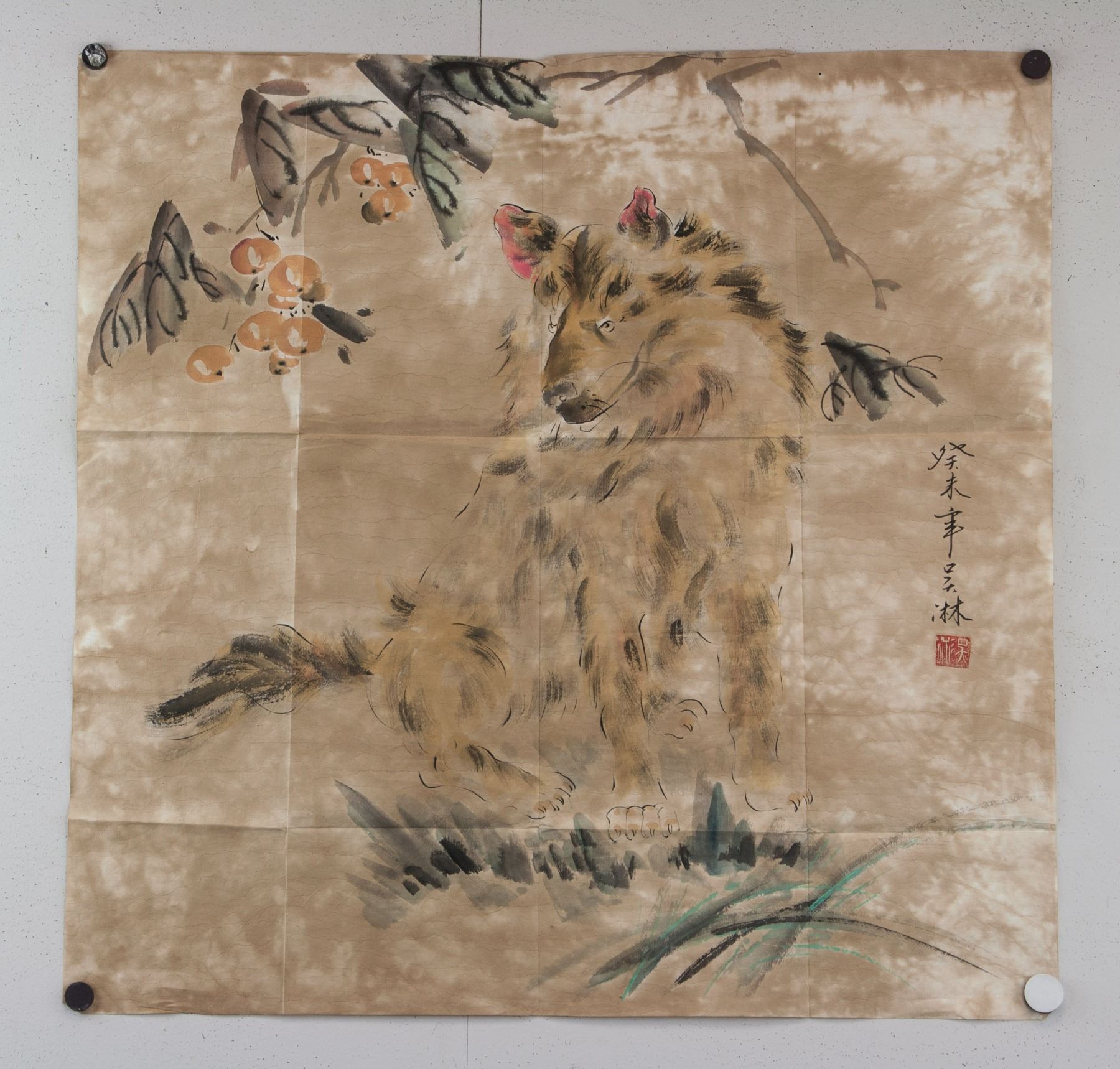 Painting of crouching dog; Chinese ink and watercolour on paper; signed Wu Lin; inscribed with 1 artist seal; 65 cm x 65 cm