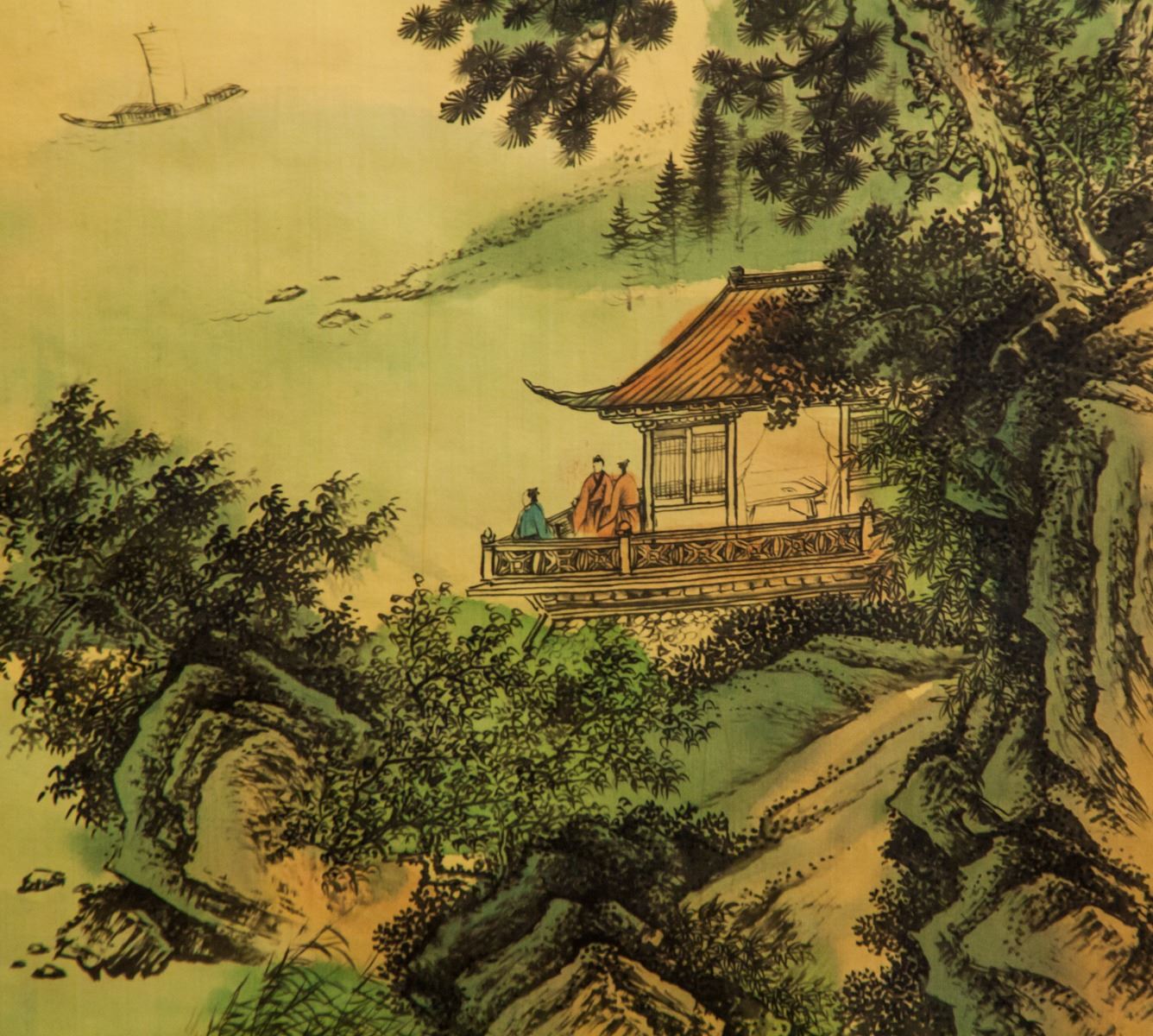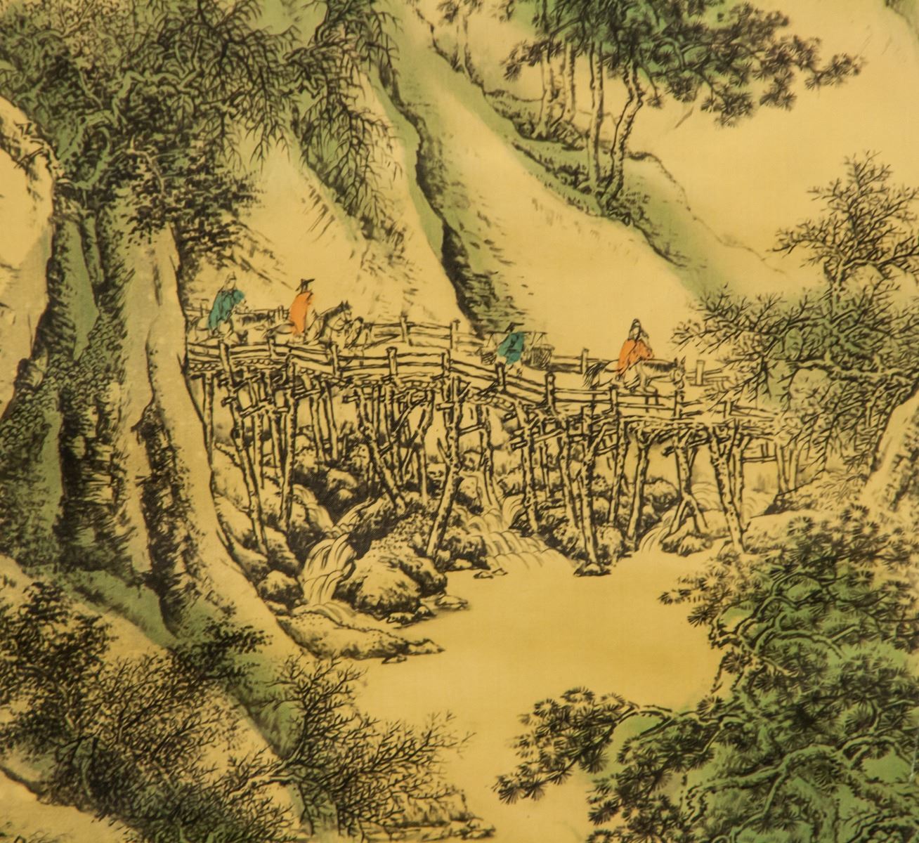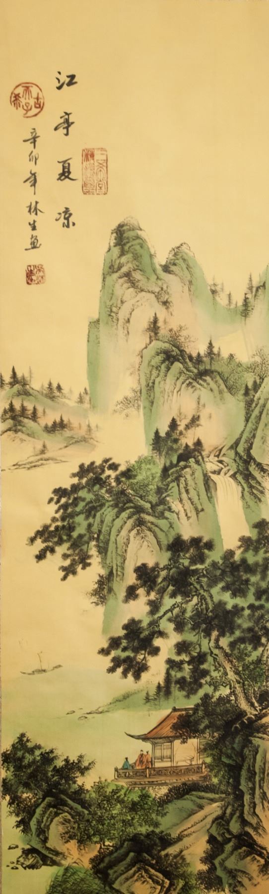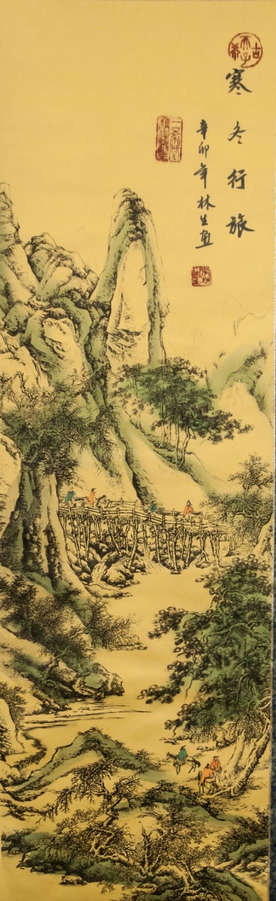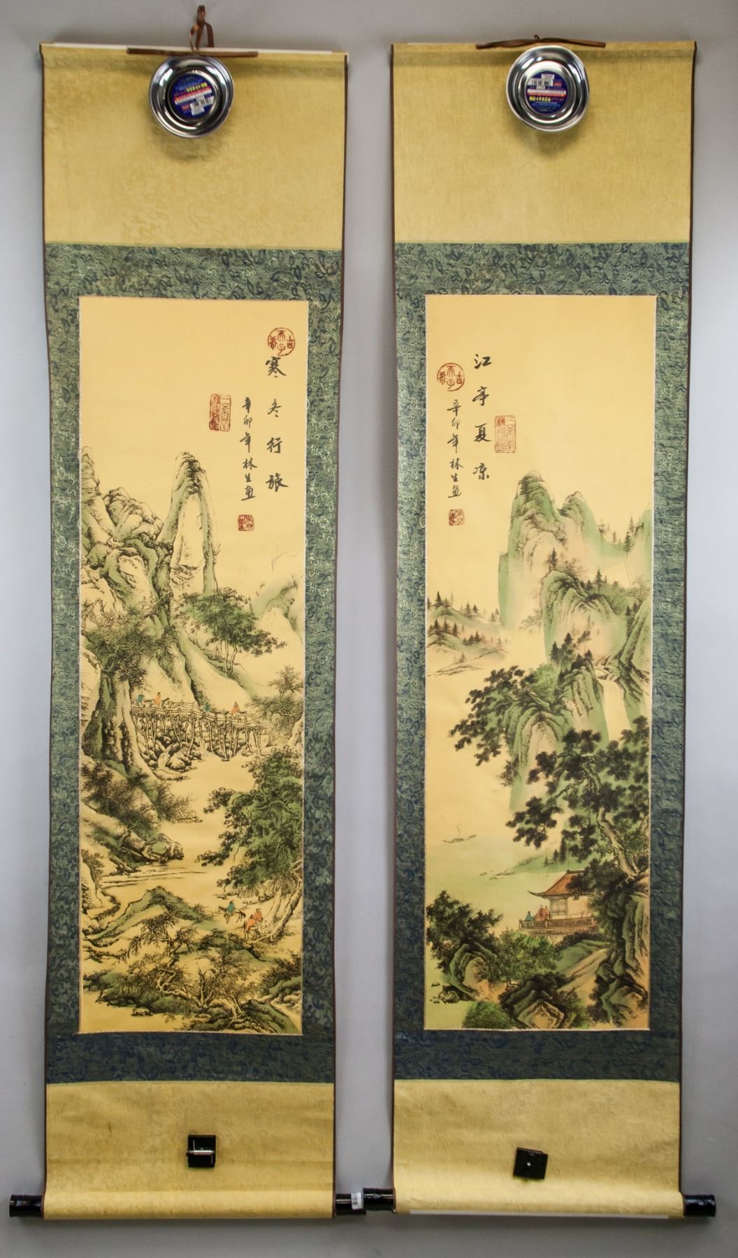 Print on paper, hanging scroll. Featuring pair of mountainous landscape. Originally signed Wu Linsheng. 15 x 60 cm each