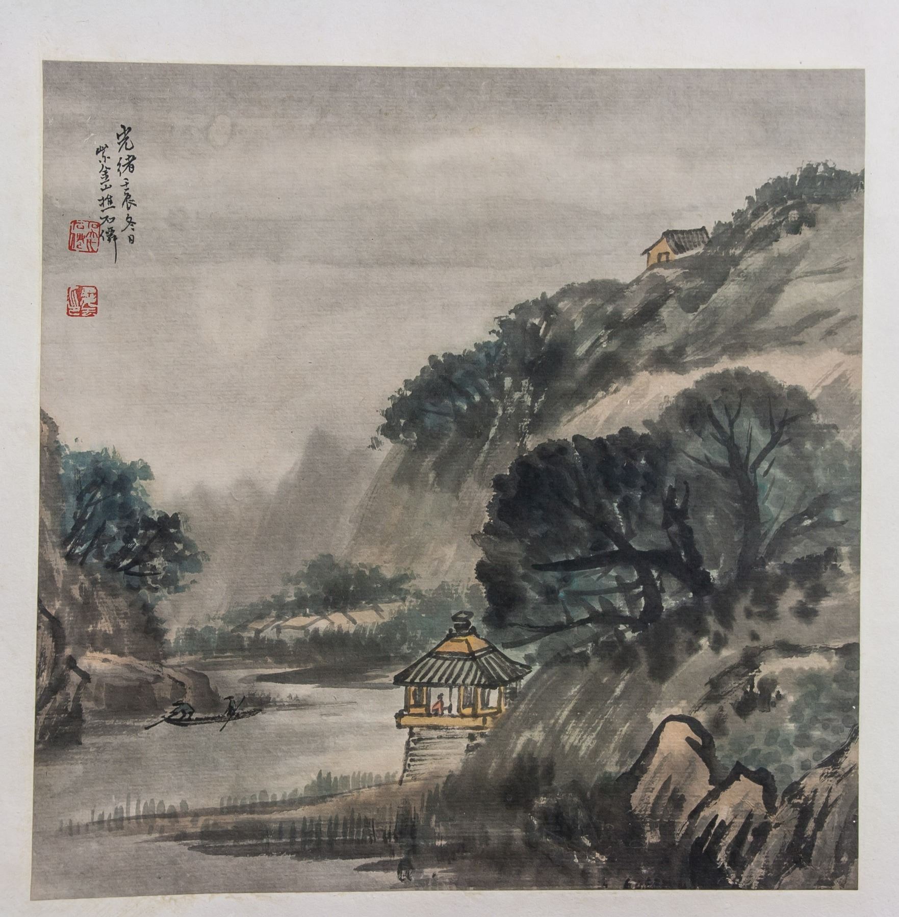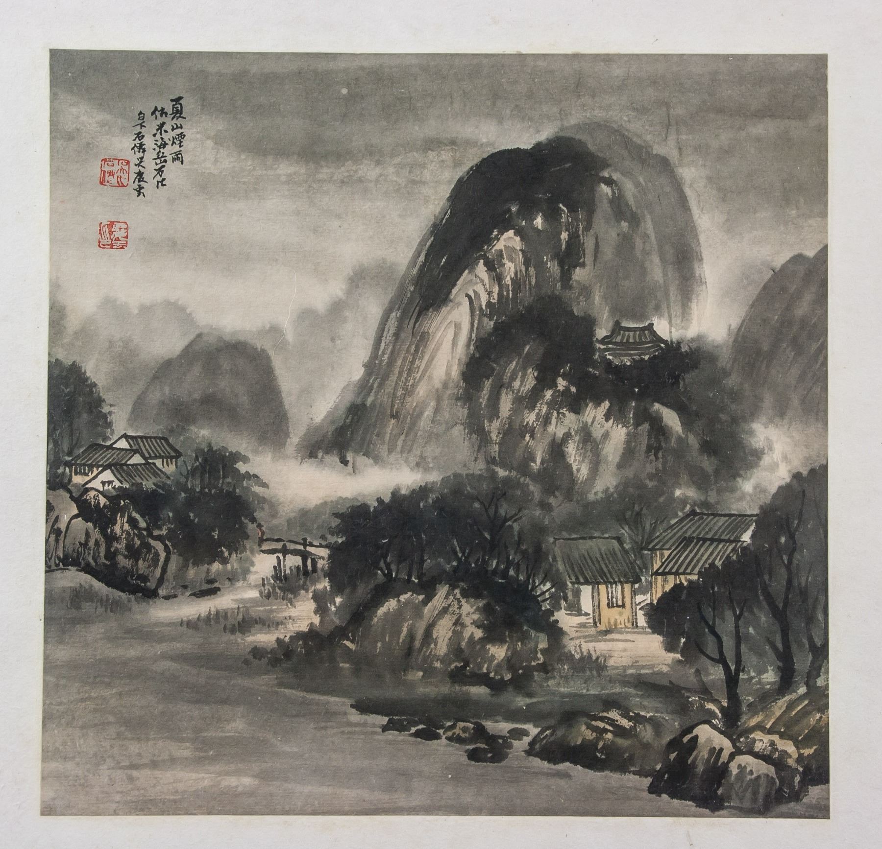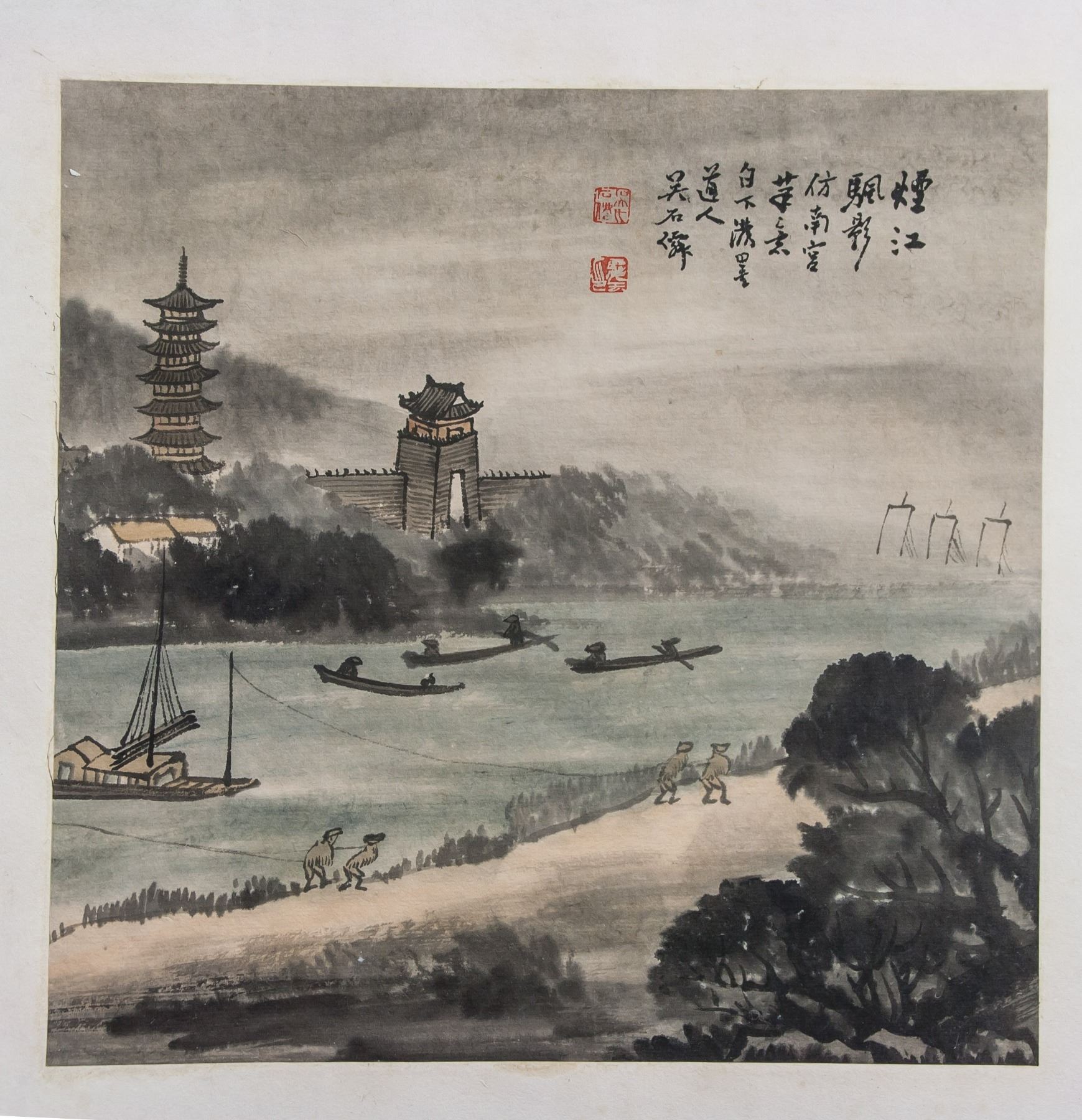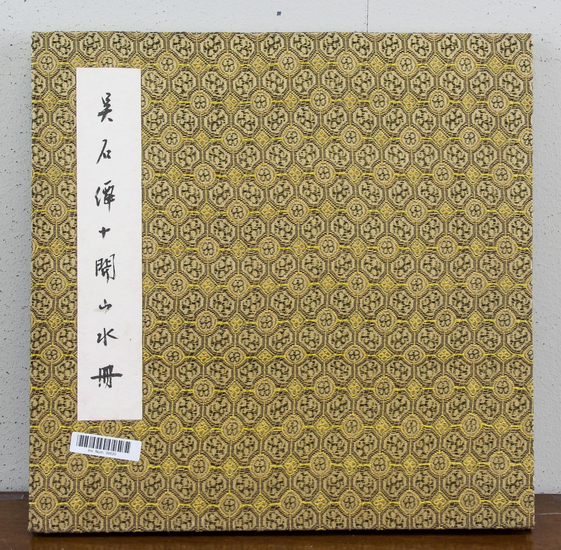 Watercolor and ink on paper booklet, featuring 10 pages of mountainous landscape. Signed Wu Shixian (1845-1916, Chinese), inscribed with 20 artist seals, 32 x 32 cm, Wu Shixian was a landscape painter of the Qing dynasty. Born in Nanjing in the Jiangsu province, Wu relocated to Shanghai, and, later, Japan.