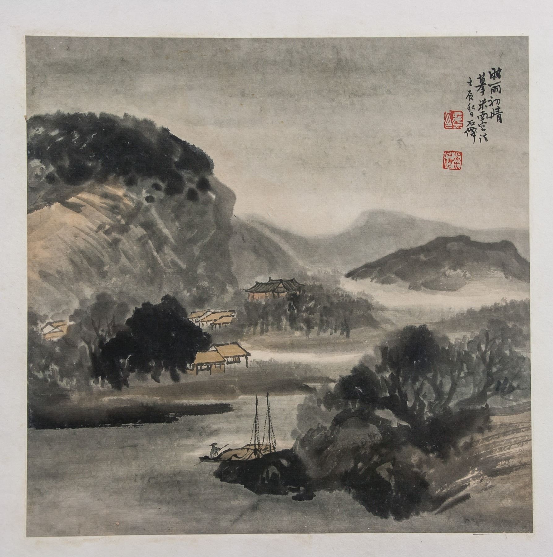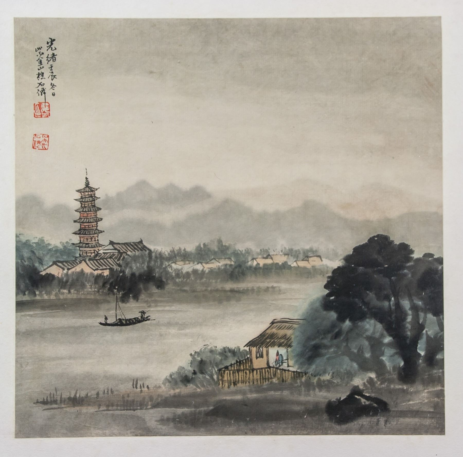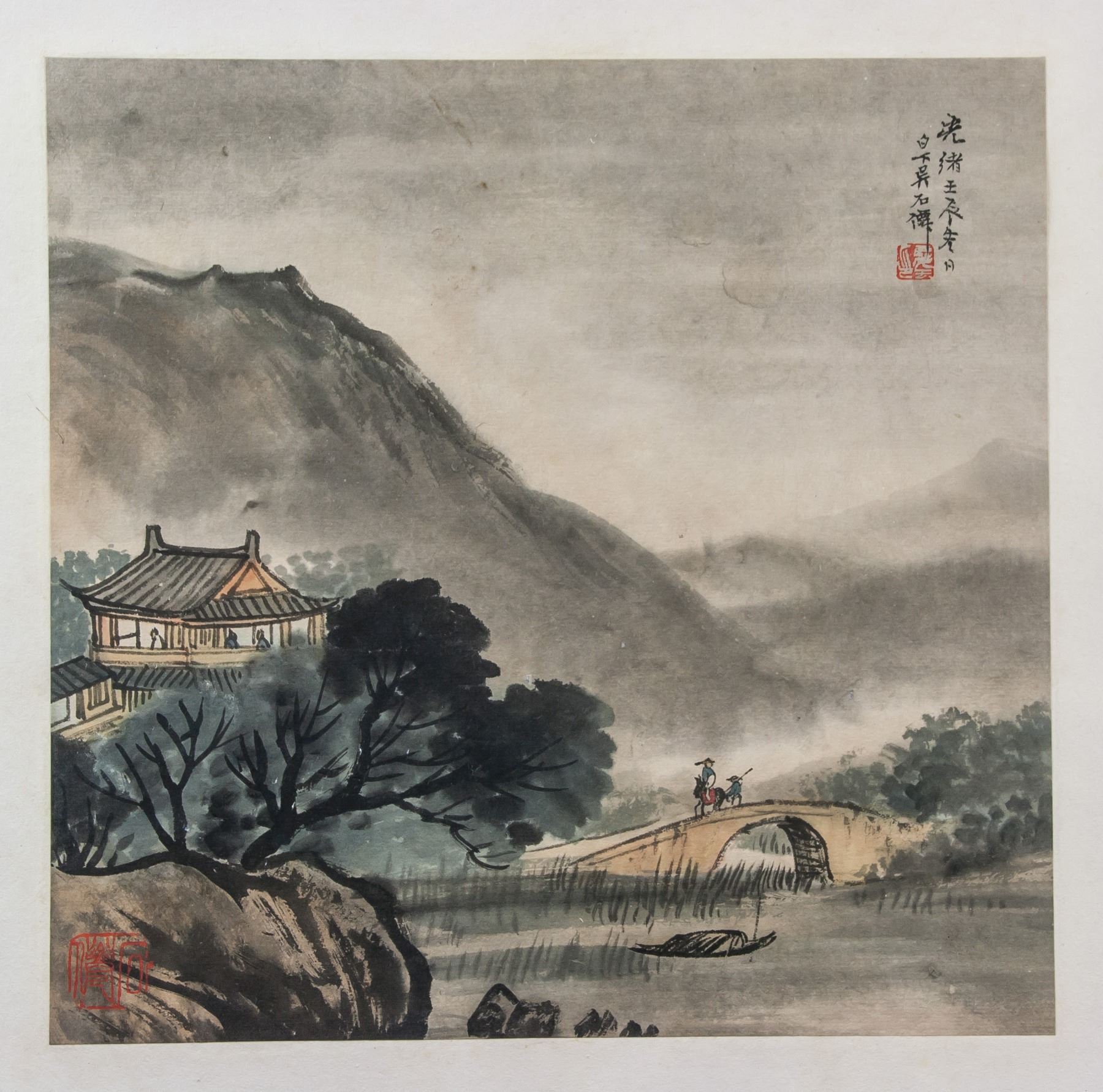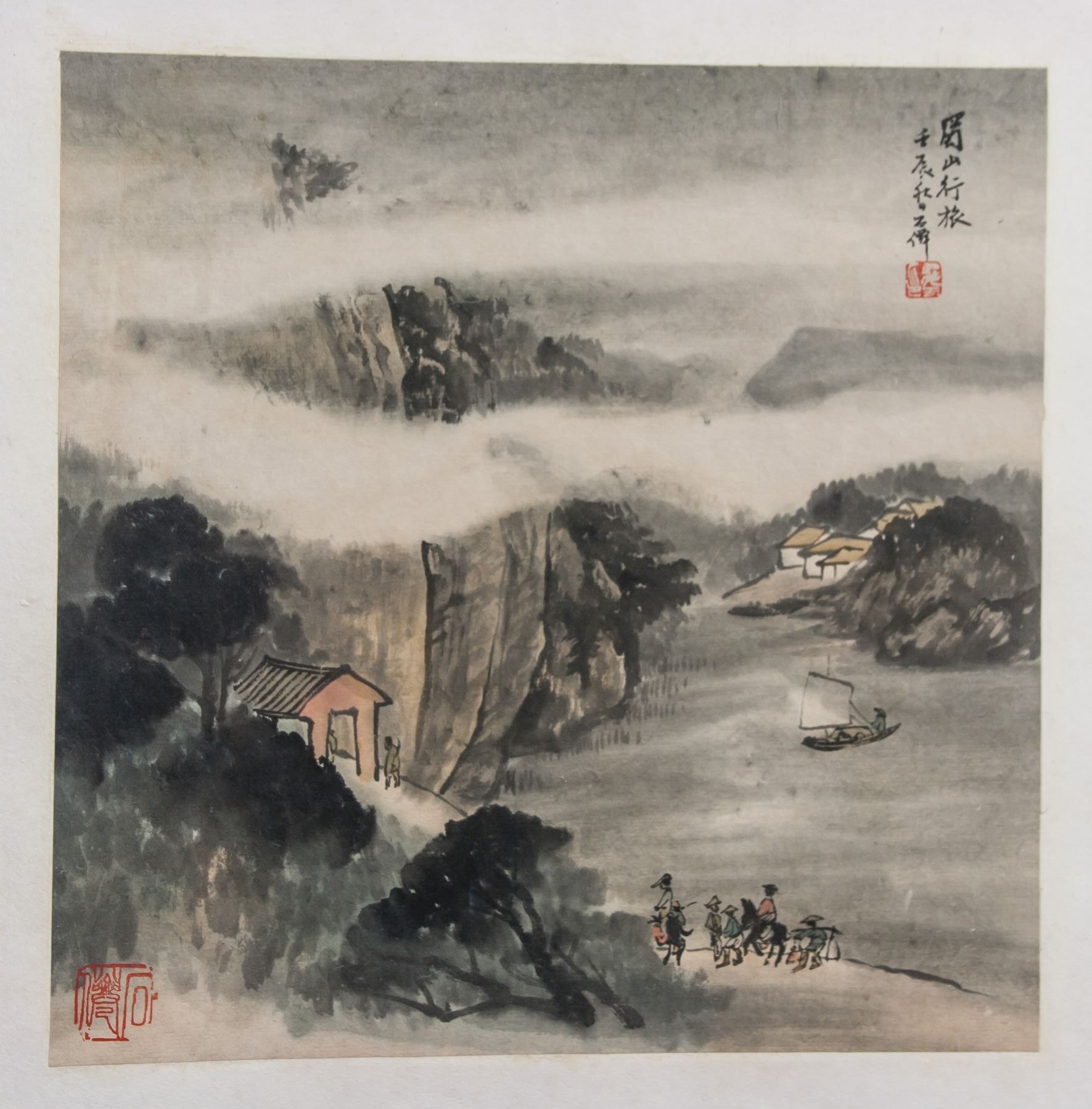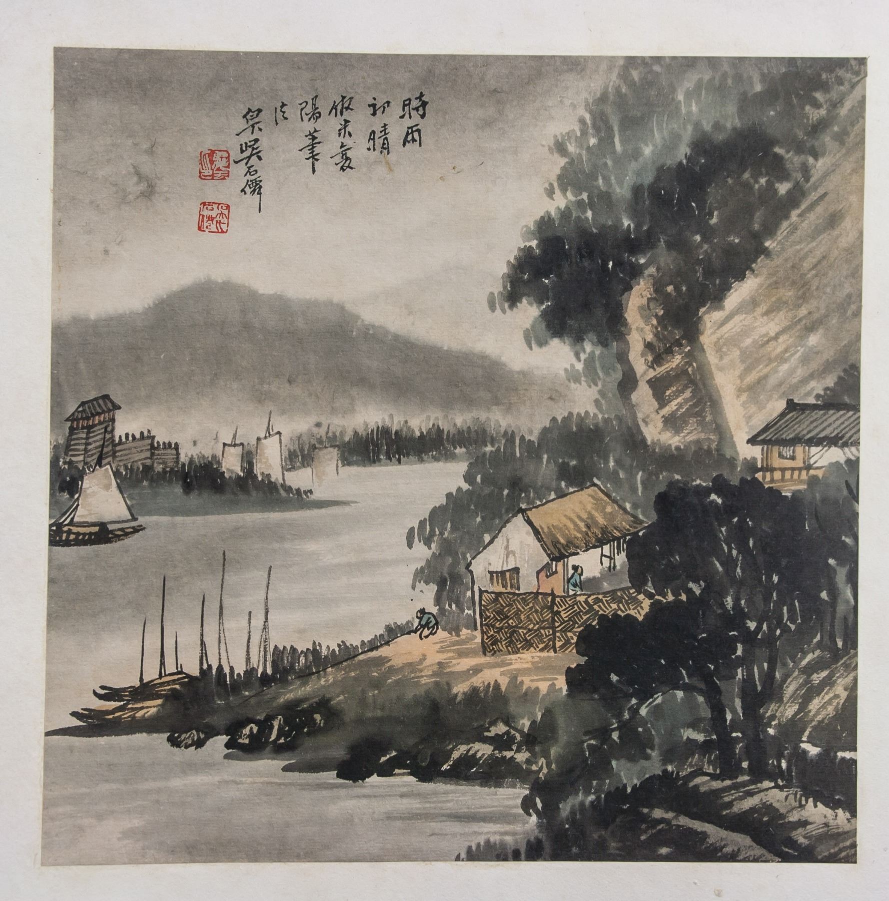 Watercolor and ink on paper booklet, featuring 10 pages of mountainous landscape. Signed Wu Shixian (1845-1916, Chinese), inscribed with 20 artist seals, 32 x 32 cm, Wu Shixian was a landscape painter of the Qing dynasty. Born in Nanjing in the Jiangsu province, Wu relocated to Shanghai, and, later, Japan.