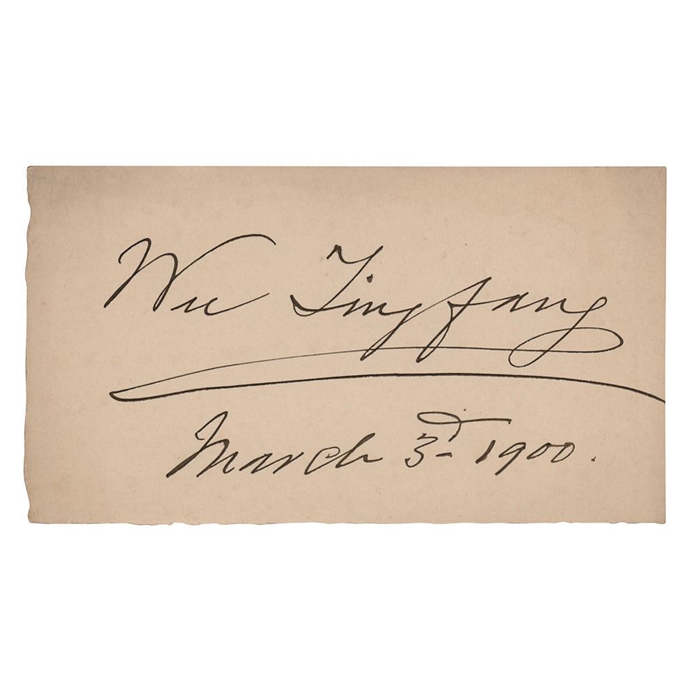 Chinese diplomat and politician (1842–1922) who served as Minister of Foreign Affairs and briefly as Acting Premier during the early years of the Republic of China; he was also known as Ng Choy or Ng Achoy. Neat ink signature, "Wu Ting fang, March 3d–1900,” on an off-white 5 x 3 sheet. In fine condition.