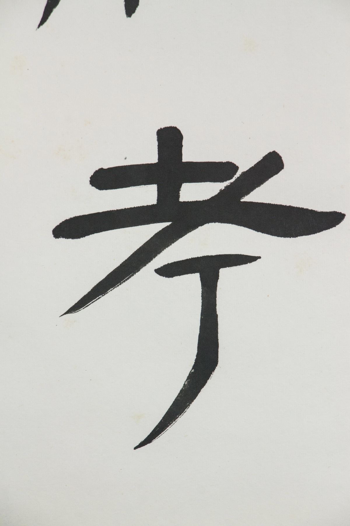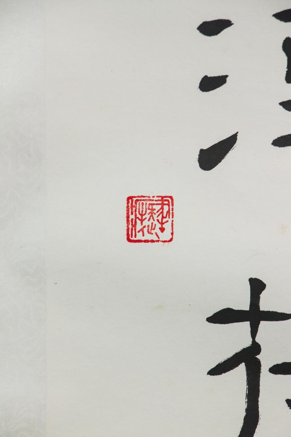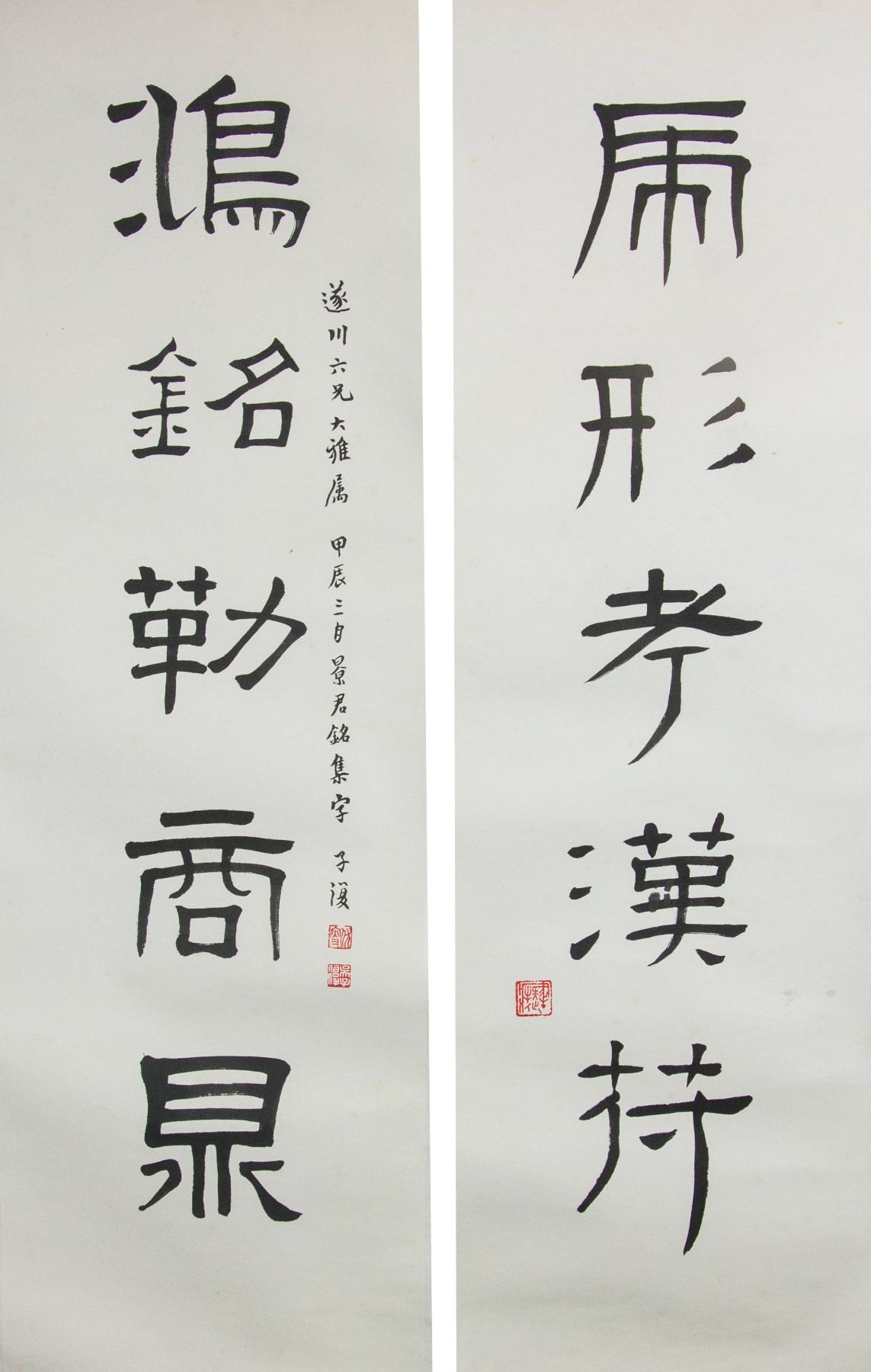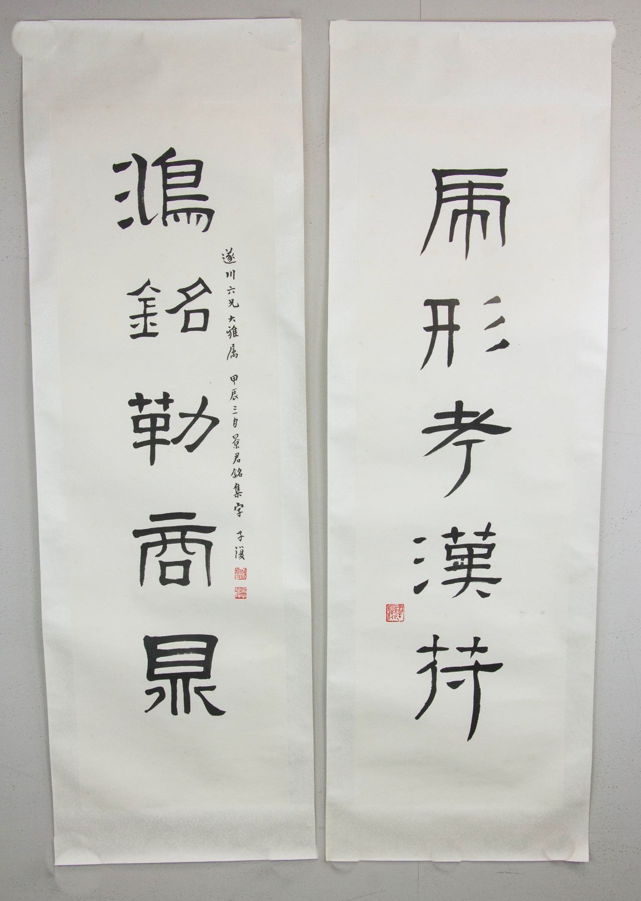 One pair Chinese calligraphy; Chinese ink on paper roll; signed Wu Zifu (1899-1979); inscribed with 3 artist seals; 111 cm x 34.5 cm