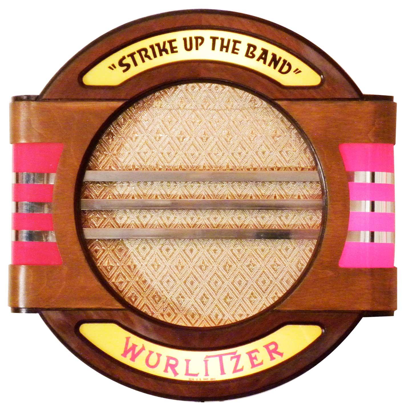Contemporary Wurlitzer Juke Box Accessory Speaker Model #39-A made by Antique Apparatus. Known as "Strike up the band". Pre war round wooden case. Excellent working condition. 18 X 17 1/2 X 8 1/2 inches.