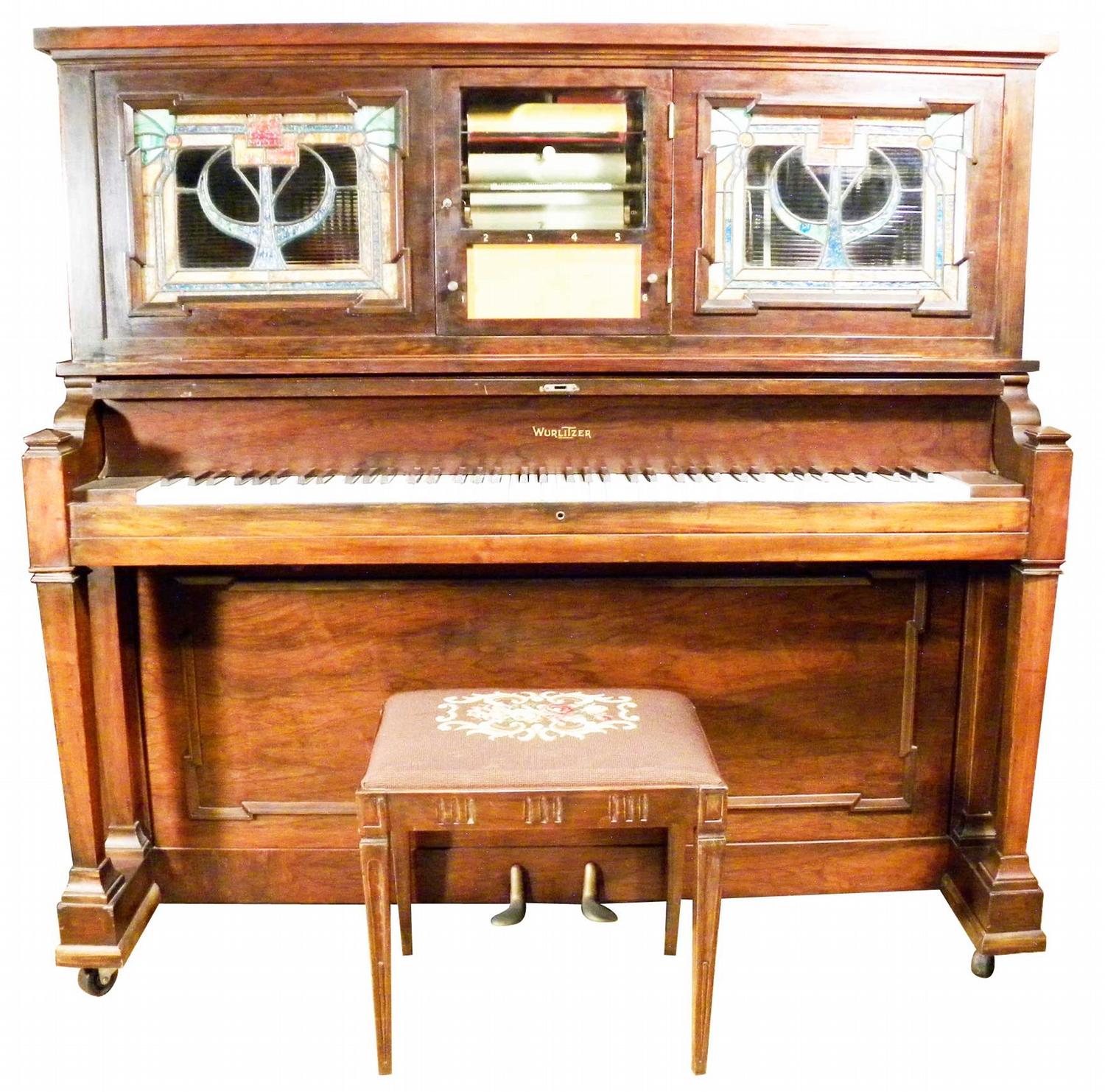 Wurlitzer AX Nickelodeon with 38 Violin Pipes and roll changer. Ca. 1925. Only one known to exist with art glass, originally had carved violin front motif. Mahogany case. Excellent working condition. 63 X 59 1/2 X 32 inches.