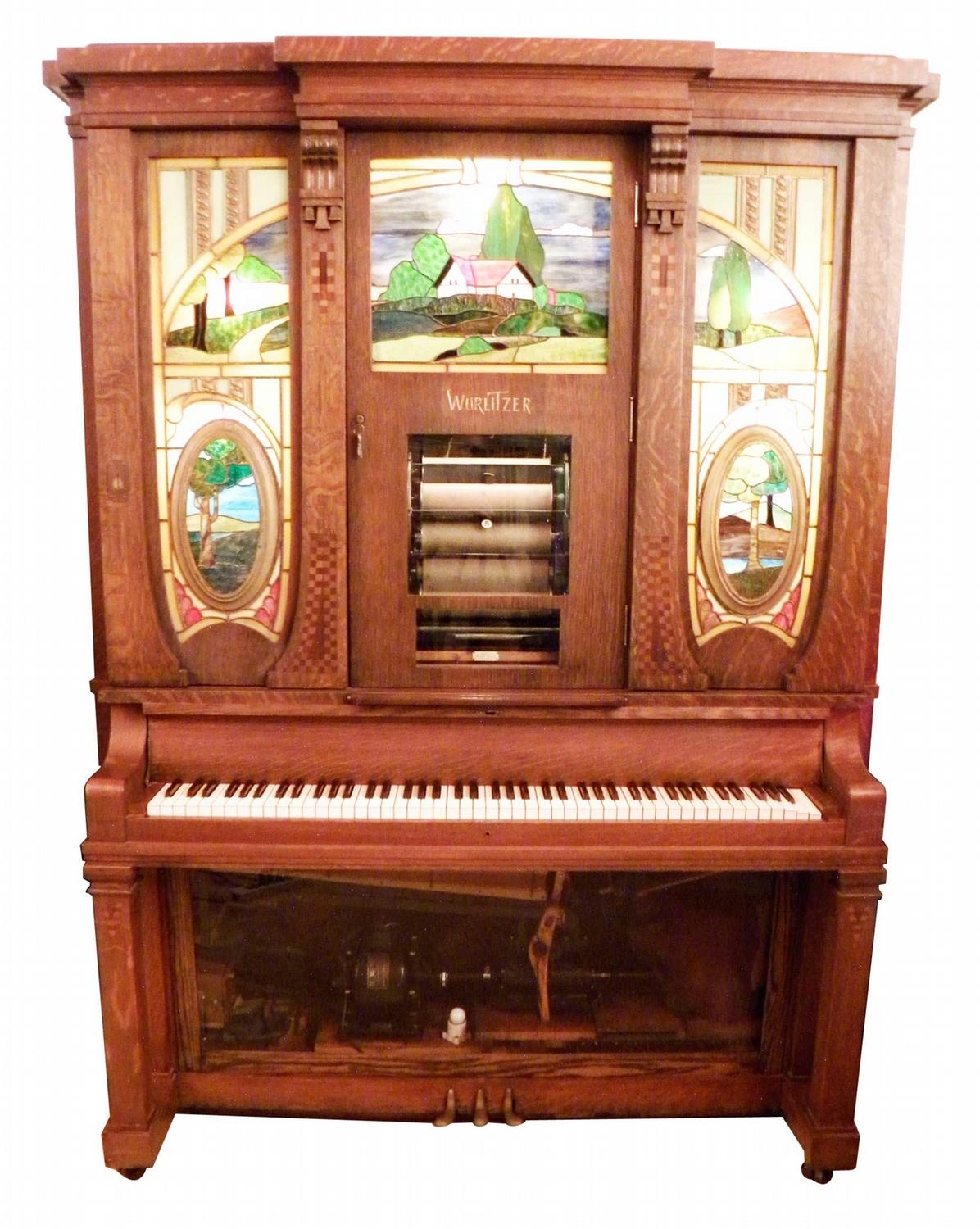 Wurlitzer BX Nickelodeon with automatic roll changer. Patent date 1912. Plays special rolls unique to machine. Beautiful quarter sawn oak cabinet with inlaid wood and art glass front. Plays seven instruments including bells, pipes, triangle, 2 drums, mandolin and piano. Good working condition. 64 X 82 1/2 X 28 1/2 inches.