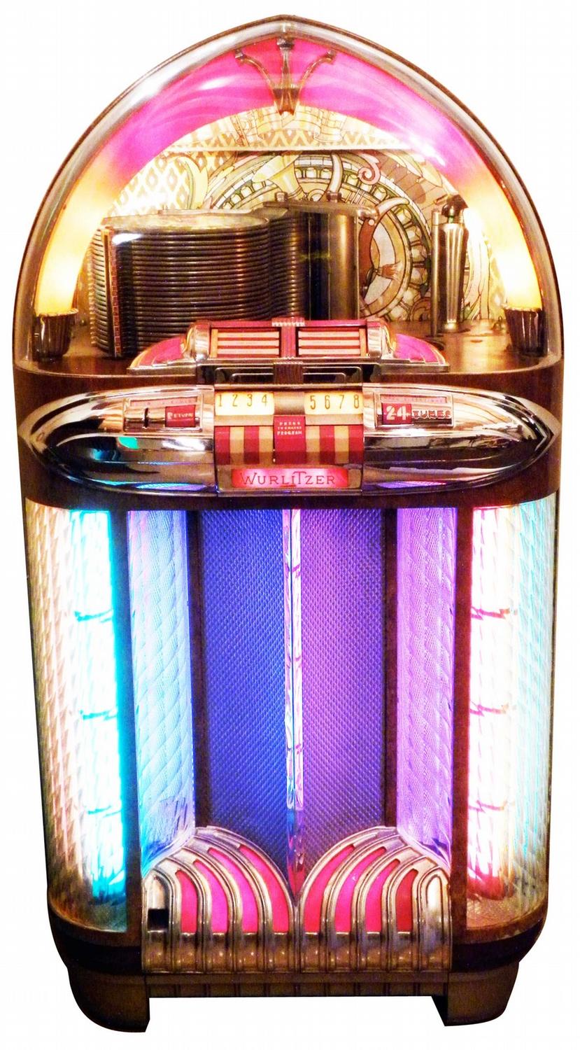 Wurlitzer Juke Box Model 1100, 1948-1949. First juke box made to incorporate the sensational Zenith Cobra Tone Arm and the first to use a ceramic cartridge rather than a magnetic one. Very colorful and desirable. First 24 record program with revolving selector that speeds up selection by serving up 8 numbers at a time. 5/10/25 cent play. Full of set of 78 RPM records. Complete with coin. Excellent working condition comes with key. 30 X 58 X 26 inches.