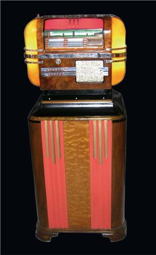 Wurlitzer Jukebox Model # 41. Counter model, rarest and lowest produced models. On original 410 stand, made only for the 41. Plastics all original none broken, no marbling in upper plastics. Myrtle Burl Veneer and Ebony Base. Holds 12 records. Restored and conserved in working condition. 22 X 52 X 22 inches.