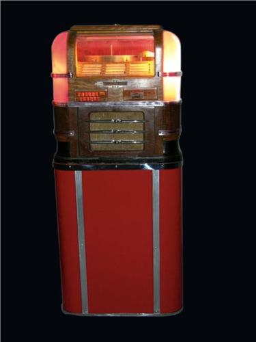 Wurlitzer Jukebox Model # 61. Illuminated plastic corners. Quilted Maple and California walnut with ebony finish base on after market stand made in 1940s. Metal painted otherwise excellent original condition. Complete with coin and in working condition. 22 X 50 X 19 inches.