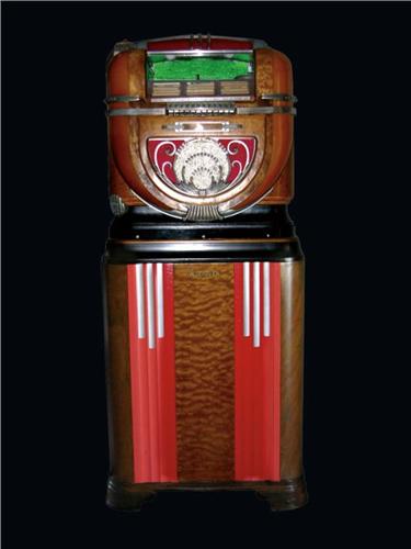 Wurlitzer Jukebox Model # 71 on Rare original 710 base. Myrtle Burl and Selected Straight Grained Walnut Veneers with Ebony Base and Illuminated Plastics at two front corners. 12 Record Capacity. All original and complete with original unpolished plastics, no cracks. Complete with coin. Excellent Condition. 24 X 57 X 19 inches.