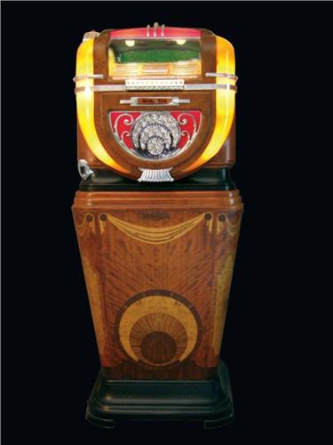 Wurlitzer Jukebox Model # 71 with Rare Original Mae West stand. Myrtle Burl and Selected Straight Grained Walnut Veneers with Ebony Base and Illuminated Plastics at two front corners. 12 Record Capacity. All original and complete with original unpolished plastics, no cracks. Complete with coin. Excellent Condition. 24 X 57 X 19 inches.