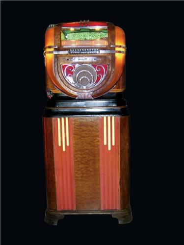 Wurlitzer Jukebox Model # 71 on original 710 stand. Myrtle Burl and Selected Straight Grained Walnut Veneers with Ebony Base and Illuminated Plastics at two front corners. 12 Record Capacity. Original unpolished plastics and polished castings, complete with coin and keys, works. Overall dimensions 24 X 58 X 19 inches.
