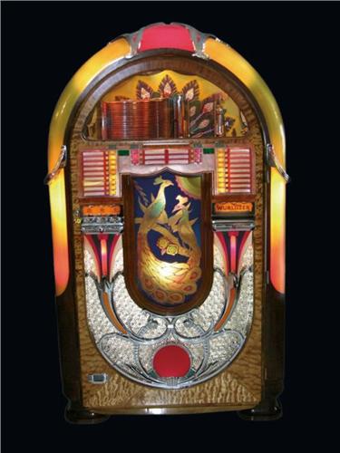 Wurlitzer Jukebox Model # 850 Peacock. One of the most desired for advanced collectors. Complete with coin, polished castings, conserved to original working condition and poised to light up your game room. 40 X 67 X 26 inches.