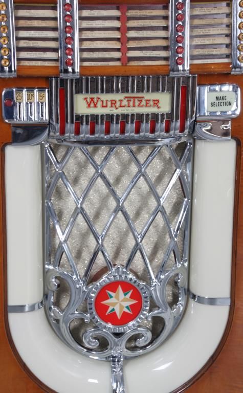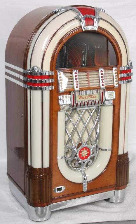 Wurlitzer Model 1015 Jukebox – 1946. Beautiful floor model Jukebox popularly known as “The Bubbler”, has a walnut and maple veneered case with arched top, colorful red and white plastics with bubbling tubes and colorful rotating cylinders behind them bringing the front of the Jukebox to life. Highlighted with chromed escutcheons and grill in front of the speaker, mosaic mirrored borders along the sides, plays 24 records and has a receiver for nickels, dimes and quarters. Signed on a metal tag with model number 1015 and serial number on tag and stamped in case 1025081, case is nicely redone. Good working condition. 60 in. high x 33 in. wide x 24 in. deep