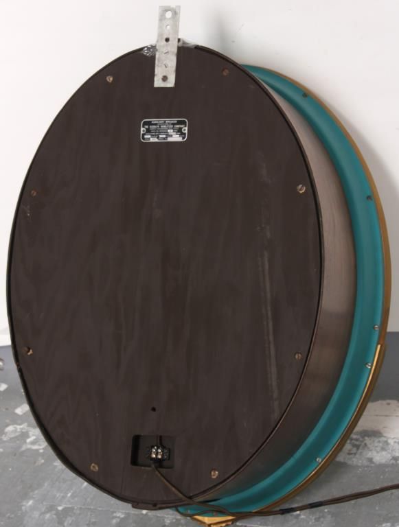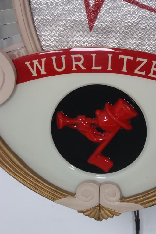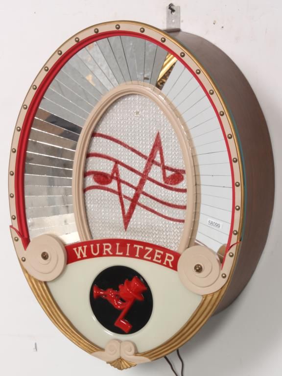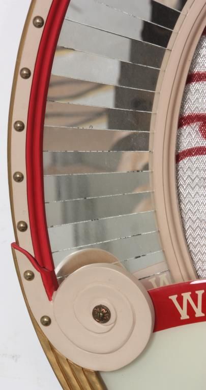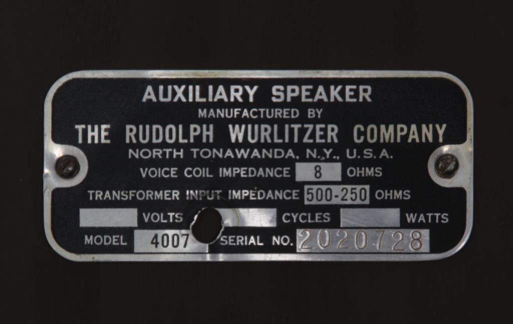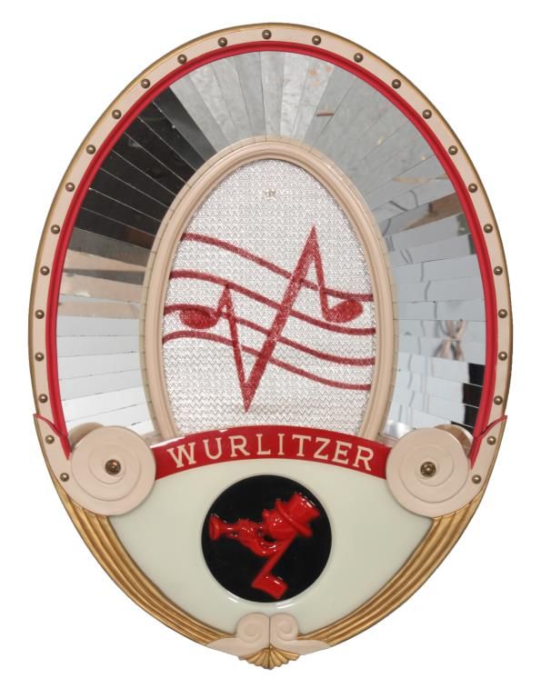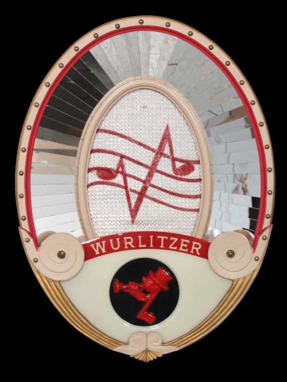 Wurlitzer Model 4007 Auxiliary Speaker. Oval wall mounted speaker has a mahogany body with teal and gold painted frame and decorative brass tacks in the front, has a vacuum-formed Johnny-One-Note logo in the front and rotating light-up color wheel behind it projecting colorful rays against the mirrored border. Metal tag reads Auxiliary Speaker, Manufactured by The Rudolph Wurlitzer Company with model number 4007 and serial number 2020728. In very good condition, 30.5 in. high x 23 in. wide.