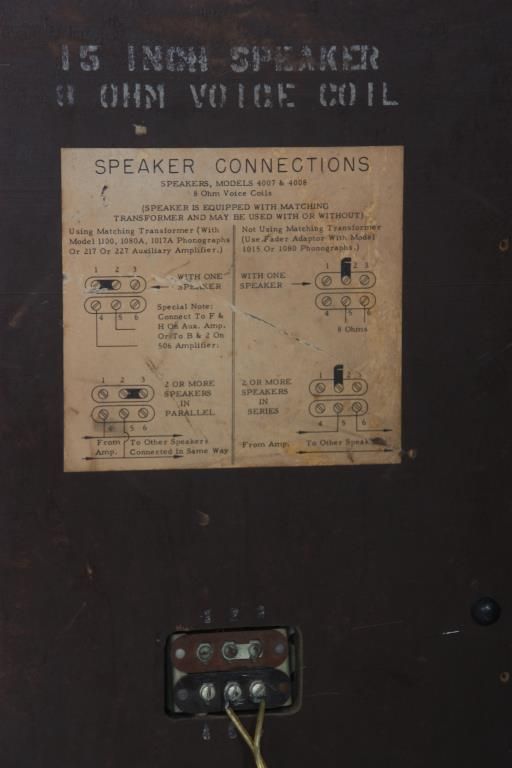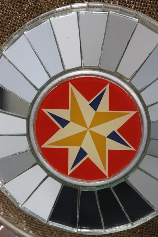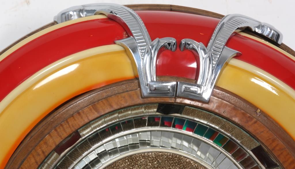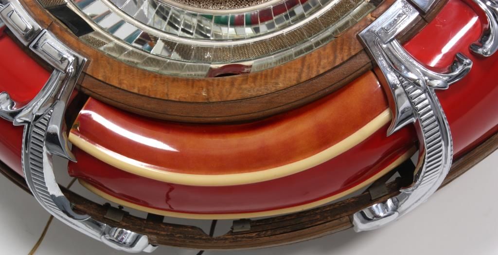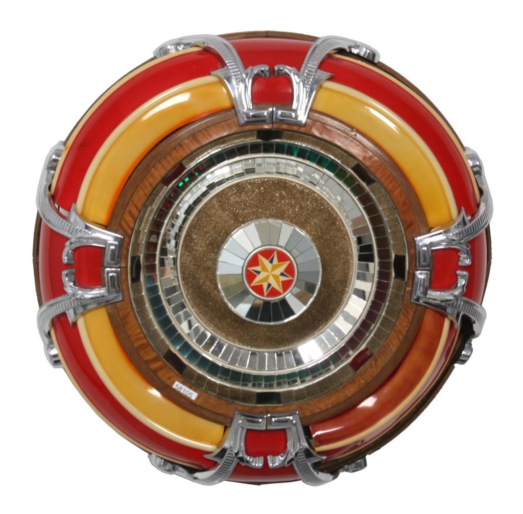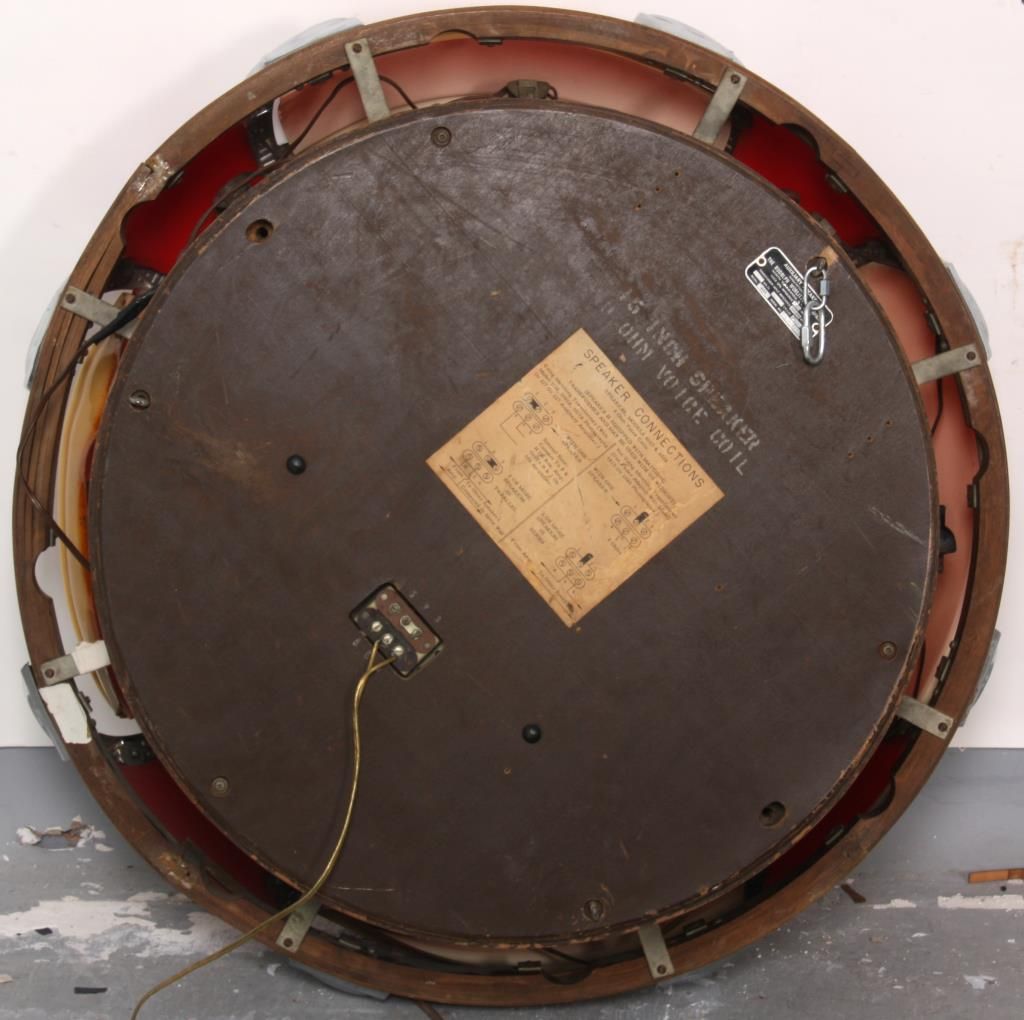 Wurlitzer Model 4008 Jukebox Speaker. Elaborate and large sized speaker, will mount to the wall or ceiling; has a mosaic mirrored rotating center hub with vibrant light-up color wheel behind it which reflects against the 3 row geometric mosaic border around the speaker cover; has a walnut case and frame with fancy chromed mounts and 8 red and yellow curved plastics bordering the outer edge of the speaker and lit up from behind. Signed on a metal tag on the back with model number 4008 and serial number 2030917. In good overall condition one of the plastic border pieces is shrunken and warped from heat. 32 in. dia. x 16 in. deep.