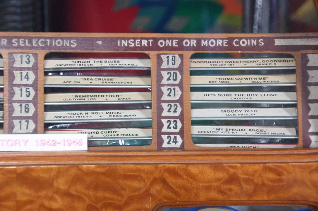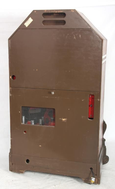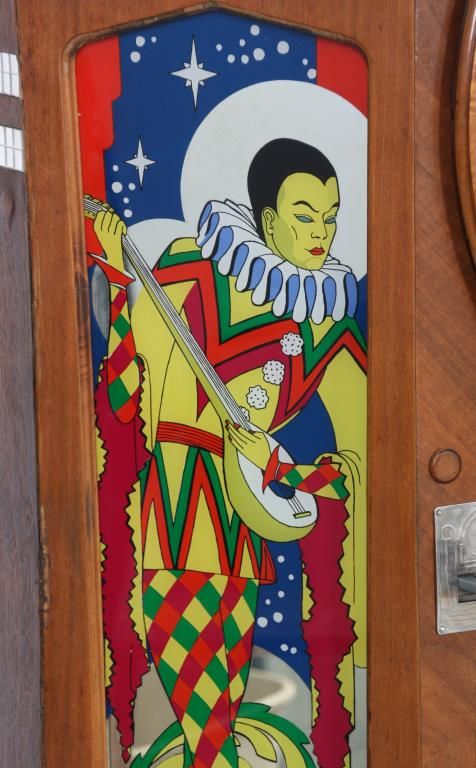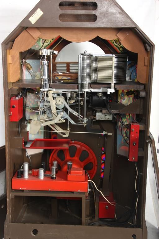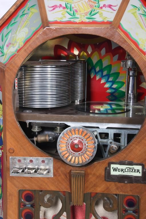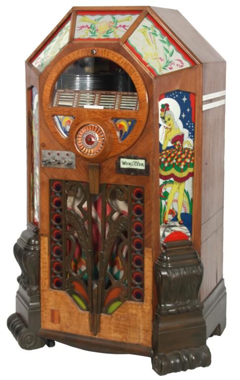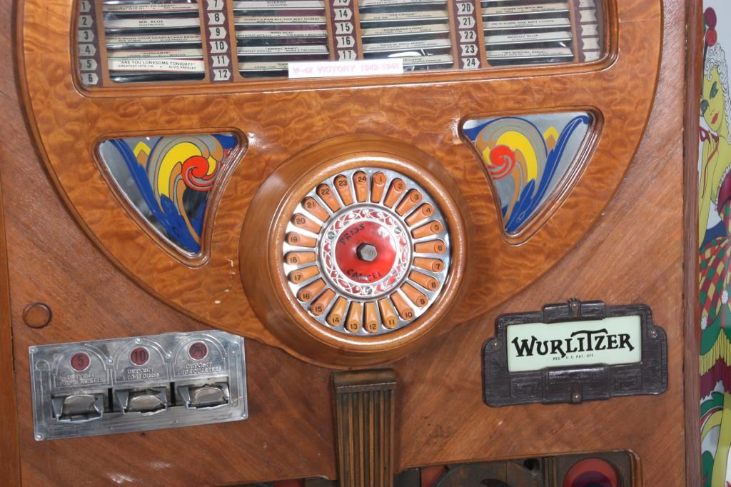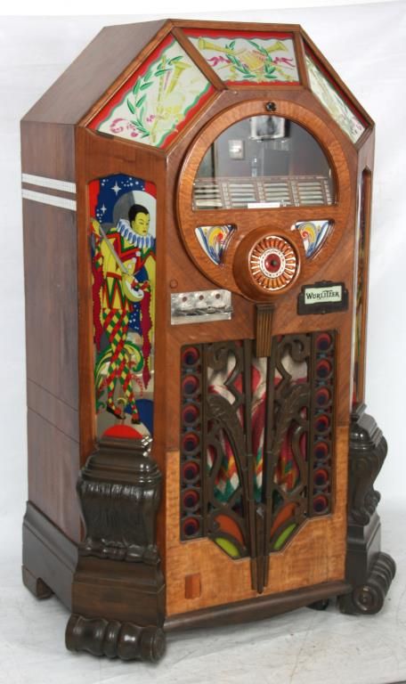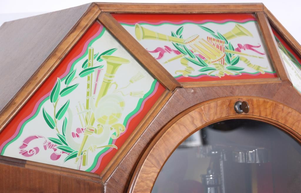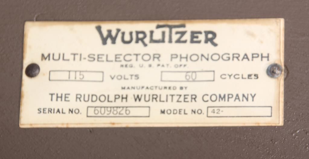 Wurlitzer Model 42 Jukebox – 1942. Also titled “Victory”, the wood veneered case has a trapezoidal shaped top with chamfered mirrors on the corners, obverse painted with figures and filigree on the sides and musical instruments on the crest panels; the carved wood speaker grill is overlaid on painted glass panels, carved wood corbels and feet on the corners. Case has some repairs to the veneer, coin return is missing and covered with a shield shaped escutcheon. The model 42 was shipped as only a cabinet from the factory and could be adapted to several different selector mechanisms. Signed on a paper tag on the back with model number 42 and serial number 609826. Good working condition. 66 in. high x 42 in. wide x 28 in. deep.