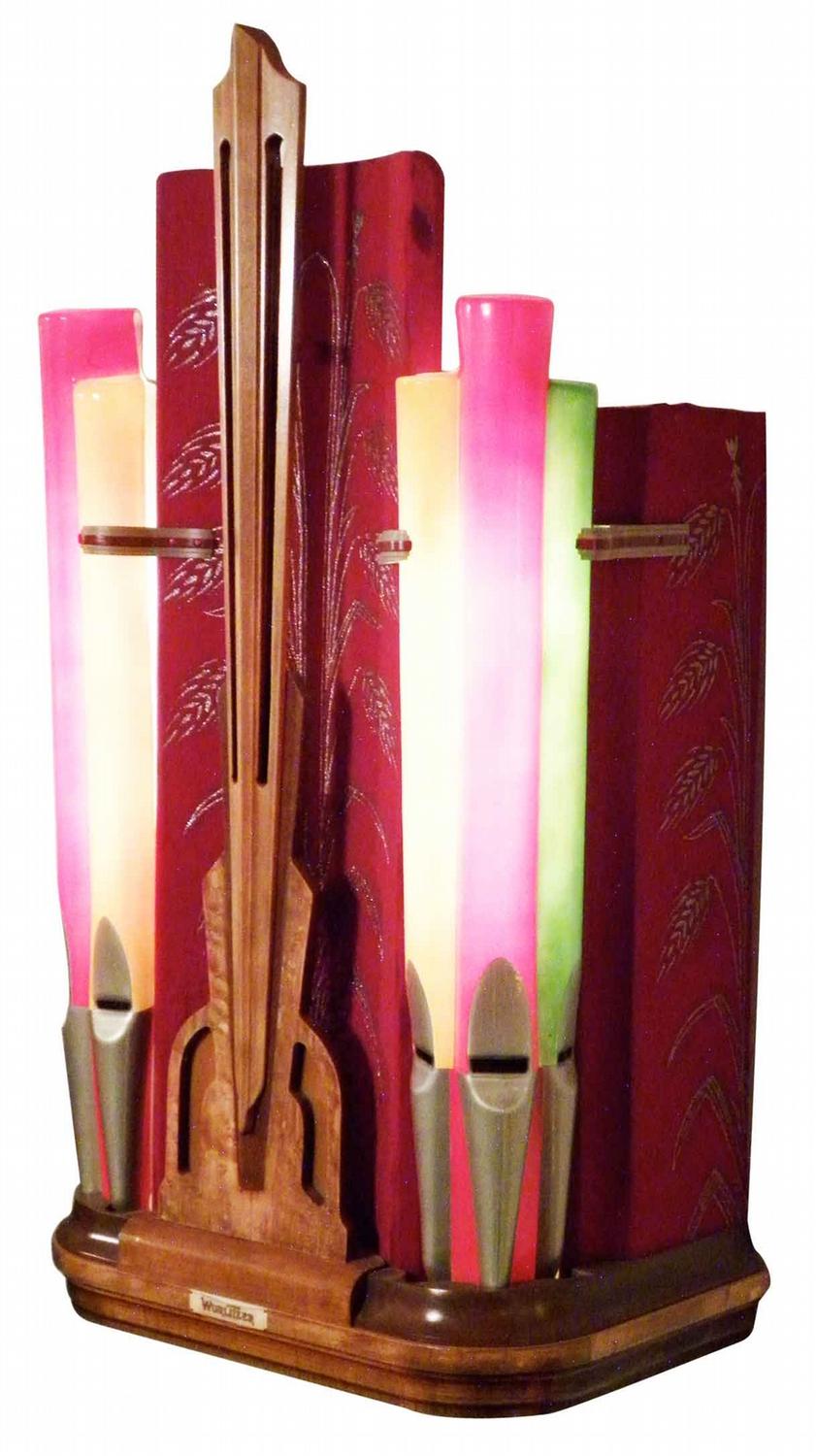 Wurlitzer Juke Box Accessory Speaker w/o selection box. Model 420 with brightly painted pilasters. Reproduction out of production. 23 X 42 1/2 X 13 inches.