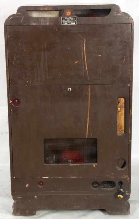 Wurlitzer Model 600 Jukebox – 1938. Beautiful walnut veneered case with nickel straps and scrolling grill piece centered with 5 green tubes, includes red and deep yellow plastics; the model 600 was one of the first to include colorful rotating cylinders and a keyboard style selector, also has a round indicator with green and red lights indicating the selected tune number. Has 24 selections, accepts nickels, dimes and quarters. Signed on a metal tag on the back with model number 600 and serial number 712028. Good working condition. 54 in. high x 31 in. wide x 25 in. deep.