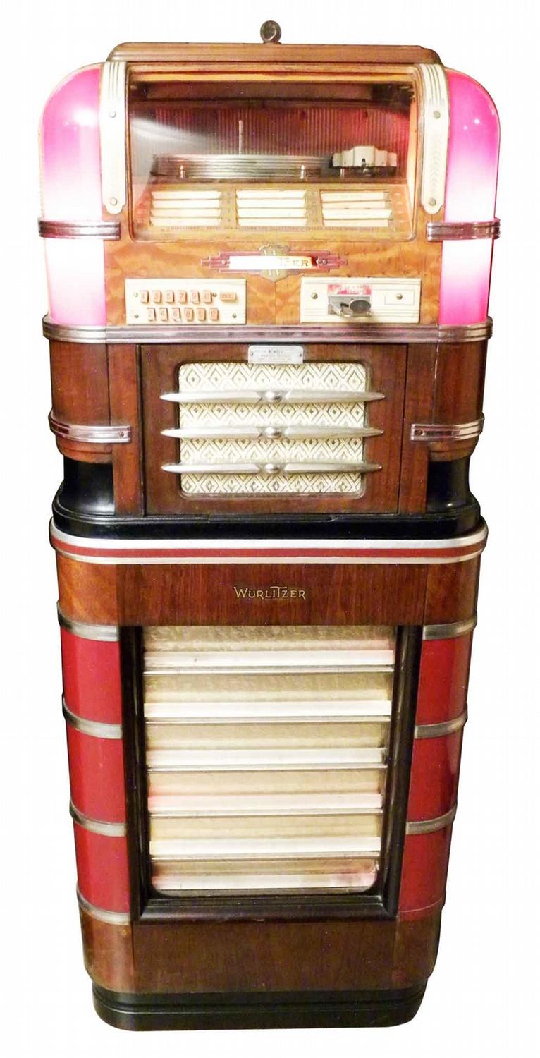 Wurlitzer Model 61 Juke Box, 1939. Counter top model. 12 selection, 5 cent play. Quilted maple and California walnut cabinet with ebony base. Illuminated plastic corners. Comes with reproduction lighted stand. Excellent working condition with older restoration. Comes with key. 21 1/2 X 22 X 18 inches. (21 1/2 X 56 X 18)