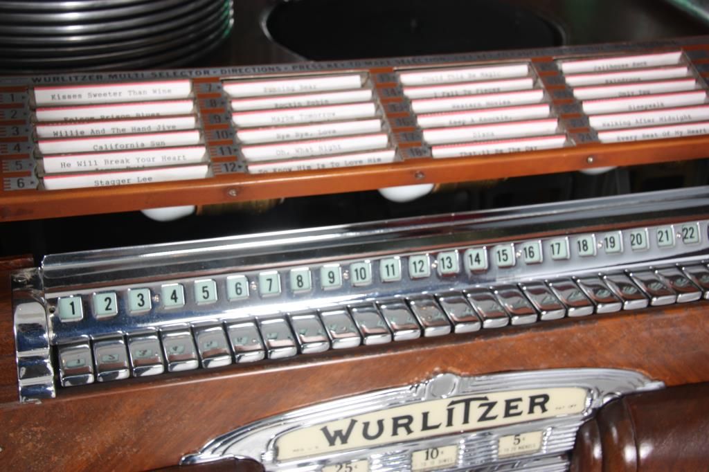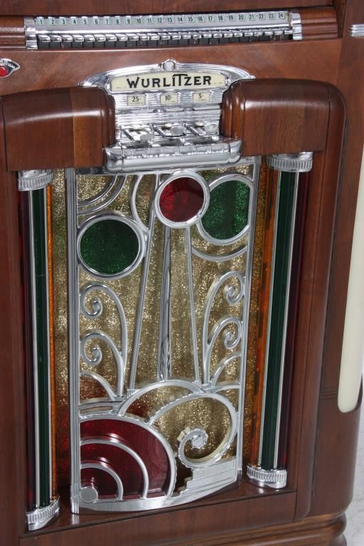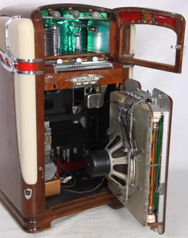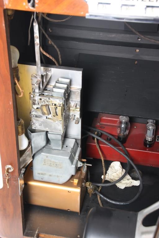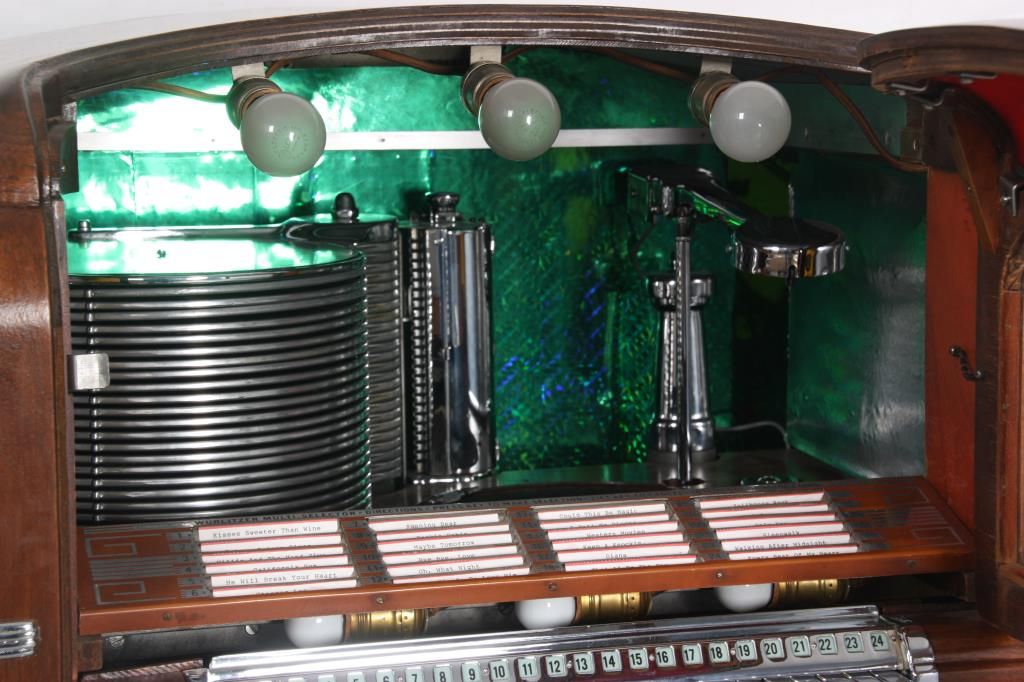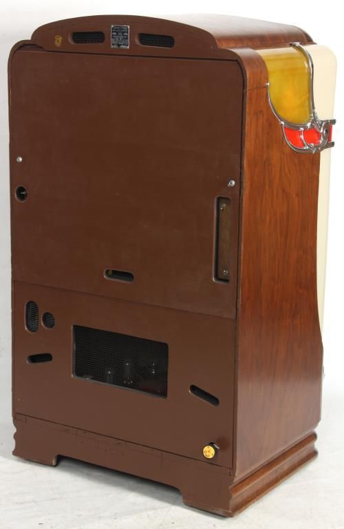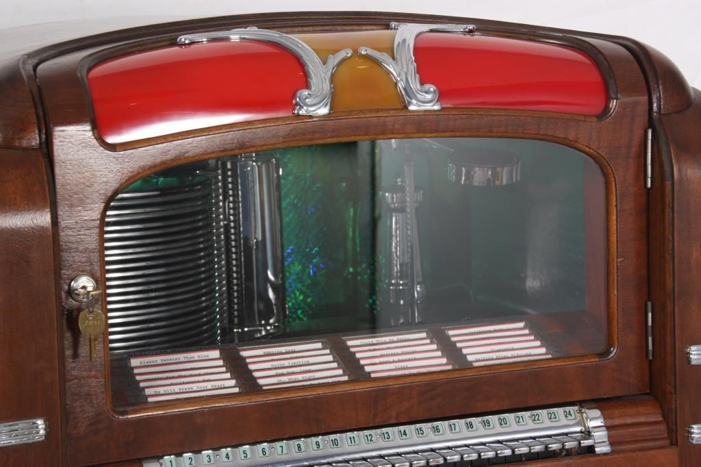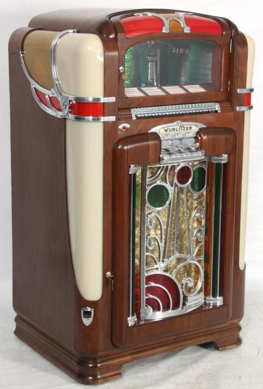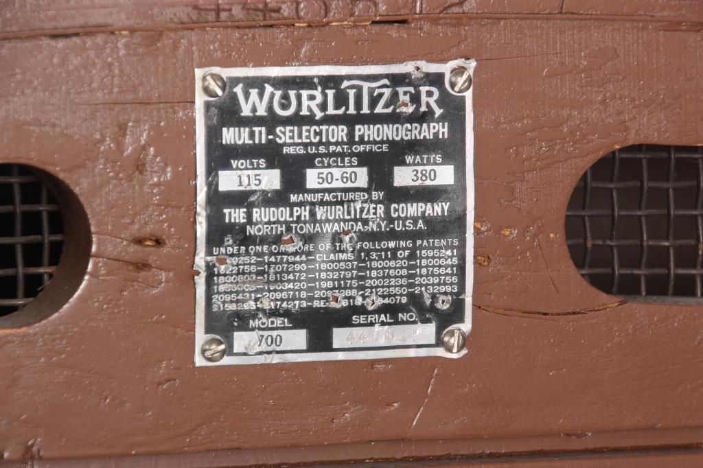 Wurlitzer Model 700 Jukebox – 1940. This floor model Jukebox has a rectangular form with wood veneer on the sides and framing the front, curved yellow and red plastics on the corners and on the crest; has chromed escutcheons and the front center of the door has a chromed grill with red and green plastic inserts on a gold glittered background in front of the speaker and 3 tube red, green and yellow colored pilasters on the corners of the door. Nicely restored, signed on a metal tag on the back with model number 700 and matching serial number 446512. Good working condition. 55.5 x 32.5 in. wide x 25.5 in. deep.