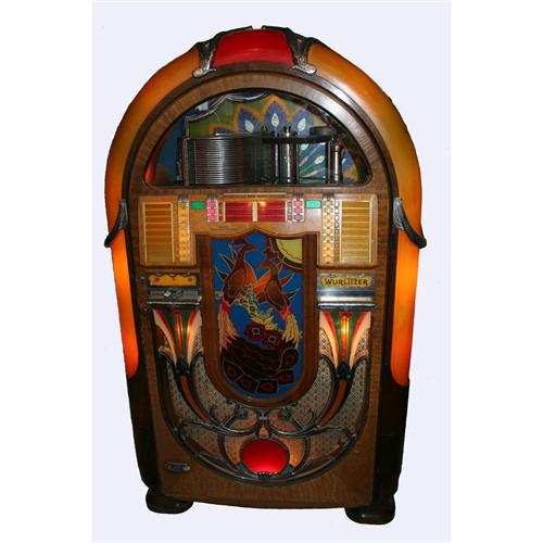 Wurlitzer Model 850 Peacock. One of the 13 Fuller Boxes of the 1940's. Often referred to as the King of Jukeboxes. A light revolves around a polarizing mechanism creating various hues of color in the tail of the peacock in the front of the machine. Complete, nice, and original unrestored model.