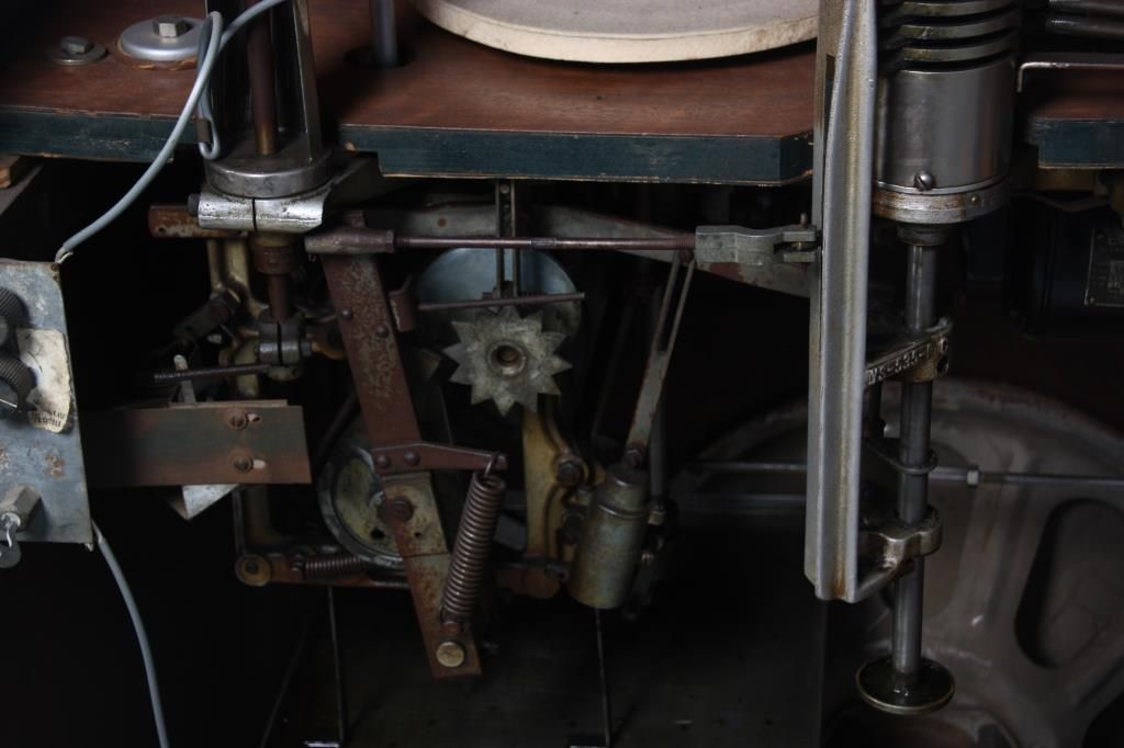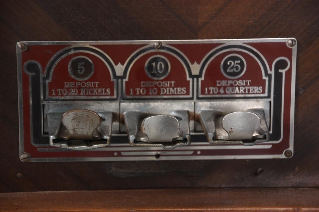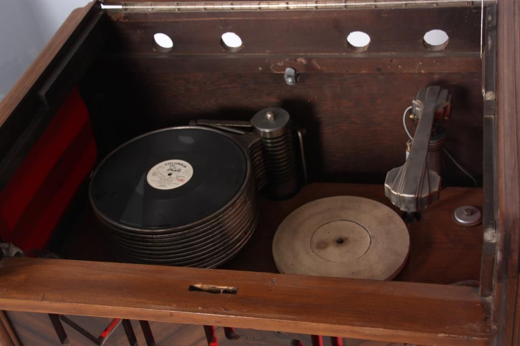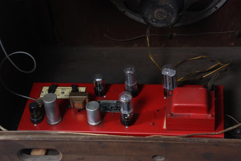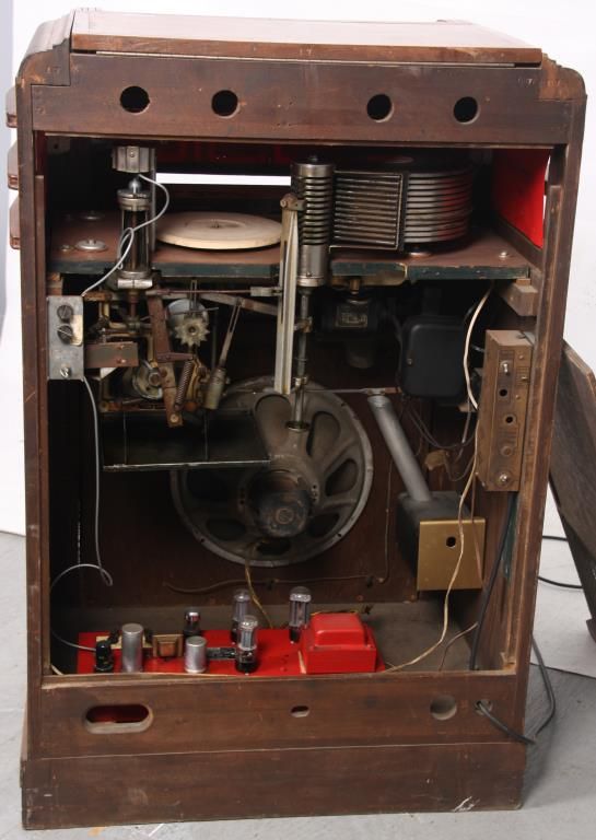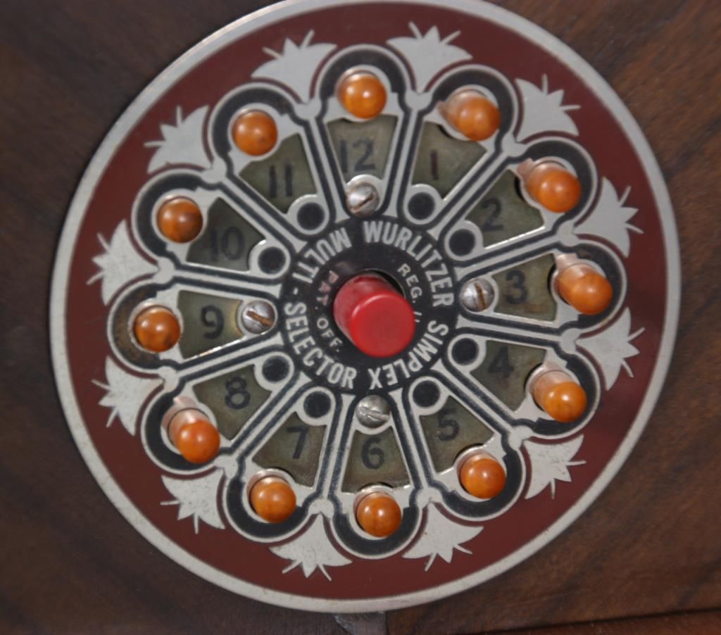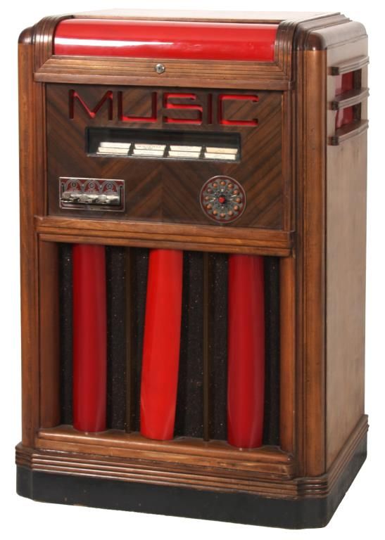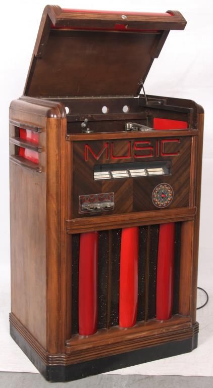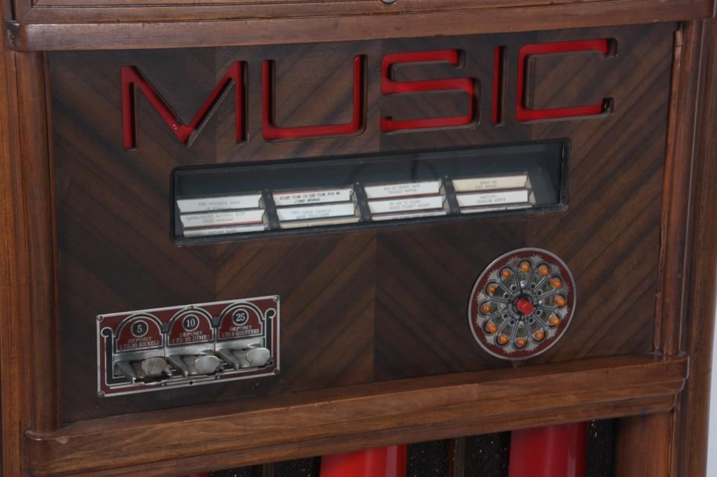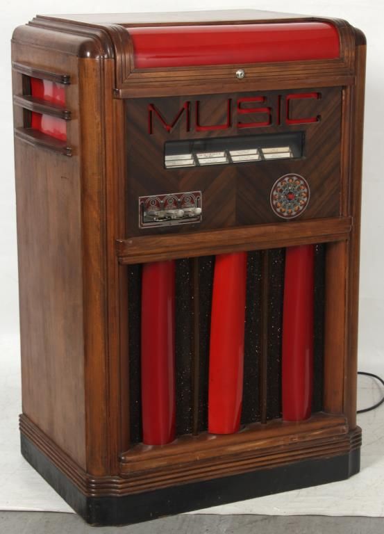 Wurlitzer Model P-12 Jukebox. Walnut veneered wood case with red plastics on the front of the crest and the sides, 3 panels in front of the speaker with glass tubes and panel above the selector with the carved word “Music”. Has a 12 song Simplex Multi-Selector and accepts nickels, dimes & quarters. Does not have the model tag with serial number on the back. Good working condition. 49 in. high x 32 in. wide x 23 in. deep.