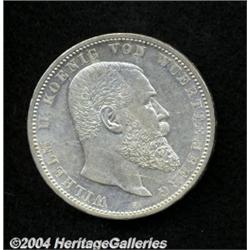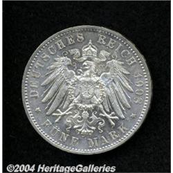 <B>Wurttemberg. 5 Mark 1908,</B></I> KM632, scratches obverse, otherwise BU. <BR><BR><B>Important notice:</B> Heritage usually auctions material at the rate of 200-250 lots per hour. On some occasions eBay Live bid software or the Internet may not be able to keep up with the pace of the auction. We recommend placing a realistic absentee bid now as insurance to avoid disappointment. Occasionally the auctioneer may eliminate or reject an eBay Live bid, and the auctioneer may also reopen a lot after the close of the eBay live bidding (usually because we missed an audience bid), and may reject your bid even if it shows you as the winning bidder. By bidding via eBay Live, you agree that Heritage may award the lot to another bidder at its sole discretion under the circumstances described above or any other reasonable circumstances. Since eBay bids are not shown to us until we open the lot on the floor, we treat those bids just like floor bids. In most cases the floor responds before the eBay bid is presented to us, due to Internet lag time, so for consistency we have made it a policy that floor bids are always considered first over tie eBay live bids. Also please note that all Heritage lots purchased through eBay Live carry a 20% Buyer's Premium. Please make sure you read the Terms and Conditions before you bid.
