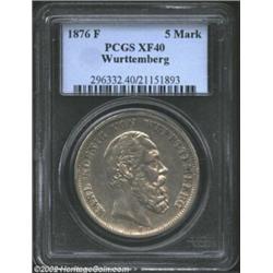 Wurttemberg. Karl 5 Marks 1876F, KM623, XF40 PCGS. A rare type in XF or better. Important notice: We expect to be auctioning lots at the rate of 200-250 per hour. Sometimes eBay Premier live bid software cannot keep up with that pace, so we strongly recommend that you place a realistic proxy bid now as insurance to avoid disappointment. Also please note that all Heritage/CAA lots purchased through eBay Premier carry a 20% Buyer's Premium. Please make sure you read the Terms and Conditions.