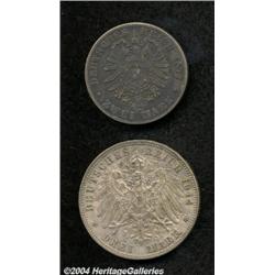 <B>Wurttemberg. Lot of Two Coins,</B></I> KM626 2 Mark 1877 darkly toned VF and KM635 3 Mark 1914 lightly toned AU. 2 coins <BR><BR><B>Important notice:</B> Heritage usually auctions material at the rate of 200-250 lots per hour. On some occasions eBay Live bid software or the Internet may not be able to keep up with the pace of the auction. We recommend placing a realistic absentee bid now as insurance to avoid disappointment. Occasionally the auctioneer may eliminate or reject an eBay Live bid, and the auctioneer may also reopen a lot after the close of the eBay live bidding (usually because we missed an audience bid), and may reject your bid even if it shows you as the winning bidder. By bidding via eBay Live, you agree that Heritage may award the lot to another bidder at its sole discretion under the circumstances described above or any other reasonable circumstances. Since eBay bids are not shown to us until we open the lot on the floor, we treat those bids just like floor bids. In most cases the floor responds before the eBay bid is presented to us, due to Internet lag time, so for consistency we have made it a policy that floor bids are always considered first over tie eBay live bids. Also please note that all Heritage lots purchased through eBay Live carry a 20% Buyer's Premium. Please make sure you read the Terms and Conditions before you bid.