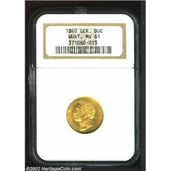 Wurttemberg. Wilhelm Gold Trade Ducat 1840AD, KM587, MS61 NGC. The first-year issue of this very scarce type. The luster is full and the strike nice with light abrasions that define the grade. Important notice: We expect to be auctioning lots at the rate of 200-250 per hour. Sometimes eBay Premier live bid software cannot keep up with that pace, so we strongly recommend that you place a realistic proxy bid now as insurance to avoid disappointment. Also please note that all Heritage/CAA lots purchased through eBay Premier carry a 20% Buyer's Premium. Please make sure you read the Terms and Conditions.