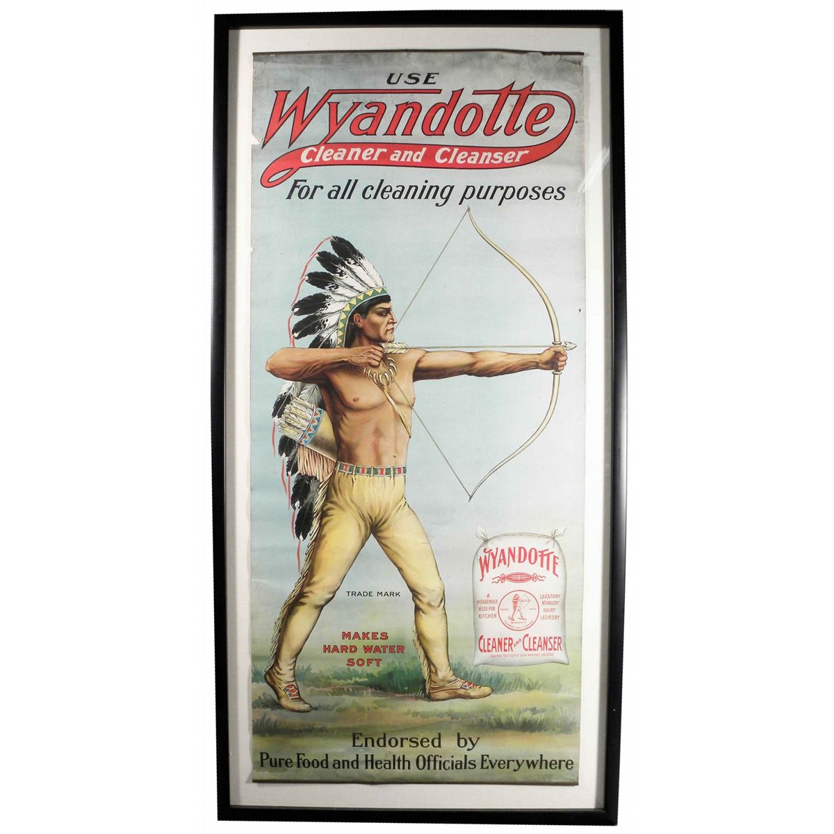Wyandotte Cleaner & Cleanser Paper Sign. Original bands top and bottom. Framed under glass. Some wrinkles, tear at top and paper loss otherwise good condition. 18 X 40 inches image only.