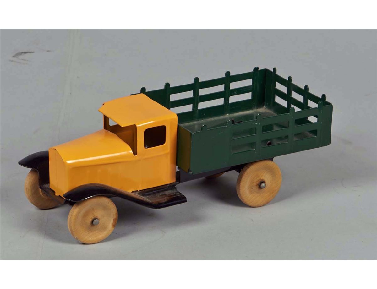 Yellow cab with green stake bed, and wood wheels. Condition (Restored). Size 9-1/2" L.